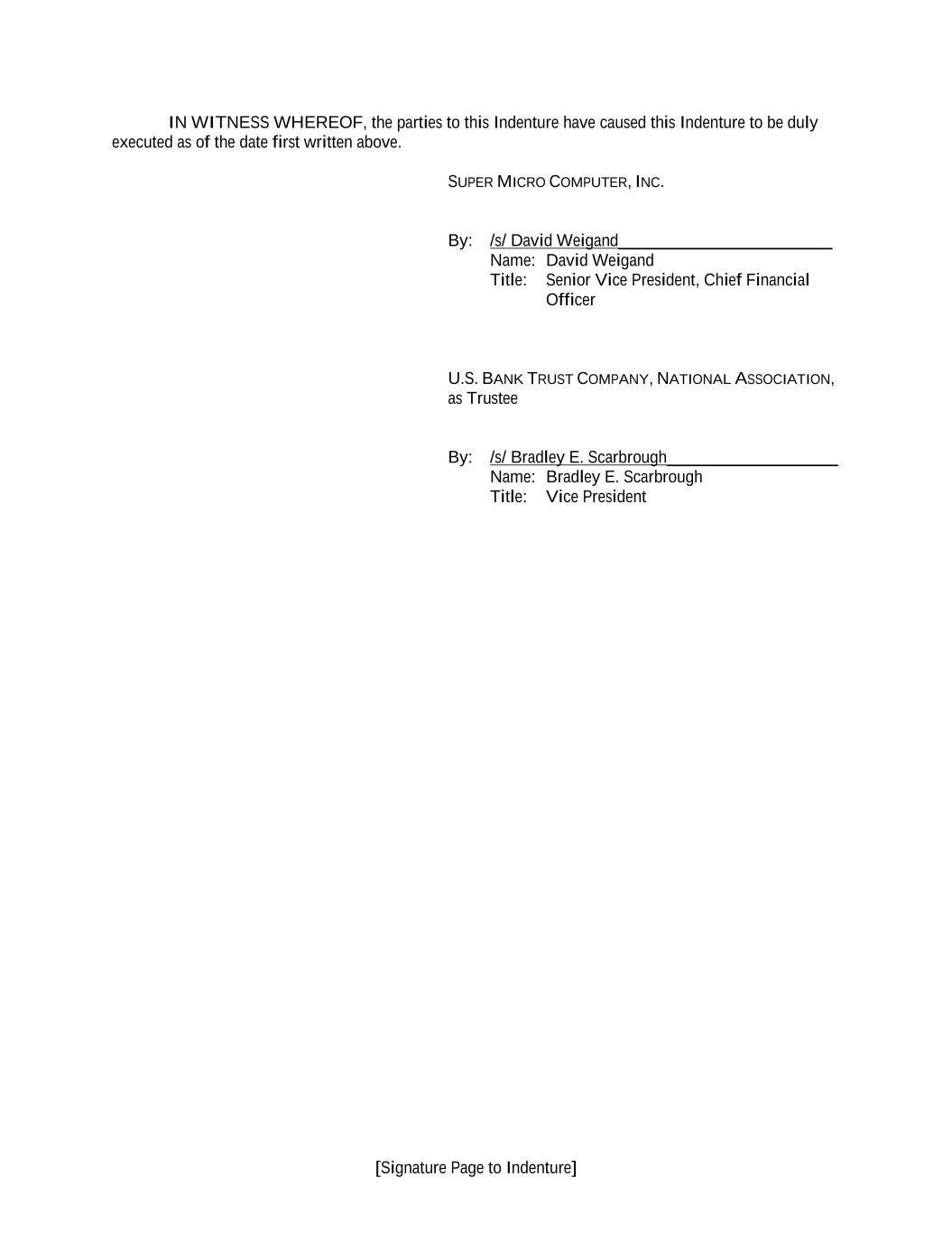 [Signature Page to Indenture] IN WITNESS WHEREOF, the parties to this Indenture have caused this Indenture to be duly executed as of the date first written above. SUPER MICRO COMPUTER, INC. By: /s/ David Weigand_________________________ Name: David Weigand Title: Senior Vice President, Chief Financial Officer U.S. BANK TRUST COMPANY, NATIONAL ASSOCIATION, as Trustee By: /s/ Bradley E. Scarbrough____________________ Name: Bradley E. Scarbrough Title: Vice President
