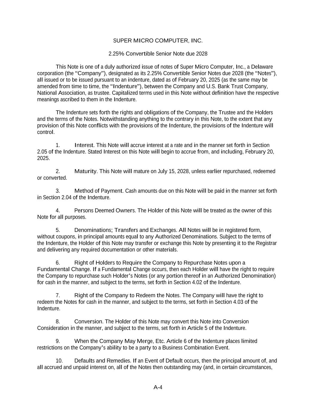 A-4 SUPER MICRO COMPUTER, INC. 2.25% Convertible Senior Note due 2028 This Note is one of a duly authorized issue of notes of Super Micro Computer, Inc., a Delaware corporation (the “Company”), designated as its 2.25% Convertible Senior Notes due 2028 (the “Notes”), all issued or to be issued pursuant to an indenture, dated as of February 20, 2025 (as the same may be amended from time to time, the “Indenture”), between the Company and U.S. Bank Trust Company, National Association, as trustee. Capitalized terms used in this Note without definition have the respective meanings ascribed to them in the Indenture. The Indenture sets forth the rights and obligations of the Company, the Trustee and the Holders and the terms of the Notes. Notwithstanding anything to the contrary in this Note, to the extent that any provision of this Note conflicts with the provisions of the Indenture, the provisions of the Indenture will control. 1. Interest. This Note will accrue interest at a rate and in the manner set forth in Section 2.05 of the Indenture. Stated Interest on this Note will begin to accrue from, and including, February 20, 2025. 2. Maturity. This Note will mature on July 15, 2028, unless earlier repurchased, redeemed or converted. 3. Method of Payment. Cash amounts due on this Note will be paid in the manner set forth in Section 2.04 of the Indenture. 4. Persons Deemed Owners. The Holder of this Note will be treated as the owner of this Note for all purposes. 5. Denominations; Transfers and Exchanges. All Notes will be in registered form, without coupons, in principal amounts equal to any Authorized Denominations. Subject to the terms of the Indenture, the Holder of this Note may transfer or exchange this Note by presenting it to the Registrar and delivering any required documentation or other materials. 6. Right of Holders to Require the Company to Repurchase Notes upon a Fundamental Change. If a Fundamental Change occurs, then each Holder will have the right to require the Company to repurchase such Holder’s Notes (or any portion thereof in an Authorized Denomination) for cash in the manner, and subject to the terms, set forth in Section 4.02 of the Indenture. 7. Right of the Company to Redeem the Notes. The Company will have the right to redeem the Notes for cash in the manner, and subject to the terms, set forth in Section 4.03 of the Indenture. 8. Conversion. The Holder of this Note may convert this Note into Conversion Consideration in the manner, and subject to the terms, set forth in Article 5 of the Indenture. 9. When the Company May Merge, Etc. Article 6 of the Indenture places limited restrictions on the Company’s ability to be a party to a Business Combination Event. 10. Defaults and Remedies. If an Event of Default occurs, then the principal amount of, and all accrued and unpaid interest on, all of the Notes then outstanding may (and, in certain circumstances,