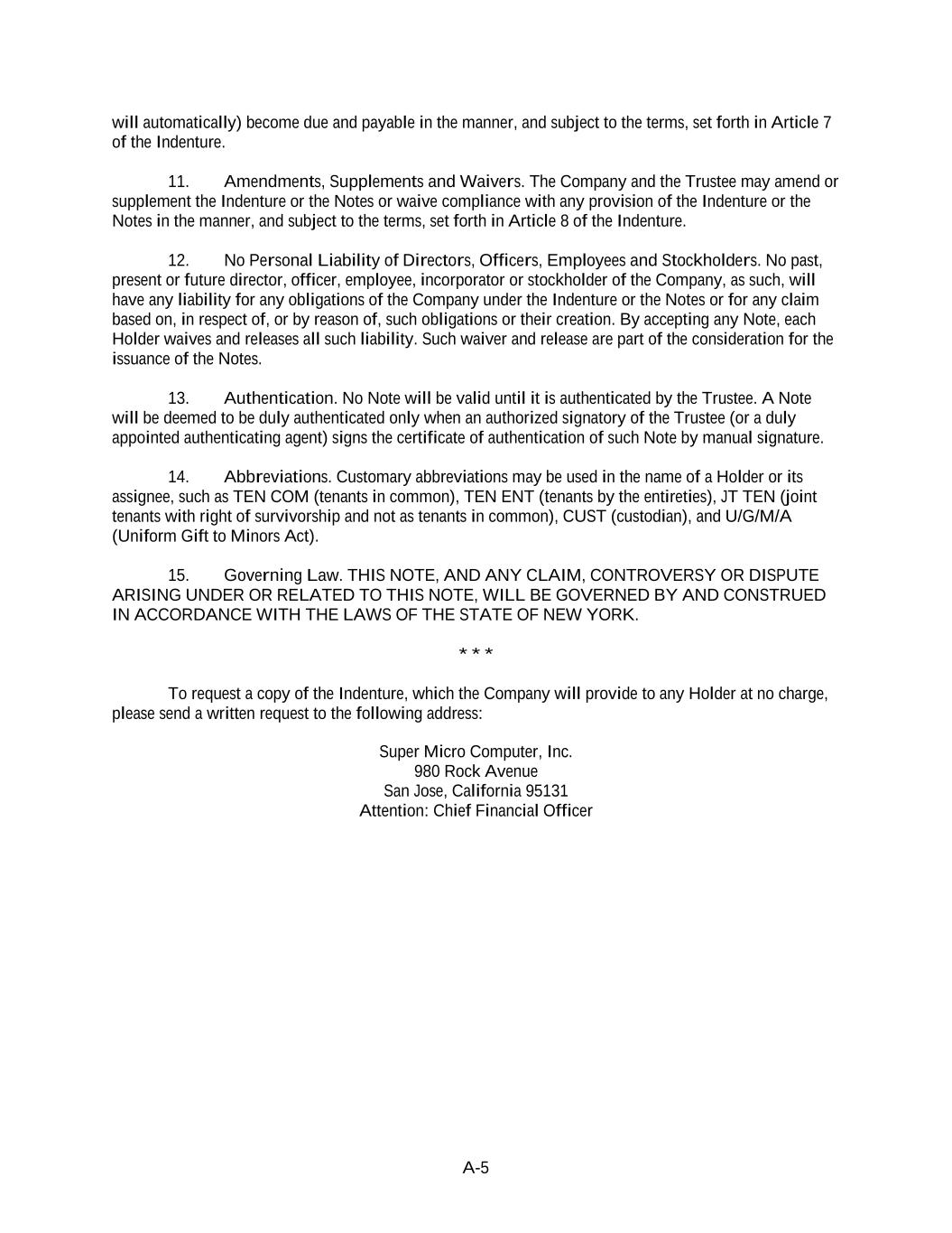 A-5 will automatically) become due and payable in the manner, and subject to the terms, set forth in Article 7 of the Indenture. 11. Amendments, Supplements and Waivers. The Company and the Trustee may amend or supplement the Indenture or the Notes or waive compliance with any provision of the Indenture or the Notes in the manner, and subject to the terms, set forth in Article 8 of the Indenture. 12. No Personal Liability of Directors, Officers, Employees and Stockholders. No past, present or future director, officer, employee, incorporator or stockholder of the Company, as such, will have any liability for any obligations of the Company under the Indenture or the Notes or for any claim based on, in respect of, or by reason of, such obligations or their creation. By accepting any Note, each Holder waives and releases all such liability. Such waiver and release are part of the consideration for the issuance of the Notes. 13. Authentication. No Note will be valid until it is authenticated by the Trustee. A Note will be deemed to be duly authenticated only when an authorized signatory of the Trustee (or a duly appointed authenticating agent) signs the certificate of authentication of such Note by manual signature. 14. Abbreviations. Customary abbreviations may be used in the name of a Holder or its assignee, such as TEN COM (tenants in common), TEN ENT (tenants by the entireties), JT TEN (joint tenants with right of survivorship and not as tenants in common), CUST (custodian), and U/G/M/A (Uniform Gift to Minors Act). 15. Governing Law. THIS NOTE, AND ANY CLAIM, CONTROVERSY OR DISPUTE ARISING UNDER OR RELATED TO THIS NOTE, WILL BE GOVERNED BY AND CONSTRUED IN ACCORDANCE WITH THE LAWS OF THE STATE OF NEW YORK. * * * To request a copy of the Indenture, which the Company will provide to any Holder at no charge, please send a written request to the following address: Super Micro Computer, Inc. 980 Rock Avenue San Jose, California 95131 Attention: Chief Financial Officer