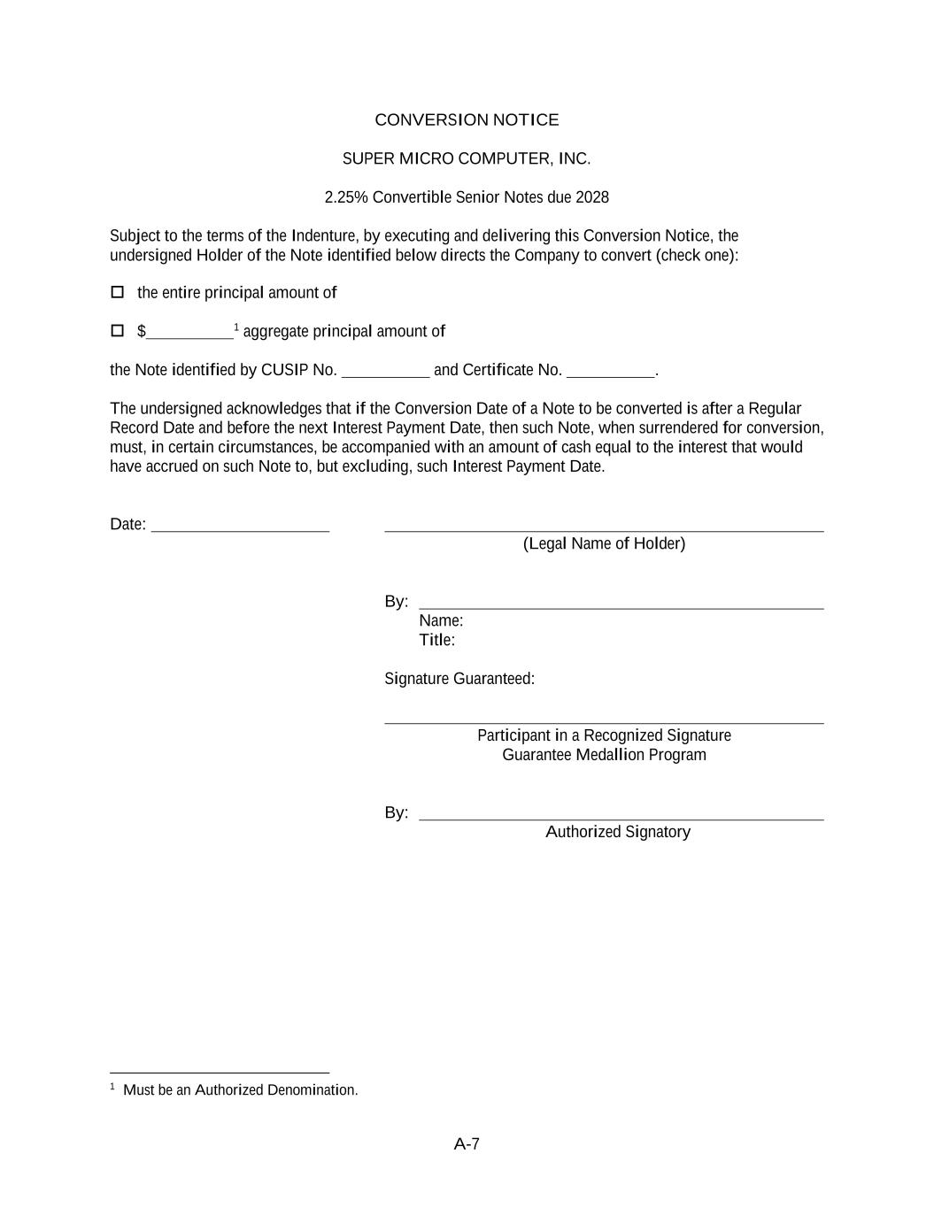 A-7 CONVERSION NOTICE SUPER MICRO COMPUTER, INC. 2.25% Convertible Senior Notes due 2028 Subject to the terms of the Indenture, by executing and delivering this Conversion Notice, the undersigned Holder of the Note identified below directs the Company to convert (check one):  the entire principal amount of  $ 1 aggregate principal amount of the Note identified by CUSIP No. and Certificate No. . The undersigned acknowledges that if the Conversion Date of a Note to be converted is after a Regular Record Date and before the next Interest Payment Date, then such Note, when surrendered for conversion, must, in certain circumstances, be accompanied with an amount of cash equal to the interest that would have accrued on such Note to, but excluding, such Interest Payment Date. Date: (Legal Name of Holder) By: Name: Title: Signature Guaranteed: Participant in a Recognized Signature Guarantee Medallion Program By: Authorized Signatory 1 Must be an Authorized Denomination.