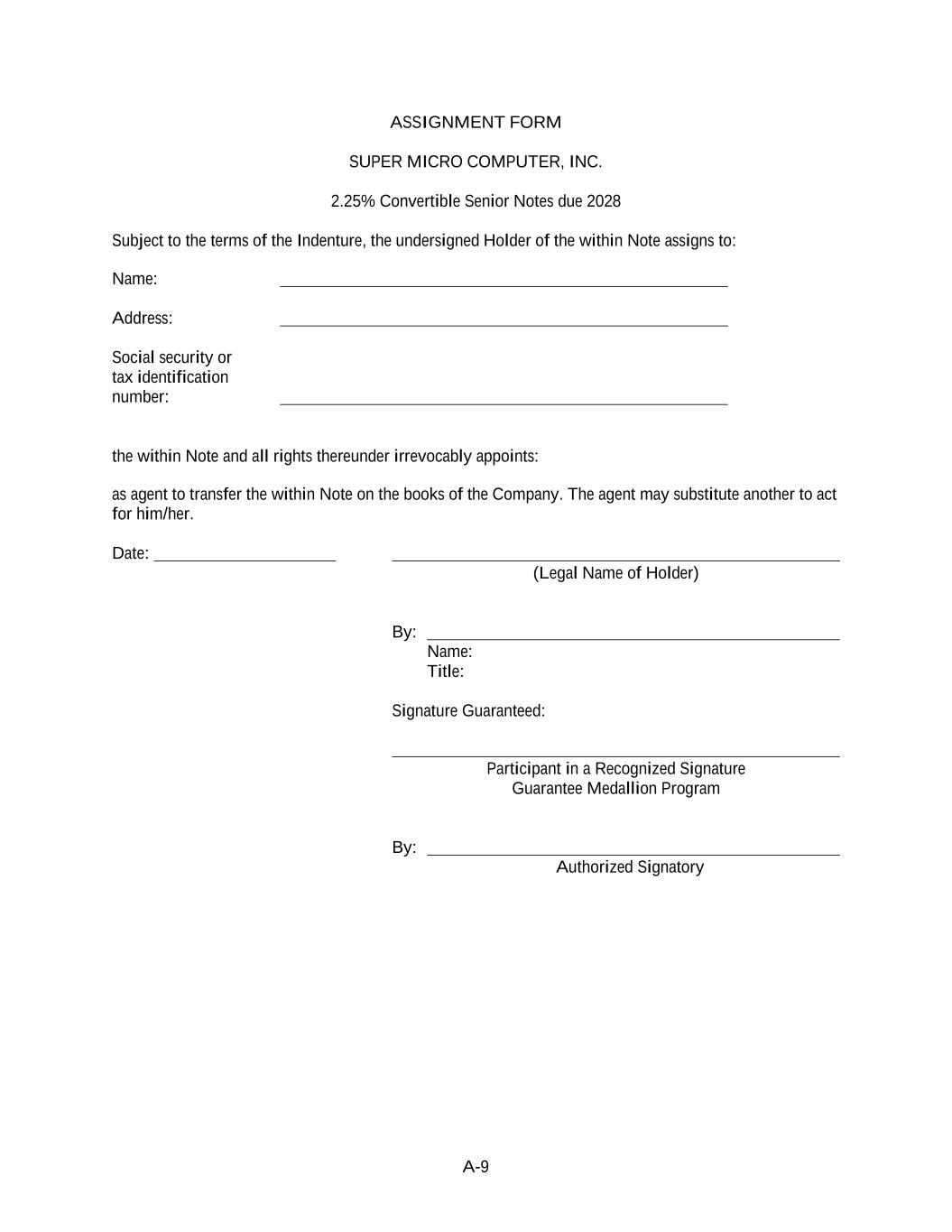 A-9 ASSIGNMENT FORM SUPER MICRO COMPUTER, INC. 2.25% Convertible Senior Notes due 2028 Subject to the terms of the Indenture, the undersigned Holder of the within Note assigns to: Name: Address: Social security or tax identification number: the within Note and all rights thereunder irrevocably appoints: as agent to transfer the within Note on the books of the Company. The agent may substitute another to act for him/her. Date: (Legal Name of Holder) By: Name: Title: Signature Guaranteed: Participant in a Recognized Signature Guarantee Medallion Program By: Authorized Signatory