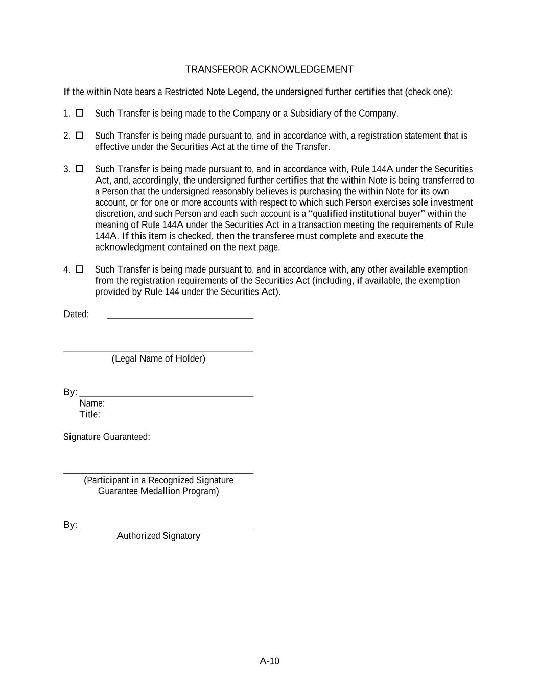 A-10 TRANSFEROR ACKNOWLEDGEMENT If the within Note bears a Restricted Note Legend, the undersigned further certifies that (check one): 1.  Such Transfer is being made to the Company or a Subsidiary of the Company. 2.  Such Transfer is being made pursuant to, and in accordance with, a registration statement that is effective under the Securities Act at the time of the Transfer. 3.  Such Transfer is being made pursuant to, and in accordance with, Rule 144A under the Securities Act, and, accordingly, the undersigned further certifies that the within Note is being transferred to a Person that the undersigned reasonably believes is purchasing the within Note for its own account, or for one or more accounts with respect to which such Person exercises sole investment discretion, and such Person and each such account is a “qualified institutional buyer” within the meaning of Rule 144A under the Securities Act in a transaction meeting the requirements of Rule 144A. If this item is checked, then the transferee must complete and execute the acknowledgment contained on the next page. 4.  Such Transfer is being made pursuant to, and in accordance with, any other available exemption from the registration requirements of the Securities Act (including, if available, the exemption provided by Rule 144 under the Securities Act). Dated: (Legal Name of Holder) By: Name: Title: Signature Guaranteed: (Participant in a Recognized Signature Guarantee Medallion Program) By: Authorized Signatory