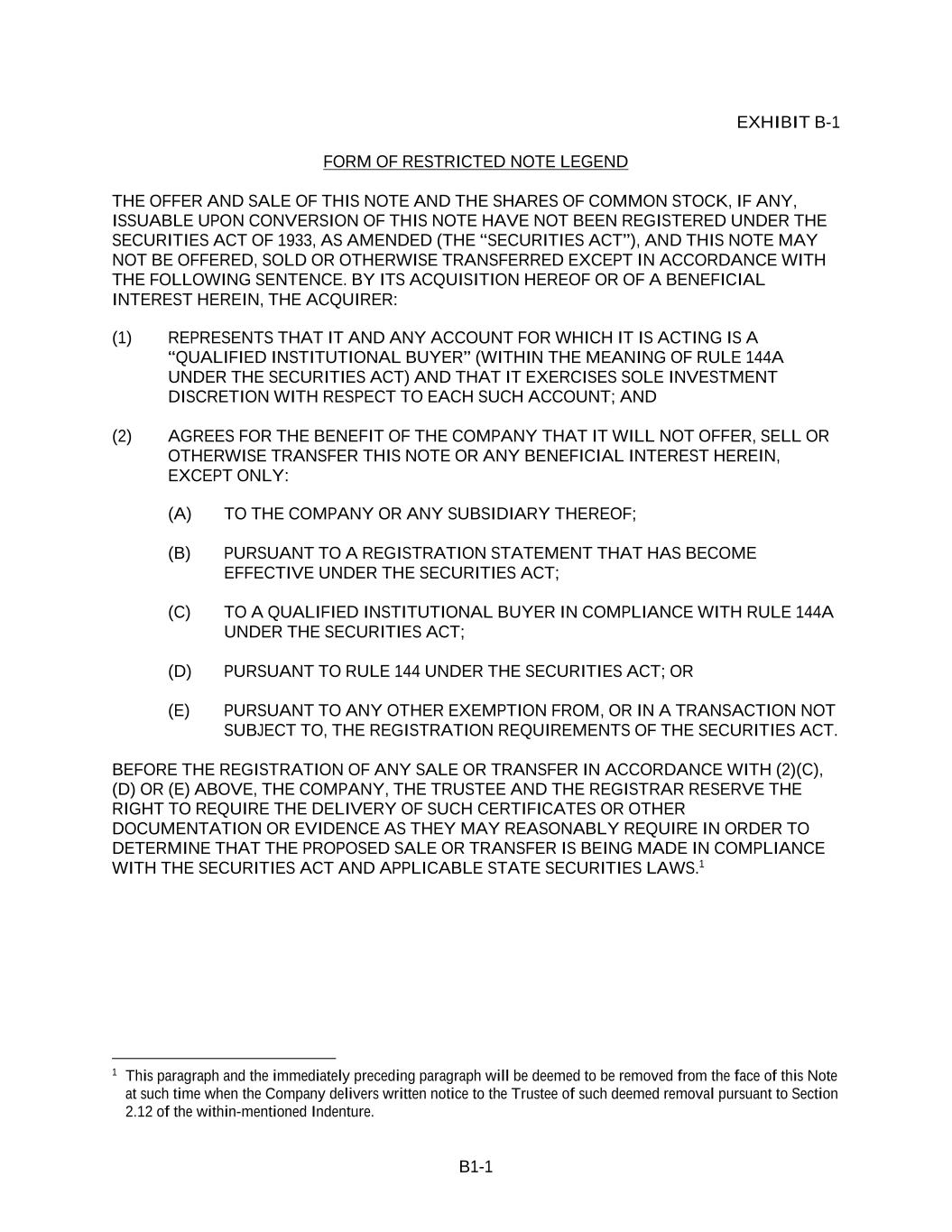 B1-1 EXHIBIT B-1 FORM OF RESTRICTED NOTE LEGEND THE OFFER AND SALE OF THIS NOTE AND THE SHARES OF COMMON STOCK, IF ANY, ISSUABLE UPON CONVERSION OF THIS NOTE HAVE NOT BEEN REGISTERED UNDER THE SECURITIES ACT OF 1933, AS AMENDED (THE “SECURITIES ACT”), AND THIS NOTE MAY NOT BE OFFERED, SOLD OR OTHERWISE TRANSFERRED EXCEPT IN ACCORDANCE WITH THE FOLLOWING SENTENCE. BY ITS ACQUISITION HEREOF OR OF A BENEFICIAL INTEREST HEREIN, THE ACQUIRER: (1) REPRESENTS THAT IT AND ANY ACCOUNT FOR WHICH IT IS ACTING IS A “QUALIFIED INSTITUTIONAL BUYER” (WITHIN THE MEANING OF RULE 144A UNDER THE SECURITIES ACT) AND THAT IT EXERCISES SOLE INVESTMENT DISCRETION WITH RESPECT TO EACH SUCH ACCOUNT; AND (2) AGREES FOR THE BENEFIT OF THE COMPANY THAT IT WILL NOT OFFER, SELL OR OTHERWISE TRANSFER THIS NOTE OR ANY BENEFICIAL INTEREST HEREIN, EXCEPT ONLY: (A) TO THE COMPANY OR ANY SUBSIDIARY THEREOF; (B) PURSUANT TO A REGISTRATION STATEMENT THAT HAS BECOME EFFECTIVE UNDER THE SECURITIES ACT; (C) TO A QUALIFIED INSTITUTIONAL BUYER IN COMPLIANCE WITH RULE 144A UNDER THE SECURITIES ACT; (D) PURSUANT TO RULE 144 UNDER THE SECURITIES ACT; OR (E) PURSUANT TO ANY OTHER EXEMPTION FROM, OR IN A TRANSACTION NOT SUBJECT TO, THE REGISTRATION REQUIREMENTS OF THE SECURITIES ACT. BEFORE THE REGISTRATION OF ANY SALE OR TRANSFER IN ACCORDANCE WITH (2)(C), (D) OR (E) ABOVE, THE COMPANY, THE TRUSTEE AND THE REGISTRAR RESERVE THE RIGHT TO REQUIRE THE DELIVERY OF SUCH CERTIFICATES OR OTHER DOCUMENTATION OR EVIDENCE AS THEY MAY REASONABLY REQUIRE IN ORDER TO DETERMINE THAT THE PROPOSED SALE OR TRANSFER IS BEING MADE IN COMPLIANCE WITH THE SECURITIES ACT AND APPLICABLE STATE SECURITIES LAWS.1 1 This paragraph and the immediately preceding paragraph will be deemed to be removed from the face of this Note at such time when the Company delivers written notice to the Trustee of such deemed removal pursuant to Section 2.12 of the within-mentioned Indenture.