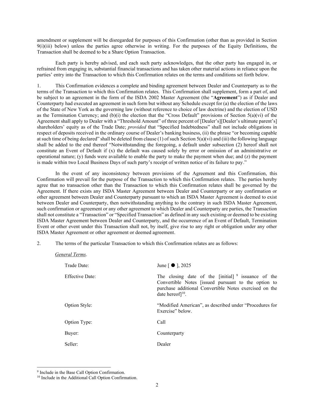 2 amendment or supplement will be disregarded for purposes of this Confirmation (other than as provided in Section 9(i)(iii) below) unless the parties agree otherwise in writing. For the purposes of the Equity Definitions, the Transaction shall be deemed to be a Share Option Transaction. Each party is hereby advised, and each such party acknowledges, that the other party has engaged in, or refrained from engaging in, substantial financial transactions and has taken other material actions in reliance upon the parties’ entry into the Transaction to which this Confirmation relates on the terms and conditions set forth below. 1. This Confirmation evidences a complete and binding agreement between Dealer and Counterparty as to the terms of the Transaction to which this Confirmation relates. This Confirmation shall supplement, form a part of, and be subject to an agreement in the form of the ISDA 2002 Master Agreement (the “Agreement”) as if Dealer and Counterparty had executed an agreement in such form but without any Schedule except for (a) the election of the laws of the State of New York as the governing law (without reference to choice of law doctrine) and the election of USD as the Termination Currency; and (b)(i) the election that the “Cross Default” provisions of Section 5(a)(vi) of the Agreement shall apply to Dealer with a “Threshold Amount” of three percent of [Dealer’s][Dealer’s ultimate parent’s] shareholders’ equity as of the Trade Date; provided that “Specified Indebtedness” shall not include obligations in respect of deposits received in the ordinary course of Dealer’s banking business, (ii) the phrase “or becoming capable at such time of being declared” shall be deleted from clause (1) of such Section 5(a)(vi) and (iii) the following language shall be added to the end thereof “Notwithstanding the foregoing, a default under subsection (2) hereof shall not constitute an Event of Default if (x) the default was caused solely by error or omission of an administrative or operational nature; (y) funds were available to enable the party to make the payment when due; and (z) the payment is made within two Local Business Days of such party’s receipt of written notice of its failure to pay.” In the event of any inconsistency between provisions of the Agreement and this Confirmation, this Confirmation will prevail for the purpose of the Transaction to which this Confirmation relates. The parties hereby agree that no transaction other than the Transaction to which this Confirmation relates shall be governed by the Agreement. If there exists any ISDA Master Agreement between Dealer and Counterparty or any confirmation or other agreement between Dealer and Counterparty pursuant to which an ISDA Master Agreement is deemed to exist between Dealer and Counterparty, then notwithstanding anything to the contrary in such ISDA Master Agreement, such confirmation or agreement or any other agreement to which Dealer and Counterparty are parties, the Transaction shall not constitute a “Transaction” or “Specified Transaction” as defined in any such existing or deemed to be existing ISDA Master Agreement between Dealer and Counterparty, and the occurrence of an Event of Default, Termination Event or other event under this Transaction shall not, by itself, give rise to any right or obligation under any other ISDA Master Agreement or other agreement or deemed agreement. 2. The terms of the particular Transaction to which this Confirmation relates are as follows: General Terms. Trade Date: June [  ], 2025 Effective Date: The closing date of the [initial] 9 issuance of the Convertible Notes [issued pursuant to the option to purchase additional Convertible Notes exercised on the date hereof]10. Option Style: “Modified American”, as described under “Procedures for Exercise” below. Option Type: Call Buyer: Counterparty Seller: Dealer 9 Include in the Base Call Option Confirmation. 10 Include in the Additional Call Option Confirmation.