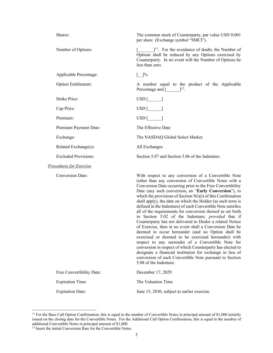 3 Shares: The common stock of Counterparty, par value USD 0.001 per share (Exchange symbol “SMCI”). Number of Options: [_______]11. For the avoidance of doubt, the Number of Options shall be reduced by any Options exercised by Counterparty. In no event will the Number of Options be less than zero. Applicable Percentage: [__]% Option Entitlement: A number equal to the product of the Applicable Percentage and [______]12. Strike Price: USD [______] Cap Price: USD [______] Premium: USD [______] Premium Payment Date: The Effective Date Exchange: The NASDAQ Global Select Market Related Exchange(s): All Exchanges Excluded Provisions: Section 5.07 and Section 5.06 of the Indenture. Procedures for Exercise. Conversion Date: With respect to any conversion of a Convertible Note (other than any conversion of Convertible Notes with a Conversion Date occurring prior to the Free Convertibility Date (any such conversion, an “Early Conversion”), to which the provisions of Section 9(i)(i) of this Confirmation shall apply), the date on which the Holder (as such term is defined in the Indenture) of such Convertible Note satisfies all of the requirements for conversion thereof as set forth in Section 5.02 of the Indenture; provided that if Counterparty has not delivered to Dealer a related Notice of Exercise, then in no event shall a Conversion Date be deemed to occur hereunder (and no Option shall be exercised or deemed to be exercised hereunder) with respect to any surrender of a Convertible Note for conversion in respect of which Counterparty has elected to designate a financial institution for exchange in lieu of conversion of such Convertible Note pursuant to Section 5.08 of the Indenture. Free Convertibility Date: December 17, 2029 Expiration Time: The Valuation Time Expiration Date: June 15, 2030, subject to earlier exercise. 11 For the Base Call Option Confirmation, this is equal to the number of Convertible Notes in principal amount of $1,000 initially issued on the closing date for the Convertible Notes. For the Additional Call Option Confirmation, this is equal to the number of additional Convertible Notes in principal amount of $1,000. 12 Insert the initial Conversion Rate for the Convertible Notes.