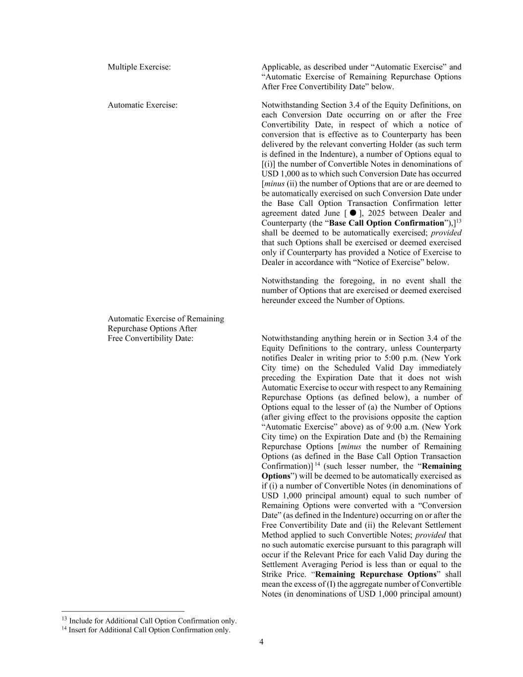 4 Multiple Exercise: Applicable, as described under “Automatic Exercise” and “Automatic Exercise of Remaining Repurchase Options After Free Convertibility Date” below. Automatic Exercise: Notwithstanding Section 3.4 of the Equity Definitions, on each Conversion Date occurring on or after the Free Convertibility Date, in respect of which a notice of conversion that is effective as to Counterparty has been delivered by the relevant converting Holder (as such term is defined in the Indenture), a number of Options equal to [(i)] the number of Convertible Notes in denominations of USD 1,000 as to which such Conversion Date has occurred [minus (ii) the number of Options that are or are deemed to be automatically exercised on such Conversion Date under the Base Call Option Transaction Confirmation letter agreement dated June [  ], 2025 between Dealer and Counterparty (the “Base Call Option Confirmation”),]13 shall be deemed to be automatically exercised; provided that such Options shall be exercised or deemed exercised only if Counterparty has provided a Notice of Exercise to Dealer in accordance with “Notice of Exercise” below. Notwithstanding the foregoing, in no event shall the number of Options that are exercised or deemed exercised hereunder exceed the Number of Options. Automatic Exercise of Remaining Repurchase Options After Free Convertibility Date: Notwithstanding anything herein or in Section 3.4 of the Equity Definitions to the contrary, unless Counterparty notifies Dealer in writing prior to 5:00 p.m. (New York City time) on the Scheduled Valid Day immediately preceding the Expiration Date that it does not wish Automatic Exercise to occur with respect to any Remaining Repurchase Options (as defined below), a number of Options equal to the lesser of (a) the Number of Options (after giving effect to the provisions opposite the caption “Automatic Exercise” above) as of 9:00 a.m. (New York City time) on the Expiration Date and (b) the Remaining Repurchase Options [minus the number of Remaining Options (as defined in the Base Call Option Transaction Confirmation)] 14 (such lesser number, the “Remaining Options”) will be deemed to be automatically exercised as if (i) a number of Convertible Notes (in denominations of USD 1,000 principal amount) equal to such number of Remaining Options were converted with a “Conversion Date” (as defined in the Indenture) occurring on or after the Free Convertibility Date and (ii) the Relevant Settlement Method applied to such Convertible Notes; provided that no such automatic exercise pursuant to this paragraph will occur if the Relevant Price for each Valid Day during the Settlement Averaging Period is less than or equal to the Strike Price. “Remaining Repurchase Options” shall mean the excess of (I) the aggregate number of Convertible Notes (in denominations of USD 1,000 principal amount) 13 Include for Additional Call Option Confirmation only. 14 Insert for Additional Call Option Confirmation only.