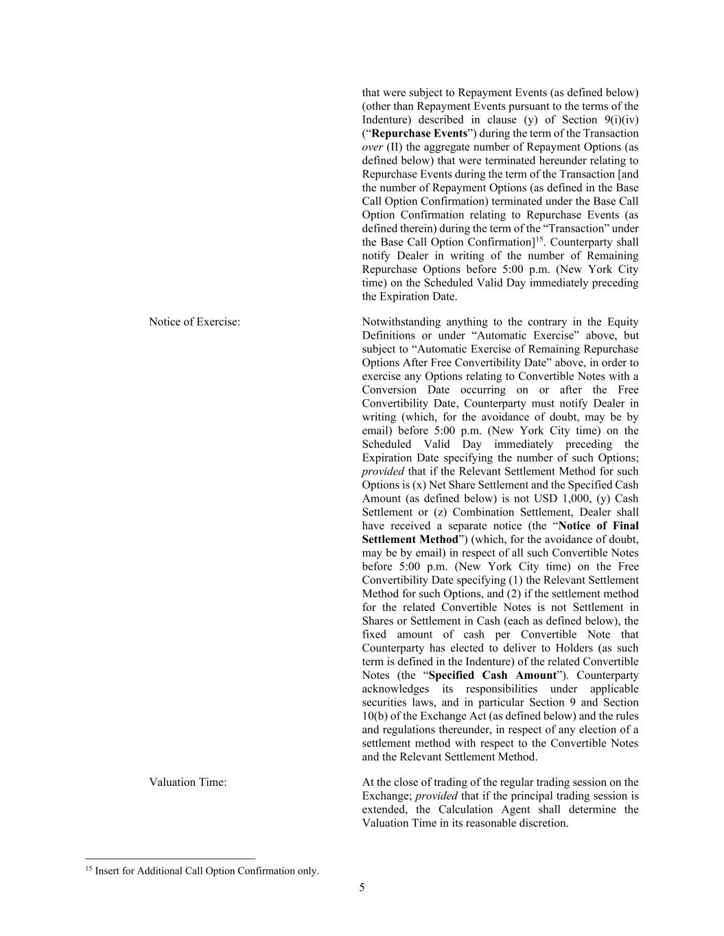 5 that were subject to Repayment Events (as defined below) (other than Repayment Events pursuant to the terms of the Indenture) described in clause (y) of Section 9(i)(iv) (“Repurchase Events”) during the term of the Transaction over (II) the aggregate number of Repayment Options (as defined below) that were terminated hereunder relating to Repurchase Events during the term of the Transaction [and the number of Repayment Options (as defined in the Base Call Option Confirmation) terminated under the Base Call Option Confirmation relating to Repurchase Events (as defined therein) during the term of the “Transaction” under the Base Call Option Confirmation]15. Counterparty shall notify Dealer in writing of the number of Remaining Repurchase Options before 5:00 p.m. (New York City time) on the Scheduled Valid Day immediately preceding the Expiration Date. Notice of Exercise: Notwithstanding anything to the contrary in the Equity Definitions or under “Automatic Exercise” above, but subject to “Automatic Exercise of Remaining Repurchase Options After Free Convertibility Date” above, in order to exercise any Options relating to Convertible Notes with a Conversion Date occurring on or after the Free Convertibility Date, Counterparty must notify Dealer in writing (which, for the avoidance of doubt, may be by email) before 5:00 p.m. (New York City time) on the Scheduled Valid Day immediately preceding the Expiration Date specifying the number of such Options; provided that if the Relevant Settlement Method for such Options is (x) Net Share Settlement and the Specified Cash Amount (as defined below) is not USD 1,000, (y) Cash Settlement or (z) Combination Settlement, Dealer shall have received a separate notice (the “Notice of Final Settlement Method”) (which, for the avoidance of doubt, may be by email) in respect of all such Convertible Notes before 5:00 p.m. (New York City time) on the Free Convertibility Date specifying (1) the Relevant Settlement Method for such Options, and (2) if the settlement method for the related Convertible Notes is not Settlement in Shares or Settlement in Cash (each as defined below), the fixed amount of cash per Convertible Note that Counterparty has elected to deliver to Holders (as such term is defined in the Indenture) of the related Convertible Notes (the “Specified Cash Amount”). Counterparty acknowledges its responsibilities under applicable securities laws, and in particular Section 9 and Section 10(b) of the Exchange Act (as defined below) and the rules and regulations thereunder, in respect of any election of a settlement method with respect to the Convertible Notes and the Relevant Settlement Method. Valuation Time: At the close of trading of the regular trading session on the Exchange; provided that if the principal trading session is extended, the Calculation Agent shall determine the Valuation Time in its reasonable discretion. 15 Insert for Additional Call Option Confirmation only.
