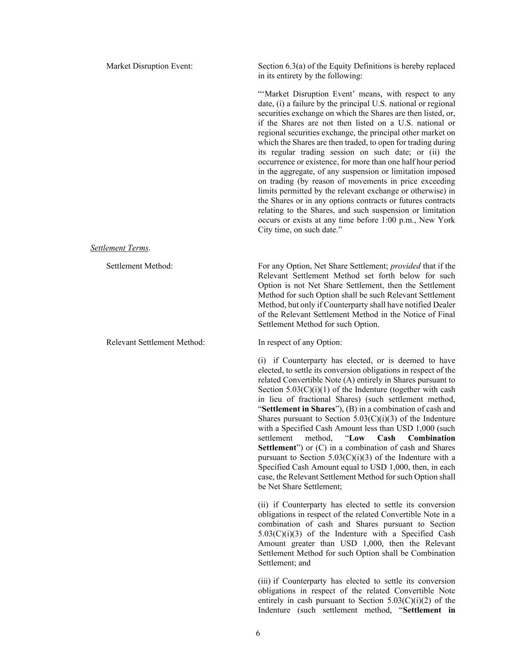 6 Market Disruption Event: Section 6.3(a) of the Equity Definitions is hereby replaced in its entirety by the following: “‘Market Disruption Event’ means, with respect to any date, (i) a failure by the principal U.S. national or regional securities exchange on which the Shares are then listed, or, if the Shares are not then listed on a U.S. national or regional securities exchange, the principal other market on which the Shares are then traded, to open for trading during its regular trading session on such date; or (ii) the occurrence or existence, for more than one half hour period in the aggregate, of any suspension or limitation imposed on trading (by reason of movements in price exceeding limits permitted by the relevant exchange or otherwise) in the Shares or in any options contracts or futures contracts relating to the Shares, and such suspension or limitation occurs or exists at any time before 1:00 p.m., New York City time, on such date.” Settlement Terms. Settlement Method: For any Option, Net Share Settlement; provided that if the Relevant Settlement Method set forth below for such Option is not Net Share Settlement, then the Settlement Method for such Option shall be such Relevant Settlement Method, but only if Counterparty shall have notified Dealer of the Relevant Settlement Method in the Notice of Final Settlement Method for such Option. Relevant Settlement Method: In respect of any Option: (i) if Counterparty has elected, or is deemed to have elected, to settle its conversion obligations in respect of the related Convertible Note (A) entirely in Shares pursuant to Section 5.03(C)(i)(1) of the Indenture (together with cash in lieu of fractional Shares) (such settlement method, “Settlement in Shares”), (B) in a combination of cash and Shares pursuant to Section 5.03(C)(i)(3) of the Indenture with a Specified Cash Amount less than USD 1,000 (such settlement method, “Low Cash Combination Settlement”) or (C) in a combination of cash and Shares pursuant to Section 5.03(C)(i)(3) of the Indenture with a Specified Cash Amount equal to USD 1,000, then, in each case, the Relevant Settlement Method for such Option shall be Net Share Settlement; (ii) if Counterparty has elected to settle its conversion obligations in respect of the related Convertible Note in a combination of cash and Shares pursuant to Section 5.03(C)(i)(3) of the Indenture with a Specified Cash Amount greater than USD 1,000, then the Relevant Settlement Method for such Option shall be Combination Settlement; and (iii) if Counterparty has elected to settle its conversion obligations in respect of the related Convertible Note entirely in cash pursuant to Section 5.03(C)(i)(2) of the Indenture (such settlement method, “Settlement in