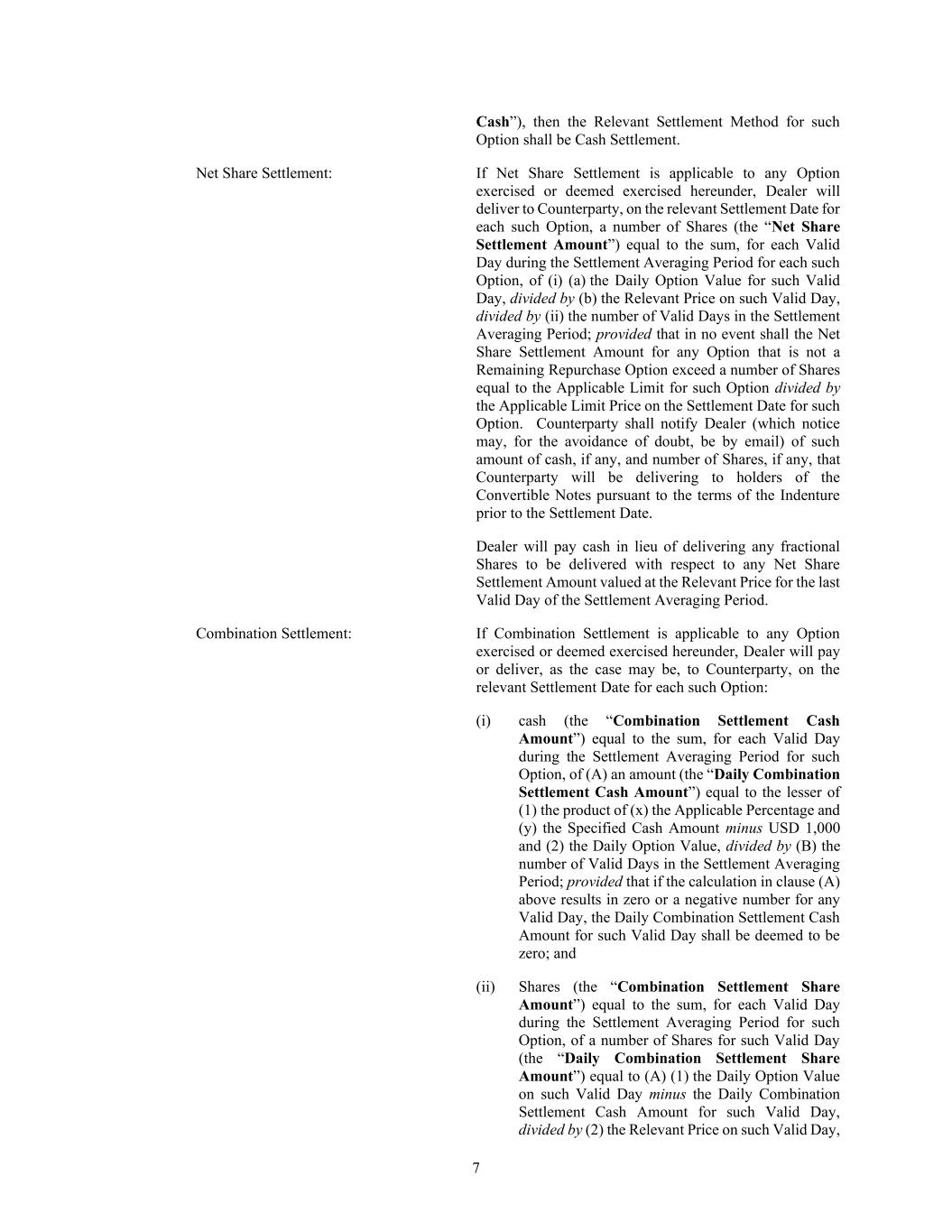 7 Cash”), then the Relevant Settlement Method for such Option shall be Cash Settlement. Net Share Settlement: If Net Share Settlement is applicable to any Option exercised or deemed exercised hereunder, Dealer will deliver to Counterparty, on the relevant Settlement Date for each such Option, a number of Shares (the “Net Share Settlement Amount”) equal to the sum, for each Valid Day during the Settlement Averaging Period for each such Option, of (i) (a) the Daily Option Value for such Valid Day, divided by (b) the Relevant Price on such Valid Day, divided by (ii) the number of Valid Days in the Settlement Averaging Period; provided that in no event shall the Net Share Settlement Amount for any Option that is not a Remaining Repurchase Option exceed a number of Shares equal to the Applicable Limit for such Option divided by the Applicable Limit Price on the Settlement Date for such Option. Counterparty shall notify Dealer (which notice may, for the avoidance of doubt, be by email) of such amount of cash, if any, and number of Shares, if any, that Counterparty will be delivering to holders of the Convertible Notes pursuant to the terms of the Indenture prior to the Settlement Date. Dealer will pay cash in lieu of delivering any fractional Shares to be delivered with respect to any Net Share Settlement Amount valued at the Relevant Price for the last Valid Day of the Settlement Averaging Period. Combination Settlement: If Combination Settlement is applicable to any Option exercised or deemed exercised hereunder, Dealer will pay or deliver, as the case may be, to Counterparty, on the relevant Settlement Date for each such Option: (i) cash (the “Combination Settlement Cash Amount”) equal to the sum, for each Valid Day during the Settlement Averaging Period for such Option, of (A) an amount (the “Daily Combination Settlement Cash Amount”) equal to the lesser of (1) the product of (x) the Applicable Percentage and (y) the Specified Cash Amount minus USD 1,000 and (2) the Daily Option Value, divided by (B) the number of Valid Days in the Settlement Averaging Period; provided that if the calculation in clause (A) above results in zero or a negative number for any Valid Day, the Daily Combination Settlement Cash Amount for such Valid Day shall be deemed to be zero; and (ii) Shares (the “Combination Settlement Share Amount”) equal to the sum, for each Valid Day during the Settlement Averaging Period for such Option, of a number of Shares for such Valid Day (the “Daily Combination Settlement Share Amount”) equal to (A) (1) the Daily Option Value on such Valid Day minus the Daily Combination Settlement Cash Amount for such Valid Day, divided by (2) the Relevant Price on such Valid Day,