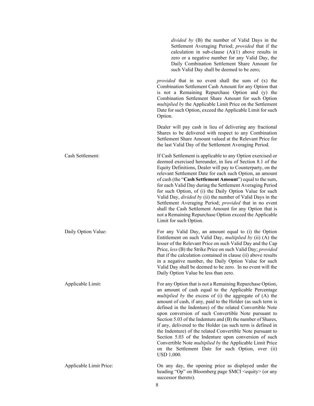 8 divided by (B) the number of Valid Days in the Settlement Averaging Period; provided that if the calculation in sub-clause (A)(1) above results in zero or a negative number for any Valid Day, the Daily Combination Settlement Share Amount for such Valid Day shall be deemed to be zero; provided that in no event shall the sum of (x) the Combination Settlement Cash Amount for any Option that is not a Remaining Repurchase Option and (y) the Combination Settlement Share Amount for such Option multiplied by the Applicable Limit Price on the Settlement Date for such Option, exceed the Applicable Limit for such Option. Dealer will pay cash in lieu of delivering any fractional Shares to be delivered with respect to any Combination Settlement Share Amount valued at the Relevant Price for the last Valid Day of the Settlement Averaging Period. Cash Settlement: If Cash Settlement is applicable to any Option exercised or deemed exercised hereunder, in lieu of Section 8.1 of the Equity Definitions, Dealer will pay to Counterparty, on the relevant Settlement Date for each such Option, an amount of cash (the “Cash Settlement Amount”) equal to the sum, for each Valid Day during the Settlement Averaging Period for such Option, of (i) the Daily Option Value for such Valid Day, divided by (ii) the number of Valid Days in the Settlement Averaging Period; provided that in no event shall the Cash Settlement Amount for any Option that is not a Remaining Repurchase Option exceed the Applicable Limit for such Option. Daily Option Value: For any Valid Day, an amount equal to (i) the Option Entitlement on such Valid Day, multiplied by (ii) (A) the lesser of the Relevant Price on such Valid Day and the Cap Price, less (B) the Strike Price on such Valid Day; provided that if the calculation contained in clause (ii) above results in a negative number, the Daily Option Value for such Valid Day shall be deemed to be zero. In no event will the Daily Option Value be less than zero. Applicable Limit: For any Option that is not a Remaining Repurchase Option, an amount of cash equal to the Applicable Percentage multiplied by the excess of (i) the aggregate of (A) the amount of cash, if any, paid to the Holder (as such term is defined in the Indenture) of the related Convertible Note upon conversion of such Convertible Note pursuant to Section 5.03 of the Indenture and (B) the number of Shares, if any, delivered to the Holder (as such term is defined in the Indenture) of the related Convertible Note pursuant to Section 5.03 of the Indenture upon conversion of such Convertible Note multiplied by the Applicable Limit Price on the Settlement Date for such Option, over (ii) USD 1,000. Applicable Limit Price: On any day, the opening price as displayed under the heading “Op” on Bloomberg page SMCI <equity> (or any successor thereto).