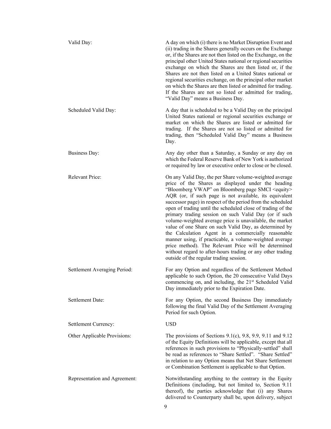 9 Valid Day: A day on which (i) there is no Market Disruption Event and (ii) trading in the Shares generally occurs on the Exchange or, if the Shares are not then listed on the Exchange, on the principal other United States national or regional securities exchange on which the Shares are then listed or, if the Shares are not then listed on a United States national or regional securities exchange, on the principal other market on which the Shares are then listed or admitted for trading. If the Shares are not so listed or admitted for trading, “Valid Day” means a Business Day. Scheduled Valid Day: A day that is scheduled to be a Valid Day on the principal United States national or regional securities exchange or market on which the Shares are listed or admitted for trading. If the Shares are not so listed or admitted for trading, then “Scheduled Valid Day” means a Business Day. Business Day: Any day other than a Saturday, a Sunday or any day on which the Federal Reserve Bank of New York is authorized or required by law or executive order to close or be closed. Relevant Price: On any Valid Day, the per Share volume-weighted average price of the Shares as displayed under the heading “Bloomberg VWAP” on Bloomberg page SMCI <equity> AQR (or, if such page is not available, its equivalent successor page) in respect of the period from the scheduled open of trading until the scheduled close of trading of the primary trading session on such Valid Day (or if such volume-weighted average price is unavailable, the market value of one Share on such Valid Day, as determined by the Calculation Agent in a commercially reasonable manner using, if practicable, a volume-weighted average price method). The Relevant Price will be determined without regard to after-hours trading or any other trading outside of the regular trading session. Settlement Averaging Period: For any Option and regardless of the Settlement Method applicable to such Option, the 20 consecutive Valid Days commencing on, and including, the 21st Scheduled Valid Day immediately prior to the Expiration Date. Settlement Date: For any Option, the second Business Day immediately following the final Valid Day of the Settlement Averaging Period for such Option. Settlement Currency: USD Other Applicable Provisions: The provisions of Sections 9.1(c), 9.8, 9.9, 9.11 and 9.12 of the Equity Definitions will be applicable, except that all references in such provisions to “Physically-settled” shall be read as references to “Share Settled”. “Share Settled” in relation to any Option means that Net Share Settlement or Combination Settlement is applicable to that Option. Representation and Agreement: Notwithstanding anything to the contrary in the Equity Definitions (including, but not limited to, Section 9.11 thereof), the parties acknowledge that (i) any Shares delivered to Counterparty shall be, upon delivery, subject