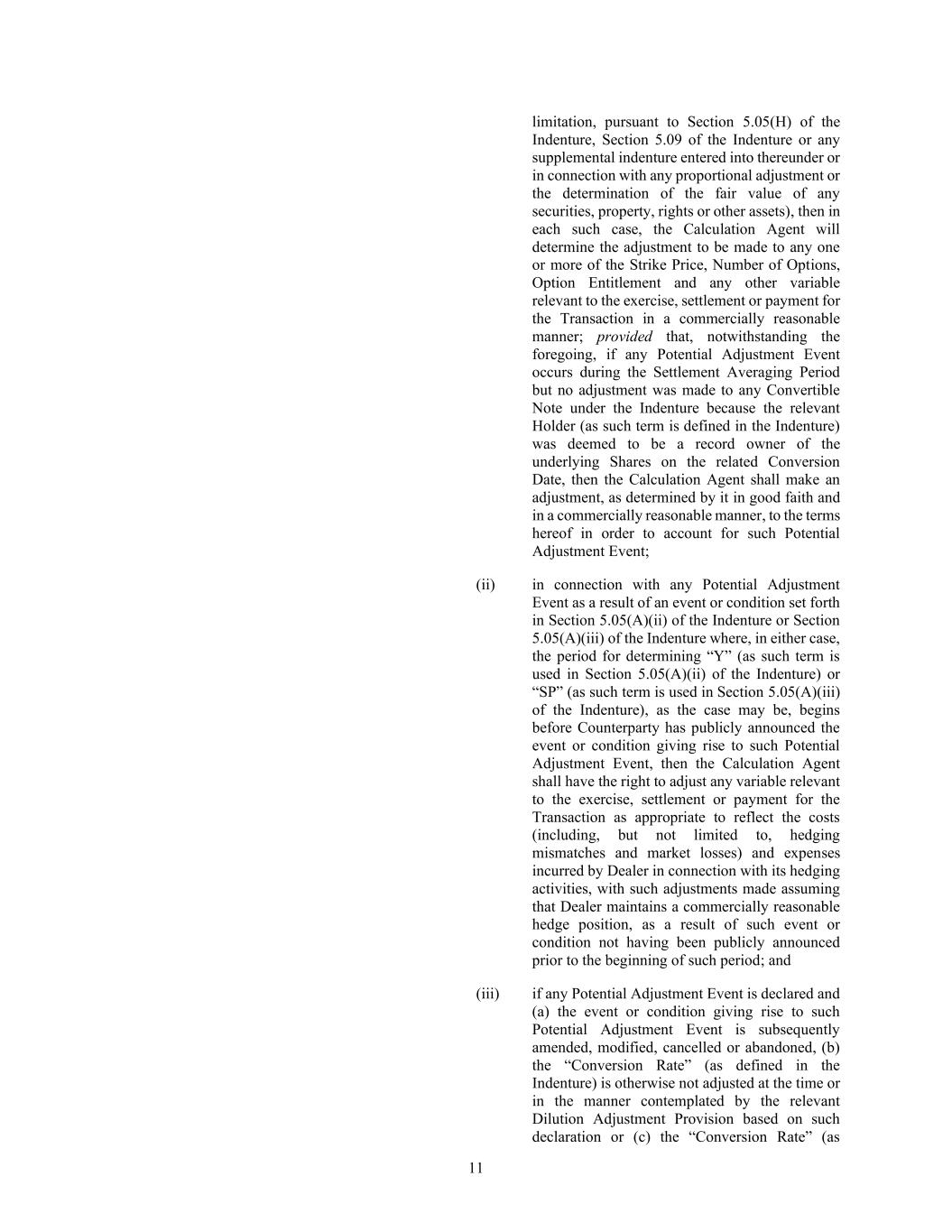 11 limitation, pursuant to Section 5.05(H) of the Indenture, Section 5.09 of the Indenture or any supplemental indenture entered into thereunder or in connection with any proportional adjustment or the determination of the fair value of any securities, property, rights or other assets), then in each such case, the Calculation Agent will determine the adjustment to be made to any one or more of the Strike Price, Number of Options, Option Entitlement and any other variable relevant to the exercise, settlement or payment for the Transaction in a commercially reasonable manner; provided that, notwithstanding the foregoing, if any Potential Adjustment Event occurs during the Settlement Averaging Period but no adjustment was made to any Convertible Note under the Indenture because the relevant Holder (as such term is defined in the Indenture) was deemed to be a record owner of the underlying Shares on the related Conversion Date, then the Calculation Agent shall make an adjustment, as determined by it in good faith and in a commercially reasonable manner, to the terms hereof in order to account for such Potential Adjustment Event; (ii) in connection with any Potential Adjustment Event as a result of an event or condition set forth in Section 5.05(A)(ii) of the Indenture or Section 5.05(A)(iii) of the Indenture where, in either case, the period for determining “Y” (as such term is used in Section 5.05(A)(ii) of the Indenture) or “SP” (as such term is used in Section 5.05(A)(iii) of the Indenture), as the case may be, begins before Counterparty has publicly announced the event or condition giving rise to such Potential Adjustment Event, then the Calculation Agent shall have the right to adjust any variable relevant to the exercise, settlement or payment for the Transaction as appropriate to reflect the costs (including, but not limited to, hedging mismatches and market losses) and expenses incurred by Dealer in connection with its hedging activities, with such adjustments made assuming that Dealer maintains a commercially reasonable hedge position, as a result of such event or condition not having been publicly announced prior to the beginning of such period; and (iii) if any Potential Adjustment Event is declared and (a) the event or condition giving rise to such Potential Adjustment Event is subsequently amended, modified, cancelled or abandoned, (b) the “Conversion Rate” (as defined in the Indenture) is otherwise not adjusted at the time or in the manner contemplated by the relevant Dilution Adjustment Provision based on such declaration or (c) the “Conversion Rate” (as