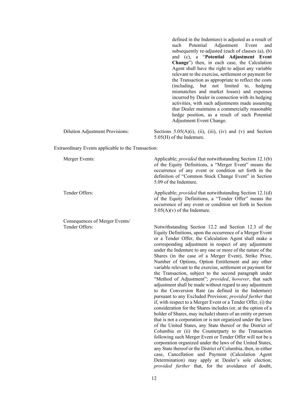 12 defined in the Indenture) is adjusted as a result of such Potential Adjustment Event and subsequently re-adjusted (each of clauses (a), (b) and (c), a “Potential Adjustment Event Change”) then, in each case, the Calculation Agent shall have the right to adjust any variable relevant to the exercise, settlement or payment for the Transaction as appropriate to reflect the costs (including, but not limited to, hedging mismatches and market losses) and expenses incurred by Dealer in connection with its hedging activities, with such adjustments made assuming that Dealer maintains a commercially reasonable hedge position, as a result of such Potential Adjustment Event Change. Dilution Adjustment Provisions: Sections 5.05(A)(i), (ii), (iii), (iv) and (v) and Section 5.05(H) of the Indenture. Extraordinary Events applicable to the Transaction: Merger Events: Applicable; provided that notwithstanding Section 12.1(b) of the Equity Definitions, a “Merger Event” means the occurrence of any event or condition set forth in the definition of “Common Stock Change Event” in Section 5.09 of the Indenture. Tender Offers: Applicable; provided that notwithstanding Section 12.1(d) of the Equity Definitions, a “Tender Offer” means the occurrence of any event or condition set forth in Section 5.05(A)(v) of the Indenture. Consequences of Merger Events/ Tender Offers: Notwithstanding Section 12.2 and Section 12.3 of the Equity Definitions, upon the occurrence of a Merger Event or a Tender Offer, the Calculation Agent shall make a corresponding adjustment in respect of any adjustment under the Indenture to any one or more of the nature of the Shares (in the case of a Merger Event), Strike Price, Number of Options, Option Entitlement and any other variable relevant to the exercise, settlement or payment for the Transaction, subject to the second paragraph under “Method of Adjustment”; provided, however, that such adjustment shall be made without regard to any adjustment to the Conversion Rate (as defined in the Indenture) pursuant to any Excluded Provision; provided further that if, with respect to a Merger Event or a Tender Offer, (i) the consideration for the Shares includes (or, at the option of a holder of Shares, may include) shares of an entity or person that is not a corporation or is not organized under the laws of the United States, any State thereof or the District of Columbia or (ii) the Counterparty to the Transaction following such Merger Event or Tender Offer will not be a corporation organized under the laws of the United States, any State thereof or the District of Columbia, then, in either case, Cancellation and Payment (Calculation Agent Determination) may apply at Dealer’s sole election; provided further that, for the avoidance of doubt,