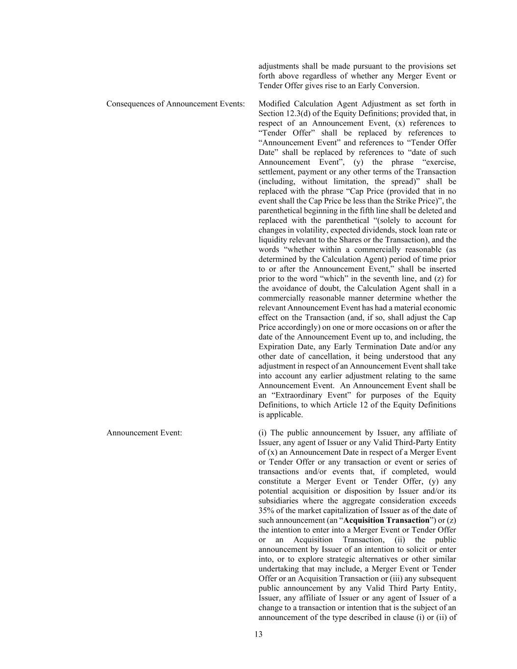 13 adjustments shall be made pursuant to the provisions set forth above regardless of whether any Merger Event or Tender Offer gives rise to an Early Conversion. Consequences of Announcement Events: Modified Calculation Agent Adjustment as set forth in Section 12.3(d) of the Equity Definitions; provided that, in respect of an Announcement Event, (x) references to “Tender Offer” shall be replaced by references to “Announcement Event” and references to “Tender Offer Date” shall be replaced by references to “date of such Announcement Event”, (y) the phrase “exercise, settlement, payment or any other terms of the Transaction (including, without limitation, the spread)” shall be replaced with the phrase “Cap Price (provided that in no event shall the Cap Price be less than the Strike Price)”, the parenthetical beginning in the fifth line shall be deleted and replaced with the parenthetical “(solely to account for changes in volatility, expected dividends, stock loan rate or liquidity relevant to the Shares or the Transaction), and the words “whether within a commercially reasonable (as determined by the Calculation Agent) period of time prior to or after the Announcement Event,” shall be inserted prior to the word “which” in the seventh line, and (z) for the avoidance of doubt, the Calculation Agent shall in a commercially reasonable manner determine whether the relevant Announcement Event has had a material economic effect on the Transaction (and, if so, shall adjust the Cap Price accordingly) on one or more occasions on or after the date of the Announcement Event up to, and including, the Expiration Date, any Early Termination Date and/or any other date of cancellation, it being understood that any adjustment in respect of an Announcement Event shall take into account any earlier adjustment relating to the same Announcement Event. An Announcement Event shall be an “Extraordinary Event” for purposes of the Equity Definitions, to which Article 12 of the Equity Definitions is applicable. Announcement Event: (i) The public announcement by Issuer, any affiliate of Issuer, any agent of Issuer or any Valid Third-Party Entity of (x) an Announcement Date in respect of a Merger Event or Tender Offer or any transaction or event or series of transactions and/or events that, if completed, would constitute a Merger Event or Tender Offer, (y) any potential acquisition or disposition by Issuer and/or its subsidiaries where the aggregate consideration exceeds 35% of the market capitalization of Issuer as of the date of such announcement (an “Acquisition Transaction”) or (z) the intention to enter into a Merger Event or Tender Offer or an Acquisition Transaction, (ii) the public announcement by Issuer of an intention to solicit or enter into, or to explore strategic alternatives or other similar undertaking that may include, a Merger Event or Tender Offer or an Acquisition Transaction or (iii) any subsequent public announcement by any Valid Third Party Entity, Issuer, any affiliate of Issuer or any agent of Issuer of a change to a transaction or intention that is the subject of an announcement of the type described in clause (i) or (ii) of