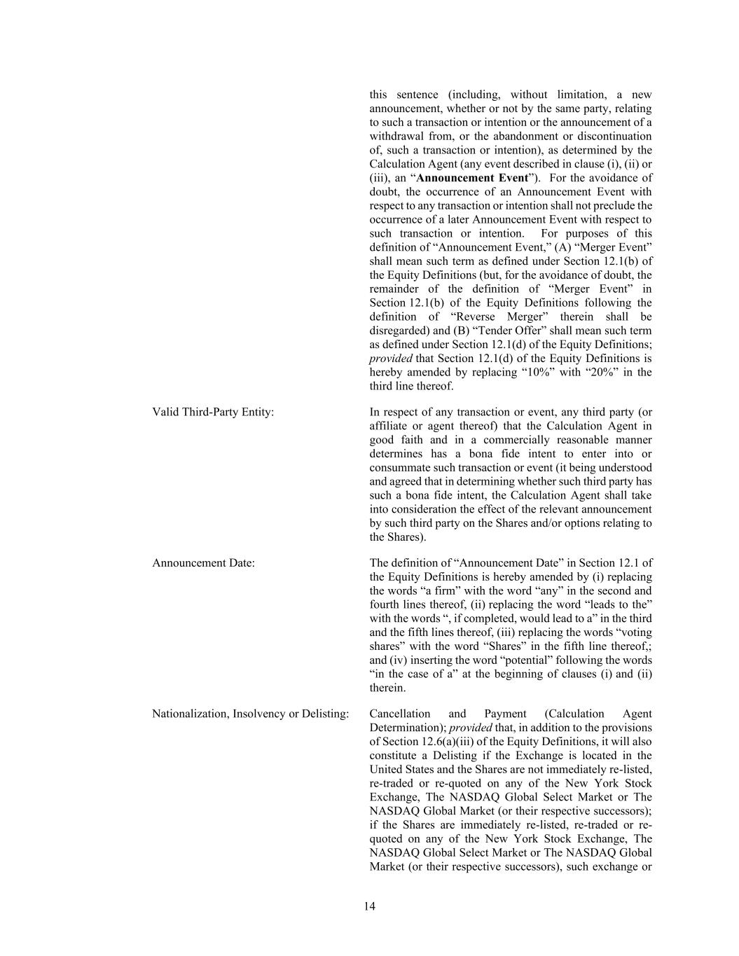 14 this sentence (including, without limitation, a new announcement, whether or not by the same party, relating to such a transaction or intention or the announcement of a withdrawal from, or the abandonment or discontinuation of, such a transaction or intention), as determined by the Calculation Agent (any event described in clause (i), (ii) or (iii), an “Announcement Event”). For the avoidance of doubt, the occurrence of an Announcement Event with respect to any transaction or intention shall not preclude the occurrence of a later Announcement Event with respect to such transaction or intention. For purposes of this definition of “Announcement Event,” (A) “Merger Event” shall mean such term as defined under Section 12.1(b) of the Equity Definitions (but, for the avoidance of doubt, the remainder of the definition of “Merger Event” in Section 12.1(b) of the Equity Definitions following the definition of “Reverse Merger” therein shall be disregarded) and (B) “Tender Offer” shall mean such term as defined under Section 12.1(d) of the Equity Definitions; provided that Section 12.1(d) of the Equity Definitions is hereby amended by replacing “10%” with “20%” in the third line thereof. Valid Third-Party Entity: In respect of any transaction or event, any third party (or affiliate or agent thereof) that the Calculation Agent in good faith and in a commercially reasonable manner determines has a bona fide intent to enter into or consummate such transaction or event (it being understood and agreed that in determining whether such third party has such a bona fide intent, the Calculation Agent shall take into consideration the effect of the relevant announcement by such third party on the Shares and/or options relating to the Shares). Announcement Date: The definition of “Announcement Date” in Section 12.1 of the Equity Definitions is hereby amended by (i) replacing the words “a firm” with the word “any” in the second and fourth lines thereof, (ii) replacing the word “leads to the” with the words “, if completed, would lead to a” in the third and the fifth lines thereof, (iii) replacing the words “voting shares” with the word “Shares” in the fifth line thereof,; and (iv) inserting the word “potential” following the words “in the case of a” at the beginning of clauses (i) and (ii) therein. Nationalization, Insolvency or Delisting: Cancellation and Payment (Calculation Agent Determination); provided that, in addition to the provisions of Section 12.6(a)(iii) of the Equity Definitions, it will also constitute a Delisting if the Exchange is located in the United States and the Shares are not immediately re-listed, re-traded or re-quoted on any of the New York Stock Exchange, The NASDAQ Global Select Market or The NASDAQ Global Market (or their respective successors); if the Shares are immediately re-listed, re-traded or re- quoted on any of the New York Stock Exchange, The NASDAQ Global Select Market or The NASDAQ Global Market (or their respective successors), such exchange or