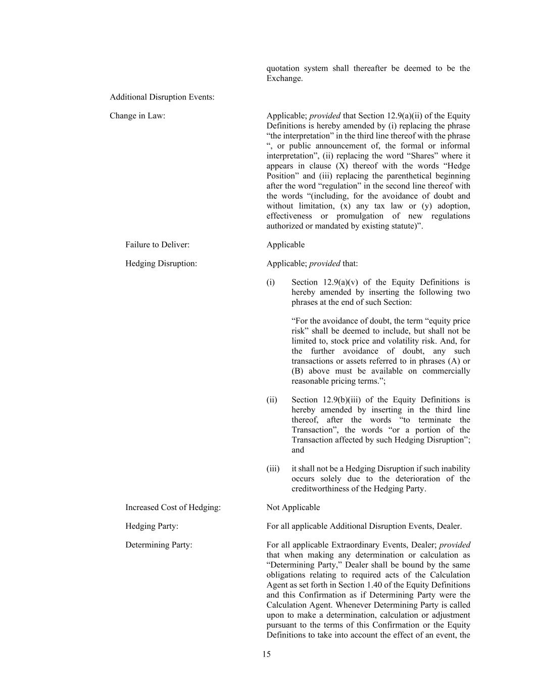 15 quotation system shall thereafter be deemed to be the Exchange. Additional Disruption Events: Change in Law: Applicable; provided that Section 12.9(a)(ii) of the Equity Definitions is hereby amended by (i) replacing the phrase “the interpretation” in the third line thereof with the phrase “, or public announcement of, the formal or informal interpretation”, (ii) replacing the word “Shares” where it appears in clause (X) thereof with the words “Hedge Position” and (iii) replacing the parenthetical beginning after the word “regulation” in the second line thereof with the words “(including, for the avoidance of doubt and without limitation, (x) any tax law or (y) adoption, effectiveness or promulgation of new regulations authorized or mandated by existing statute)”. Failure to Deliver: Applicable Hedging Disruption: Applicable; provided that: (i) Section 12.9(a)(v) of the Equity Definitions is hereby amended by inserting the following two phrases at the end of such Section: “For the avoidance of doubt, the term “equity price risk” shall be deemed to include, but shall not be limited to, stock price and volatility risk. And, for the further avoidance of doubt, any such transactions or assets referred to in phrases (A) or (B) above must be available on commercially reasonable pricing terms.”; (ii) Section 12.9(b)(iii) of the Equity Definitions is hereby amended by inserting in the third line thereof, after the words “to terminate the Transaction”, the words “or a portion of the Transaction affected by such Hedging Disruption”; and (iii) it shall not be a Hedging Disruption if such inability occurs solely due to the deterioration of the creditworthiness of the Hedging Party. Increased Cost of Hedging: Not Applicable Hedging Party: For all applicable Additional Disruption Events, Dealer. Determining Party: For all applicable Extraordinary Events, Dealer; provided that when making any determination or calculation as “Determining Party,” Dealer shall be bound by the same obligations relating to required acts of the Calculation Agent as set forth in Section 1.40 of the Equity Definitions and this Confirmation as if Determining Party were the Calculation Agent. Whenever Determining Party is called upon to make a determination, calculation or adjustment pursuant to the terms of this Confirmation or the Equity Definitions to take into account the effect of an event, the
