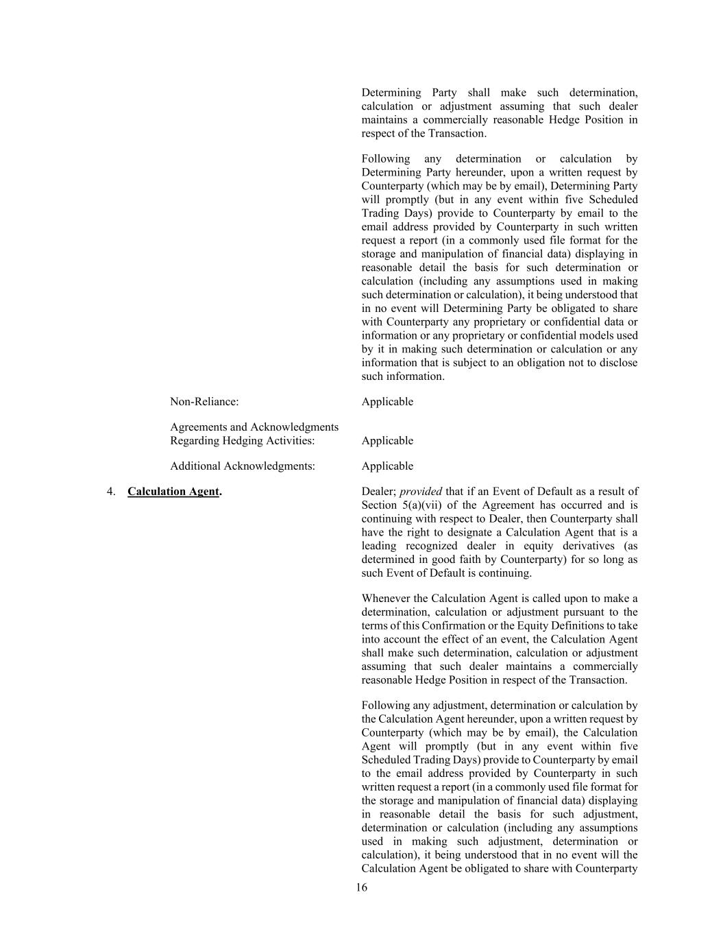 16 Determining Party shall make such determination, calculation or adjustment assuming that such dealer maintains a commercially reasonable Hedge Position in respect of the Transaction. Following any determination or calculation by Determining Party hereunder, upon a written request by Counterparty (which may be by email), Determining Party will promptly (but in any event within five Scheduled Trading Days) provide to Counterparty by email to the email address provided by Counterparty in such written request a report (in a commonly used file format for the storage and manipulation of financial data) displaying in reasonable detail the basis for such determination or calculation (including any assumptions used in making such determination or calculation), it being understood that in no event will Determining Party be obligated to share with Counterparty any proprietary or confidential data or information or any proprietary or confidential models used by it in making such determination or calculation or any information that is subject to an obligation not to disclose such information. Non-Reliance: Applicable Agreements and Acknowledgments Regarding Hedging Activities: Applicable Additional Acknowledgments: Applicable 4. Calculation Agent. Dealer; provided that if an Event of Default as a result of Section 5(a)(vii) of the Agreement has occurred and is continuing with respect to Dealer, then Counterparty shall have the right to designate a Calculation Agent that is a leading recognized dealer in equity derivatives (as determined in good faith by Counterparty) for so long as such Event of Default is continuing. Whenever the Calculation Agent is called upon to make a determination, calculation or adjustment pursuant to the terms of this Confirmation or the Equity Definitions to take into account the effect of an event, the Calculation Agent shall make such determination, calculation or adjustment assuming that such dealer maintains a commercially reasonable Hedge Position in respect of the Transaction. Following any adjustment, determination or calculation by the Calculation Agent hereunder, upon a written request by Counterparty (which may be by email), the Calculation Agent will promptly (but in any event within five Scheduled Trading Days) provide to Counterparty by email to the email address provided by Counterparty in such written request a report (in a commonly used file format for the storage and manipulation of financial data) displaying in reasonable detail the basis for such adjustment, determination or calculation (including any assumptions used in making such adjustment, determination or calculation), it being understood that in no event will the Calculation Agent be obligated to share with Counterparty