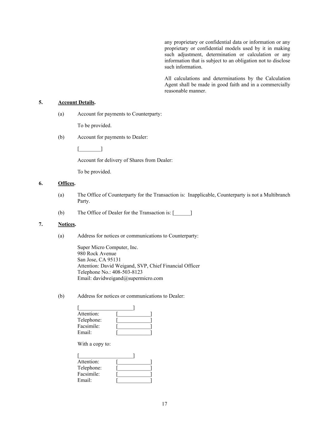 17 any proprietary or confidential data or information or any proprietary or confidential models used by it in making such adjustment, determination or calculation or any information that is subject to an obligation not to disclose such information. All calculations and determinations by the Calculation Agent shall be made in good faith and in a commercially reasonable manner. 5. Account Details. (a) Account for payments to Counterparty: To be provided. (b) Account for payments to Dealer: [________] Account for delivery of Shares from Dealer: To be provided. 6. Offices. (a) The Office of Counterparty for the Transaction is: Inapplicable, Counterparty is not a Multibranch Party. (b) The Office of Dealer for the Transaction is: [______] 7. Notices. (a) Address for notices or communications to Counterparty: Super Micro Computer, Inc. 980 Rock Avenue San Jose, CA 95131 Attention: David Weigand, SVP, Chief Financial Officer Telephone No.: 408-503-8123 Email: davidweigand@supermicro.com (b) Address for notices or communications to Dealer: [____________________] Attention: [____________] Telephone: [____________] Facsimile: [____________] Email: [____________] With a copy to: [____________________] Attention: [____________] Telephone: [____________] Facsimile: [____________] Email: [____________]