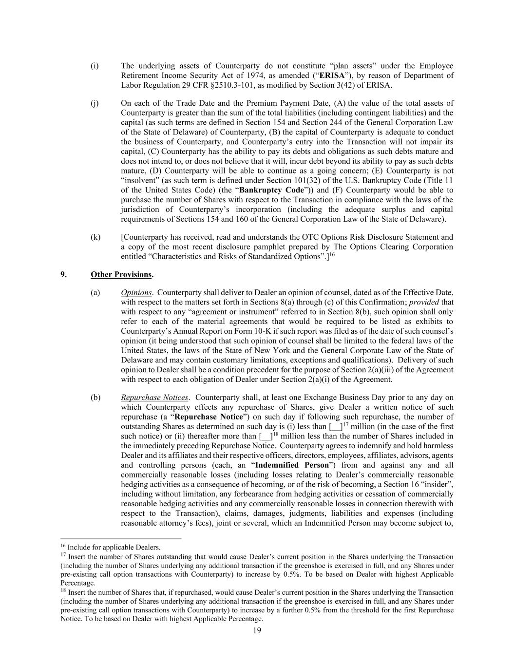 19 (i) The underlying assets of Counterparty do not constitute “plan assets” under the Employee Retirement Income Security Act of 1974, as amended (“ERISA”), by reason of Department of Labor Regulation 29 CFR §2510.3-101, as modified by Section 3(42) of ERISA. (j) On each of the Trade Date and the Premium Payment Date, (A) the value of the total assets of Counterparty is greater than the sum of the total liabilities (including contingent liabilities) and the capital (as such terms are defined in Section 154 and Section 244 of the General Corporation Law of the State of Delaware) of Counterparty, (B) the capital of Counterparty is adequate to conduct the business of Counterparty, and Counterparty’s entry into the Transaction will not impair its capital, (C) Counterparty has the ability to pay its debts and obligations as such debts mature and does not intend to, or does not believe that it will, incur debt beyond its ability to pay as such debts mature, (D) Counterparty will be able to continue as a going concern; (E) Counterparty is not “insolvent” (as such term is defined under Section 101(32) of the U.S. Bankruptcy Code (Title 11 of the United States Code) (the “Bankruptcy Code”)) and (F) Counterparty would be able to purchase the number of Shares with respect to the Transaction in compliance with the laws of the jurisdiction of Counterparty’s incorporation (including the adequate surplus and capital requirements of Sections 154 and 160 of the General Corporation Law of the State of Delaware). (k) [Counterparty has received, read and understands the OTC Options Risk Disclosure Statement and a copy of the most recent disclosure pamphlet prepared by The Options Clearing Corporation entitled “Characteristics and Risks of Standardized Options”.]16 9. Other Provisions. (a) Opinions. Counterparty shall deliver to Dealer an opinion of counsel, dated as of the Effective Date, with respect to the matters set forth in Sections 8(a) through (c) of this Confirmation; provided that with respect to any “agreement or instrument” referred to in Section 8(b), such opinion shall only refer to each of the material agreements that would be required to be listed as exhibits to Counterparty’s Annual Report on Form 10-K if such report was filed as of the date of such counsel’s opinion (it being understood that such opinion of counsel shall be limited to the federal laws of the United States, the laws of the State of New York and the General Corporate Law of the State of Delaware and may contain customary limitations, exceptions and qualifications). Delivery of such opinion to Dealer shall be a condition precedent for the purpose of Section 2(a)(iii) of the Agreement with respect to each obligation of Dealer under Section 2(a)(i) of the Agreement. (b) Repurchase Notices. Counterparty shall, at least one Exchange Business Day prior to any day on which Counterparty effects any repurchase of Shares, give Dealer a written notice of such repurchase (a “Repurchase Notice”) on such day if following such repurchase, the number of outstanding Shares as determined on such day is (i) less than [__]17 million (in the case of the first such notice) or (ii) thereafter more than [__]18 million less than the number of Shares included in the immediately preceding Repurchase Notice. Counterparty agrees to indemnify and hold harmless Dealer and its affiliates and their respective officers, directors, employees, affiliates, advisors, agents and controlling persons (each, an “Indemnified Person”) from and against any and all commercially reasonable losses (including losses relating to Dealer’s commercially reasonable hedging activities as a consequence of becoming, or of the risk of becoming, a Section 16 “insider”, including without limitation, any forbearance from hedging activities or cessation of commercially reasonable hedging activities and any commercially reasonable losses in connection therewith with respect to the Transaction), claims, damages, judgments, liabilities and expenses (including reasonable attorney’s fees), joint or several, which an Indemnified Person may become subject to, 16 Include for applicable Dealers. 17 Insert the number of Shares outstanding that would cause Dealer’s current position in the Shares underlying the Transaction (including the number of Shares underlying any additional transaction if the greenshoe is exercised in full, and any Shares under pre-existing call option transactions with Counterparty) to increase by 0.5%. To be based on Dealer with highest Applicable Percentage. 18 Insert the number of Shares that, if repurchased, would cause Dealer’s current position in the Shares underlying the Transaction (including the number of Shares underlying any additional transaction if the greenshoe is exercised in full, and any Shares under pre-existing call option transactions with Counterparty) to increase by a further 0.5% from the threshold for the first Repurchase Notice. To be based on Dealer with highest Applicable Percentage.