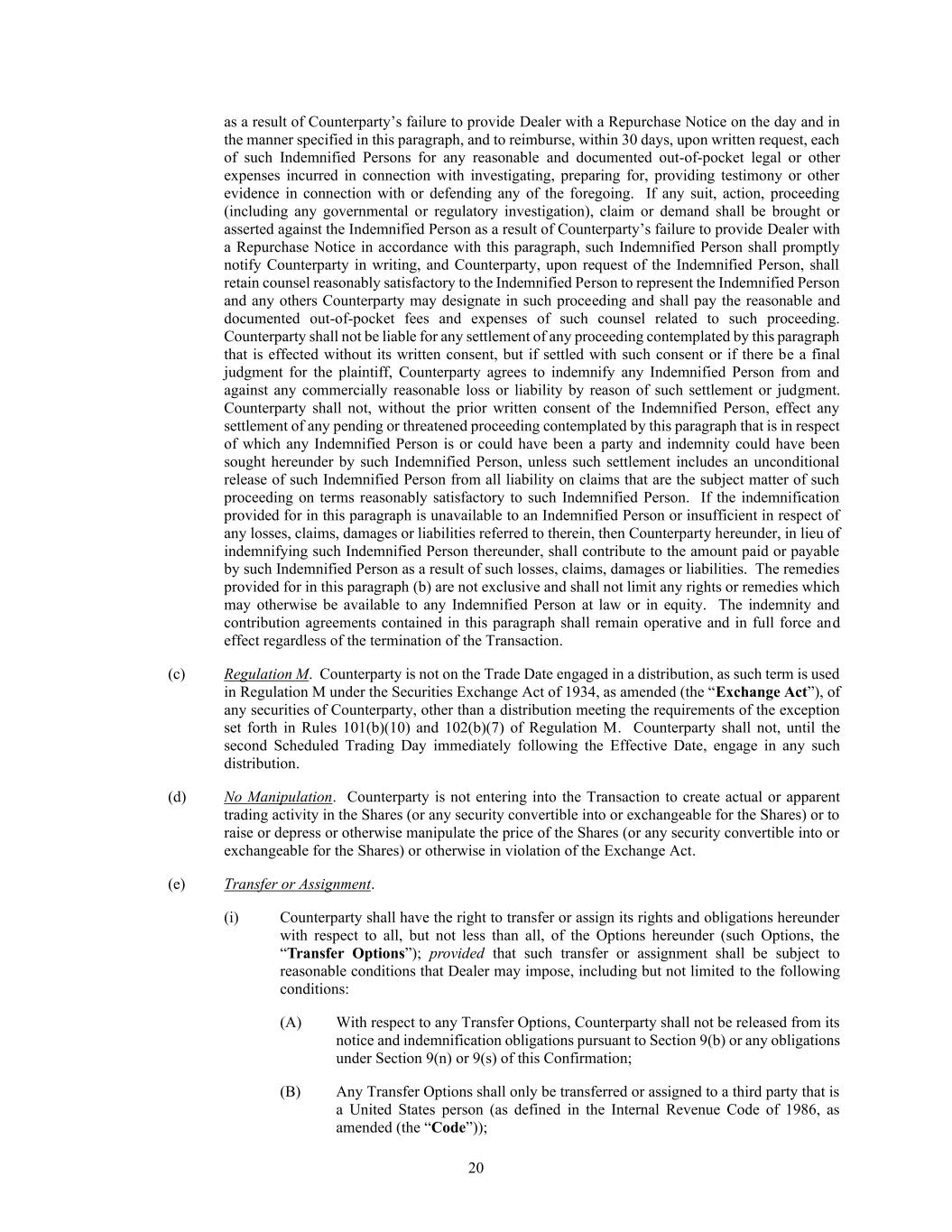 20 as a result of Counterparty’s failure to provide Dealer with a Repurchase Notice on the day and in the manner specified in this paragraph, and to reimburse, within 30 days, upon written request, each of such Indemnified Persons for any reasonable and documented out-of-pocket legal or other expenses incurred in connection with investigating, preparing for, providing testimony or other evidence in connection with or defending any of the foregoing. If any suit, action, proceeding (including any governmental or regulatory investigation), claim or demand shall be brought or asserted against the Indemnified Person as a result of Counterparty’s failure to provide Dealer with a Repurchase Notice in accordance with this paragraph, such Indemnified Person shall promptly notify Counterparty in writing, and Counterparty, upon request of the Indemnified Person, shall retain counsel reasonably satisfactory to the Indemnified Person to represent the Indemnified Person and any others Counterparty may designate in such proceeding and shall pay the reasonable and documented out-of-pocket fees and expenses of such counsel related to such proceeding. Counterparty shall not be liable for any settlement of any proceeding contemplated by this paragraph that is effected without its written consent, but if settled with such consent or if there be a final judgment for the plaintiff, Counterparty agrees to indemnify any Indemnified Person from and against any commercially reasonable loss or liability by reason of such settlement or judgment. Counterparty shall not, without the prior written consent of the Indemnified Person, effect any settlement of any pending or threatened proceeding contemplated by this paragraph that is in respect of which any Indemnified Person is or could have been a party and indemnity could have been sought hereunder by such Indemnified Person, unless such settlement includes an unconditional release of such Indemnified Person from all liability on claims that are the subject matter of such proceeding on terms reasonably satisfactory to such Indemnified Person. If the indemnification provided for in this paragraph is unavailable to an Indemnified Person or insufficient in respect of any losses, claims, damages or liabilities referred to therein, then Counterparty hereunder, in lieu of indemnifying such Indemnified Person thereunder, shall contribute to the amount paid or payable by such Indemnified Person as a result of such losses, claims, damages or liabilities. The remedies provided for in this paragraph (b) are not exclusive and shall not limit any rights or remedies which may otherwise be available to any Indemnified Person at law or in equity. The indemnity and contribution agreements contained in this paragraph shall remain operative and in full force and effect regardless of the termination of the Transaction. (c) Regulation M. Counterparty is not on the Trade Date engaged in a distribution, as such term is used in Regulation M under the Securities Exchange Act of 1934, as amended (the “Exchange Act”), of any securities of Counterparty, other than a distribution meeting the requirements of the exception set forth in Rules 101(b)(10) and 102(b)(7) of Regulation M. Counterparty shall not, until the second Scheduled Trading Day immediately following the Effective Date, engage in any such distribution. (d) No Manipulation. Counterparty is not entering into the Transaction to create actual or apparent trading activity in the Shares (or any security convertible into or exchangeable for the Shares) or to raise or depress or otherwise manipulate the price of the Shares (or any security convertible into or exchangeable for the Shares) or otherwise in violation of the Exchange Act. (e) Transfer or Assignment. (i) Counterparty shall have the right to transfer or assign its rights and obligations hereunder with respect to all, but not less than all, of the Options hereunder (such Options, the “Transfer Options”); provided that such transfer or assignment shall be subject to reasonable conditions that Dealer may impose, including but not limited to the following conditions: (A) With respect to any Transfer Options, Counterparty shall not be released from its notice and indemnification obligations pursuant to Section 9(b) or any obligations under Section 9(n) or 9(s) of this Confirmation; (B) Any Transfer Options shall only be transferred or assigned to a third party that is a United States person (as defined in the Internal Revenue Code of 1986, as amended (the “Code”));