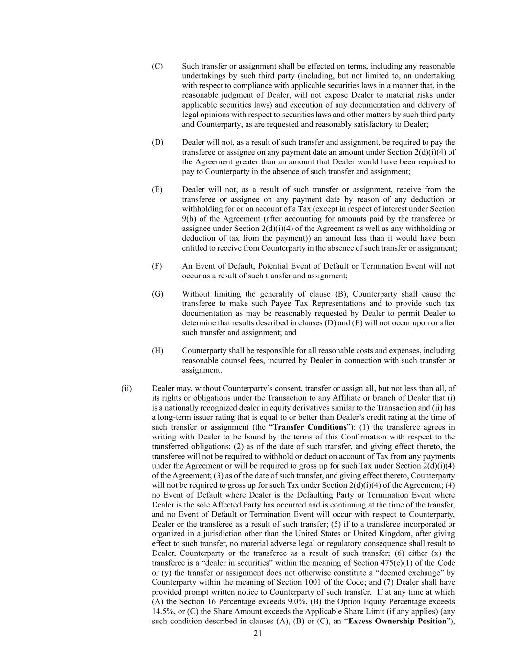 21 (C) Such transfer or assignment shall be effected on terms, including any reasonable undertakings by such third party (including, but not limited to, an undertaking with respect to compliance with applicable securities laws in a manner that, in the reasonable judgment of Dealer, will not expose Dealer to material risks under applicable securities laws) and execution of any documentation and delivery of legal opinions with respect to securities laws and other matters by such third party and Counterparty, as are requested and reasonably satisfactory to Dealer; (D) Dealer will not, as a result of such transfer and assignment, be required to pay the transferee or assignee on any payment date an amount under Section 2(d)(i)(4) of the Agreement greater than an amount that Dealer would have been required to pay to Counterparty in the absence of such transfer and assignment; (E) Dealer will not, as a result of such transfer or assignment, receive from the transferee or assignee on any payment date by reason of any deduction or withholding for or on account of a Tax (except in respect of interest under Section 9(h) of the Agreement (after accounting for amounts paid by the transferee or assignee under Section 2(d)(i)(4) of the Agreement as well as any withholding or deduction of tax from the payment)) an amount less than it would have been entitled to receive from Counterparty in the absence of such transfer or assignment; (F) An Event of Default, Potential Event of Default or Termination Event will not occur as a result of such transfer and assignment; (G) Without limiting the generality of clause (B), Counterparty shall cause the transferee to make such Payee Tax Representations and to provide such tax documentation as may be reasonably requested by Dealer to permit Dealer to determine that results described in clauses (D) and (E) will not occur upon or after such transfer and assignment; and (H) Counterparty shall be responsible for all reasonable costs and expenses, including reasonable counsel fees, incurred by Dealer in connection with such transfer or assignment. (ii) Dealer may, without Counterparty’s consent, transfer or assign all, but not less than all, of its rights or obligations under the Transaction to any Affiliate or branch of Dealer that (i) is a nationally recognized dealer in equity derivatives similar to the Transaction and (ii) has a long-term issuer rating that is equal to or better than Dealer’s credit rating at the time of such transfer or assignment (the “Transfer Conditions”): (1) the transferee agrees in writing with Dealer to be bound by the terms of this Confirmation with respect to the transferred obligations; (2) as of the date of such transfer, and giving effect thereto, the transferee will not be required to withhold or deduct on account of Tax from any payments under the Agreement or will be required to gross up for such Tax under Section 2(d)(i)(4) of the Agreement; (3) as of the date of such transfer, and giving effect thereto, Counterparty will not be required to gross up for such Tax under Section 2(d)(i)(4) of the Agreement; (4) no Event of Default where Dealer is the Defaulting Party or Termination Event where Dealer is the sole Affected Party has occurred and is continuing at the time of the transfer, and no Event of Default or Termination Event will occur with respect to Counterparty, Dealer or the transferee as a result of such transfer; (5) if to a transferee incorporated or organized in a jurisdiction other than the United States or United Kingdom, after giving effect to such transfer, no material adverse legal or regulatory consequence shall result to Dealer, Counterparty or the transferee as a result of such transfer; (6) either (x) the transferee is a “dealer in securities” within the meaning of Section 475(c)(1) of the Code or (y) the transfer or assignment does not otherwise constitute a “deemed exchange” by Counterparty within the meaning of Section 1001 of the Code; and (7) Dealer shall have provided prompt written notice to Counterparty of such transfer. If at any time at which (A) the Section 16 Percentage exceeds 9.0%, (B) the Option Equity Percentage exceeds 14.5%, or (C) the Share Amount exceeds the Applicable Share Limit (if any applies) (any such condition described in clauses (A), (B) or (C), an “Excess Ownership Position”),