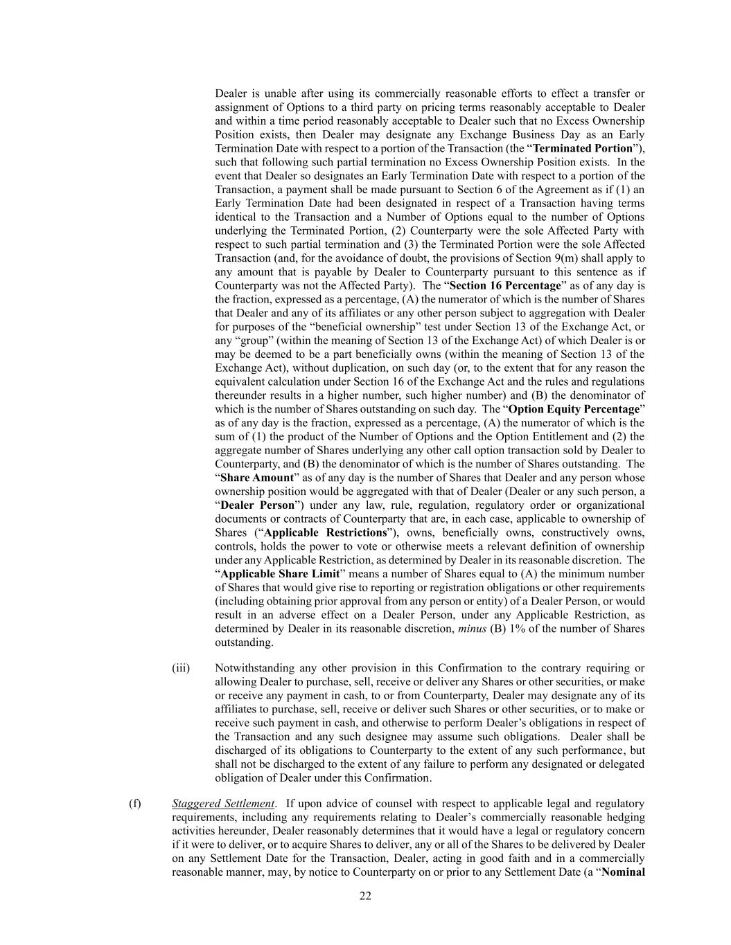 22 Dealer is unable after using its commercially reasonable efforts to effect a transfer or assignment of Options to a third party on pricing terms reasonably acceptable to Dealer and within a time period reasonably acceptable to Dealer such that no Excess Ownership Position exists, then Dealer may designate any Exchange Business Day as an Early Termination Date with respect to a portion of the Transaction (the “Terminated Portion”), such that following such partial termination no Excess Ownership Position exists. In the event that Dealer so designates an Early Termination Date with respect to a portion of the Transaction, a payment shall be made pursuant to Section 6 of the Agreement as if (1) an Early Termination Date had been designated in respect of a Transaction having terms identical to the Transaction and a Number of Options equal to the number of Options underlying the Terminated Portion, (2) Counterparty were the sole Affected Party with respect to such partial termination and (3) the Terminated Portion were the sole Affected Transaction (and, for the avoidance of doubt, the provisions of Section 9(m) shall apply to any amount that is payable by Dealer to Counterparty pursuant to this sentence as if Counterparty was not the Affected Party). The “Section 16 Percentage” as of any day is the fraction, expressed as a percentage, (A) the numerator of which is the number of Shares that Dealer and any of its affiliates or any other person subject to aggregation with Dealer for purposes of the “beneficial ownership” test under Section 13 of the Exchange Act, or any “group” (within the meaning of Section 13 of the Exchange Act) of which Dealer is or may be deemed to be a part beneficially owns (within the meaning of Section 13 of the Exchange Act), without duplication, on such day (or, to the extent that for any reason the equivalent calculation under Section 16 of the Exchange Act and the rules and regulations thereunder results in a higher number, such higher number) and (B) the denominator of which is the number of Shares outstanding on such day. The “Option Equity Percentage” as of any day is the fraction, expressed as a percentage, (A) the numerator of which is the sum of (1) the product of the Number of Options and the Option Entitlement and (2) the aggregate number of Shares underlying any other call option transaction sold by Dealer to Counterparty, and (B) the denominator of which is the number of Shares outstanding. The “Share Amount” as of any day is the number of Shares that Dealer and any person whose ownership position would be aggregated with that of Dealer (Dealer or any such person, a “Dealer Person”) under any law, rule, regulation, regulatory order or organizational documents or contracts of Counterparty that are, in each case, applicable to ownership of Shares (“Applicable Restrictions”), owns, beneficially owns, constructively owns, controls, holds the power to vote or otherwise meets a relevant definition of ownership under any Applicable Restriction, as determined by Dealer in its reasonable discretion. The “Applicable Share Limit” means a number of Shares equal to (A) the minimum number of Shares that would give rise to reporting or registration obligations or other requirements (including obtaining prior approval from any person or entity) of a Dealer Person, or would result in an adverse effect on a Dealer Person, under any Applicable Restriction, as determined by Dealer in its reasonable discretion, minus (B) 1% of the number of Shares outstanding. (iii) Notwithstanding any other provision in this Confirmation to the contrary requiring or allowing Dealer to purchase, sell, receive or deliver any Shares or other securities, or make or receive any payment in cash, to or from Counterparty, Dealer may designate any of its affiliates to purchase, sell, receive or deliver such Shares or other securities, or to make or receive such payment in cash, and otherwise to perform Dealer’s obligations in respect of the Transaction and any such designee may assume such obligations. Dealer shall be discharged of its obligations to Counterparty to the extent of any such performance, but shall not be discharged to the extent of any failure to perform any designated or delegated obligation of Dealer under this Confirmation. (f) Staggered Settlement. If upon advice of counsel with respect to applicable legal and regulatory requirements, including any requirements relating to Dealer’s commercially reasonable hedging activities hereunder, Dealer reasonably determines that it would have a legal or regulatory concern if it were to deliver, or to acquire Shares to deliver, any or all of the Shares to be delivered by Dealer on any Settlement Date for the Transaction, Dealer, acting in good faith and in a commercially reasonable manner, may, by notice to Counterparty on or prior to any Settlement Date (a “Nominal