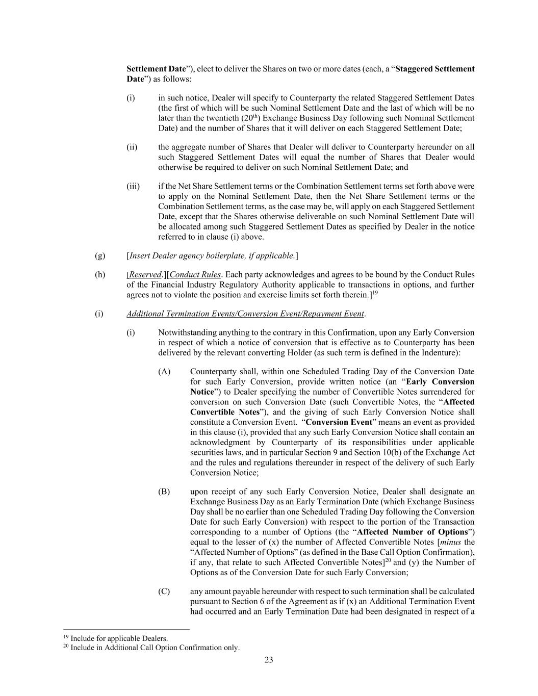 23 Settlement Date”), elect to deliver the Shares on two or more dates (each, a “Staggered Settlement Date”) as follows: (i) in such notice, Dealer will specify to Counterparty the related Staggered Settlement Dates (the first of which will be such Nominal Settlement Date and the last of which will be no later than the twentieth (20th) Exchange Business Day following such Nominal Settlement Date) and the number of Shares that it will deliver on each Staggered Settlement Date; (ii) the aggregate number of Shares that Dealer will deliver to Counterparty hereunder on all such Staggered Settlement Dates will equal the number of Shares that Dealer would otherwise be required to deliver on such Nominal Settlement Date; and (iii) if the Net Share Settlement terms or the Combination Settlement terms set forth above were to apply on the Nominal Settlement Date, then the Net Share Settlement terms or the Combination Settlement terms, as the case may be, will apply on each Staggered Settlement Date, except that the Shares otherwise deliverable on such Nominal Settlement Date will be allocated among such Staggered Settlement Dates as specified by Dealer in the notice referred to in clause (i) above. (g) [Insert Dealer agency boilerplate, if applicable.] (h) [Reserved.][Conduct Rules. Each party acknowledges and agrees to be bound by the Conduct Rules of the Financial Industry Regulatory Authority applicable to transactions in options, and further agrees not to violate the position and exercise limits set forth therein.]19 (i) Additional Termination Events/Conversion Event/Repayment Event. (i) Notwithstanding anything to the contrary in this Confirmation, upon any Early Conversion in respect of which a notice of conversion that is effective as to Counterparty has been delivered by the relevant converting Holder (as such term is defined in the Indenture): (A) Counterparty shall, within one Scheduled Trading Day of the Conversion Date for such Early Conversion, provide written notice (an “Early Conversion Notice”) to Dealer specifying the number of Convertible Notes surrendered for conversion on such Conversion Date (such Convertible Notes, the “Affected Convertible Notes”), and the giving of such Early Conversion Notice shall constitute a Conversion Event. “Conversion Event” means an event as provided in this clause (i), provided that any such Early Conversion Notice shall contain an acknowledgment by Counterparty of its responsibilities under applicable securities laws, and in particular Section 9 and Section 10(b) of the Exchange Act and the rules and regulations thereunder in respect of the delivery of such Early Conversion Notice; (B) upon receipt of any such Early Conversion Notice, Dealer shall designate an Exchange Business Day as an Early Termination Date (which Exchange Business Day shall be no earlier than one Scheduled Trading Day following the Conversion Date for such Early Conversion) with respect to the portion of the Transaction corresponding to a number of Options (the “Affected Number of Options”) equal to the lesser of (x) the number of Affected Convertible Notes [minus the “Affected Number of Options” (as defined in the Base Call Option Confirmation), if any, that relate to such Affected Convertible Notes]20 and (y) the Number of Options as of the Conversion Date for such Early Conversion; (C) any amount payable hereunder with respect to such termination shall be calculated pursuant to Section 6 of the Agreement as if (x) an Additional Termination Event had occurred and an Early Termination Date had been designated in respect of a 19 Include for applicable Dealers. 20 Include in Additional Call Option Confirmation only.
