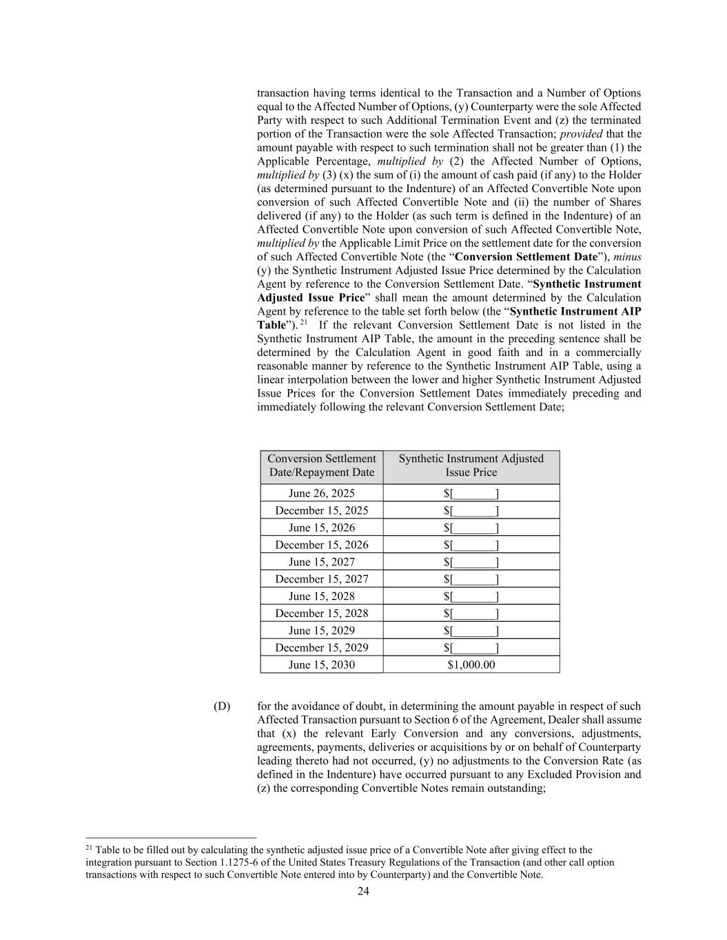 24 transaction having terms identical to the Transaction and a Number of Options equal to the Affected Number of Options, (y) Counterparty were the sole Affected Party with respect to such Additional Termination Event and (z) the terminated portion of the Transaction were the sole Affected Transaction; provided that the amount payable with respect to such termination shall not be greater than (1) the Applicable Percentage, multiplied by (2) the Affected Number of Options, multiplied by (3) (x) the sum of (i) the amount of cash paid (if any) to the Holder (as determined pursuant to the Indenture) of an Affected Convertible Note upon conversion of such Affected Convertible Note and (ii) the number of Shares delivered (if any) to the Holder (as such term is defined in the Indenture) of an Affected Convertible Note upon conversion of such Affected Convertible Note, multiplied by the Applicable Limit Price on the settlement date for the conversion of such Affected Convertible Note (the “Conversion Settlement Date”), minus (y) the Synthetic Instrument Adjusted Issue Price determined by the Calculation Agent by reference to the Conversion Settlement Date. “Synthetic Instrument Adjusted Issue Price” shall mean the amount determined by the Calculation Agent by reference to the table set forth below (the “Synthetic Instrument AIP Table”). 21 If the relevant Conversion Settlement Date is not listed in the Synthetic Instrument AIP Table, the amount in the preceding sentence shall be determined by the Calculation Agent in good faith and in a commercially reasonable manner by reference to the Synthetic Instrument AIP Table, using a linear interpolation between the lower and higher Synthetic Instrument Adjusted Issue Prices for the Conversion Settlement Dates immediately preceding and immediately following the relevant Conversion Settlement Date; Conversion Settlement Date/Repayment Date Synthetic Instrument Adjusted Issue Price June 26, 2025 $[_______] December 15, 2025 $[_______] June 15, 2026 $[_______] December 15, 2026 $[_______] June 15, 2027 $[_______] December 15, 2027 $[_______] June 15, 2028 $[_______] December 15, 2028 $[_______] June 15, 2029 $[_______] December 15, 2029 $[_______] June 15, 2030 $1,000.00 (D) for the avoidance of doubt, in determining the amount payable in respect of such Affected Transaction pursuant to Section 6 of the Agreement, Dealer shall assume that (x) the relevant Early Conversion and any conversions, adjustments, agreements, payments, deliveries or acquisitions by or on behalf of Counterparty leading thereto had not occurred, (y) no adjustments to the Conversion Rate (as defined in the Indenture) have occurred pursuant to any Excluded Provision and (z) the corresponding Convertible Notes remain outstanding; 21 Table to be filled out by calculating the synthetic adjusted issue price of a Convertible Note after giving effect to the integration pursuant to Section 1.1275-6 of the United States Treasury Regulations of the Transaction (and other call option transactions with respect to such Convertible Note entered into by Counterparty) and the Convertible Note.