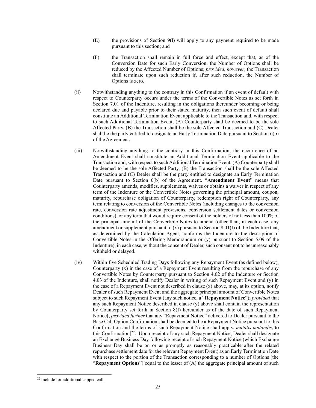 25 (E) the provisions of Section 9(l) will apply to any payment required to be made pursuant to this section; and (F) the Transaction shall remain in full force and effect, except that, as of the Conversion Date for such Early Conversion, the Number of Options shall be reduced by the Affected Number of Options; provided, however, the Transaction shall terminate upon such reduction if, after such reduction, the Number of Options is zero. (ii) Notwithstanding anything to the contrary in this Confirmation if an event of default with respect to Counterparty occurs under the terms of the Convertible Notes as set forth in Section 7.01 of the Indenture, resulting in the obligations thereunder becoming or being declared due and payable prior to their stated maturity, then such event of default shall constitute an Additional Termination Event applicable to the Transaction and, with respect to such Additional Termination Event, (A) Counterparty shall be deemed to be the sole Affected Party, (B) the Transaction shall be the sole Affected Transaction and (C) Dealer shall be the party entitled to designate an Early Termination Date pursuant to Section 6(b) of the Agreement. (iii) Notwithstanding anything to the contrary in this Confirmation, the occurrence of an Amendment Event shall constitute an Additional Termination Event applicable to the Transaction and, with respect to such Additional Termination Event, (A) Counterparty shall be deemed to be the sole Affected Party, (B) the Transaction shall be the sole Affected Transaction and (C) Dealer shall be the party entitled to designate an Early Termination Date pursuant to Section 6(b) of the Agreement. “Amendment Event” means that Counterparty amends, modifies, supplements, waives or obtains a waiver in respect of any term of the Indenture or the Convertible Notes governing the principal amount, coupon, maturity, repurchase obligation of Counterparty, redemption right of Counterparty, any term relating to conversion of the Convertible Notes (including changes to the conversion rate, conversion rate adjustment provisions, conversion settlement dates or conversion conditions), or any term that would require consent of the holders of not less than 100% of the principal amount of the Convertible Notes to amend (other than, in each case, any amendment or supplement pursuant to (x) pursuant to Section 8.01(I) of the Indenture that, as determined by the Calculation Agent, conforms the Indenture to the description of Convertible Notes in the Offering Memorandum or (y) pursuant to Section 5.09 of the Indenture), in each case, without the consent of Dealer, such consent not to be unreasonably withheld or delayed. (iv) Within five Scheduled Trading Days following any Repayment Event (as defined below), Counterparty (x) in the case of a Repayment Event resulting from the repurchase of any Convertible Notes by Counterparty pursuant to Section 4.02 of the Indenture or Section 4.03 of the Indenture, shall notify Dealer in writing of such Repayment Event and (y) in the case of a Repayment Event not described in clause (x) above, may, at its option, notify Dealer of such Repayment Event and the aggregate principal amount of Convertible Notes subject to such Repayment Event (any such notice, a “Repayment Notice”); provided that any such Repayment Notice described in clause (y) above shall contain the representation by Counterparty set forth in Section 8(f) hereunder as of the date of such Repayment Notice[; provided further that any “Repayment Notice” delivered to Dealer pursuant to the Base Call Option Confirmation shall be deemed to be a Repayment Notice pursuant to this Confirmation and the terms of such Repayment Notice shall apply, mutatis mutandis, to this Confirmation]22. Upon receipt of any such Repayment Notice, Dealer shall designate an Exchange Business Day following receipt of such Repayment Notice (which Exchange Business Day shall be on or as promptly as reasonably practicable after the related repurchase settlement date for the relevant Repayment Event) as an Early Termination Date with respect to the portion of the Transaction corresponding to a number of Options (the “Repayment Options”) equal to the lesser of (A) the aggregate principal amount of such 22 Include for additional capped call.