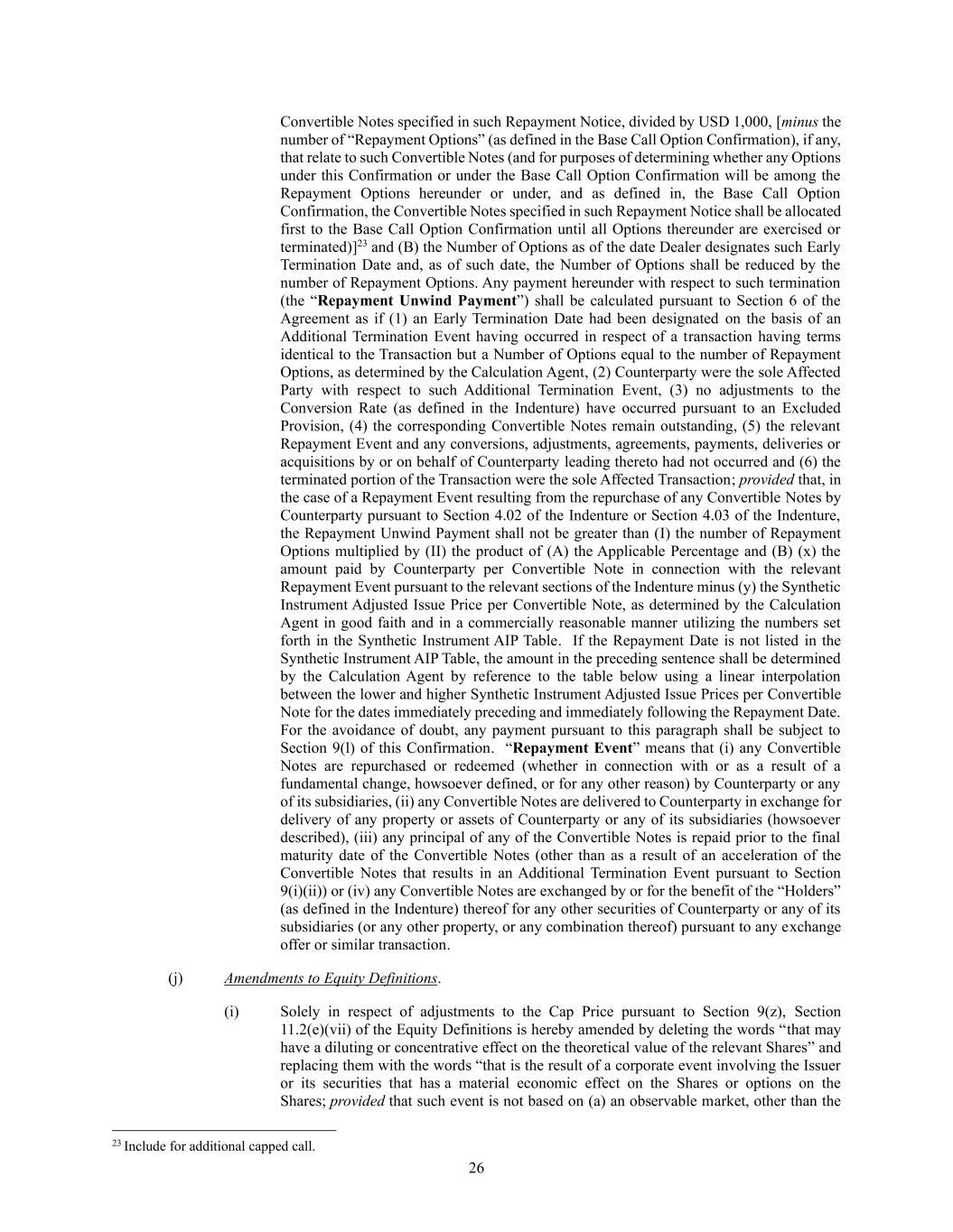 26 Convertible Notes specified in such Repayment Notice, divided by USD 1,000, [minus the number of “Repayment Options” (as defined in the Base Call Option Confirmation), if any, that relate to such Convertible Notes (and for purposes of determining whether any Options under this Confirmation or under the Base Call Option Confirmation will be among the Repayment Options hereunder or under, and as defined in, the Base Call Option Confirmation, the Convertible Notes specified in such Repayment Notice shall be allocated first to the Base Call Option Confirmation until all Options thereunder are exercised or terminated)]23 and (B) the Number of Options as of the date Dealer designates such Early Termination Date and, as of such date, the Number of Options shall be reduced by the number of Repayment Options. Any payment hereunder with respect to such termination (the “Repayment Unwind Payment”) shall be calculated pursuant to Section 6 of the Agreement as if (1) an Early Termination Date had been designated on the basis of an Additional Termination Event having occurred in respect of a transaction having terms identical to the Transaction but a Number of Options equal to the number of Repayment Options, as determined by the Calculation Agent, (2) Counterparty were the sole Affected Party with respect to such Additional Termination Event, (3) no adjustments to the Conversion Rate (as defined in the Indenture) have occurred pursuant to an Excluded Provision, (4) the corresponding Convertible Notes remain outstanding, (5) the relevant Repayment Event and any conversions, adjustments, agreements, payments, deliveries or acquisitions by or on behalf of Counterparty leading thereto had not occurred and (6) the terminated portion of the Transaction were the sole Affected Transaction; provided that, in the case of a Repayment Event resulting from the repurchase of any Convertible Notes by Counterparty pursuant to Section 4.02 of the Indenture or Section 4.03 of the Indenture, the Repayment Unwind Payment shall not be greater than (I) the number of Repayment Options multiplied by (II) the product of (A) the Applicable Percentage and (B) (x) the amount paid by Counterparty per Convertible Note in connection with the relevant Repayment Event pursuant to the relevant sections of the Indenture minus (y) the Synthetic Instrument Adjusted Issue Price per Convertible Note, as determined by the Calculation Agent in good faith and in a commercially reasonable manner utilizing the numbers set forth in the Synthetic Instrument AIP Table. If the Repayment Date is not listed in the Synthetic Instrument AIP Table, the amount in the preceding sentence shall be determined by the Calculation Agent by reference to the table below using a linear interpolation between the lower and higher Synthetic Instrument Adjusted Issue Prices per Convertible Note for the dates immediately preceding and immediately following the Repayment Date. For the avoidance of doubt, any payment pursuant to this paragraph shall be subject to Section 9(l) of this Confirmation. “Repayment Event” means that (i) any Convertible Notes are repurchased or redeemed (whether in connection with or as a result of a fundamental change, howsoever defined, or for any other reason) by Counterparty or any of its subsidiaries, (ii) any Convertible Notes are delivered to Counterparty in exchange for delivery of any property or assets of Counterparty or any of its subsidiaries (howsoever described), (iii) any principal of any of the Convertible Notes is repaid prior to the final maturity date of the Convertible Notes (other than as a result of an acceleration of the Convertible Notes that results in an Additional Termination Event pursuant to Section 9(i)(ii)) or (iv) any Convertible Notes are exchanged by or for the benefit of the “Holders” (as defined in the Indenture) thereof for any other securities of Counterparty or any of its subsidiaries (or any other property, or any combination thereof) pursuant to any exchange offer or similar transaction. (j) Amendments to Equity Definitions. (i) Solely in respect of adjustments to the Cap Price pursuant to Section 9(z), Section 11.2(e)(vii) of the Equity Definitions is hereby amended by deleting the words “that may have a diluting or concentrative effect on the theoretical value of the relevant Shares” and replacing them with the words “that is the result of a corporate event involving the Issuer or its securities that has a material economic effect on the Shares or options on the Shares; provided that such event is not based on (a) an observable market, other than the 23 Include for additional capped call.