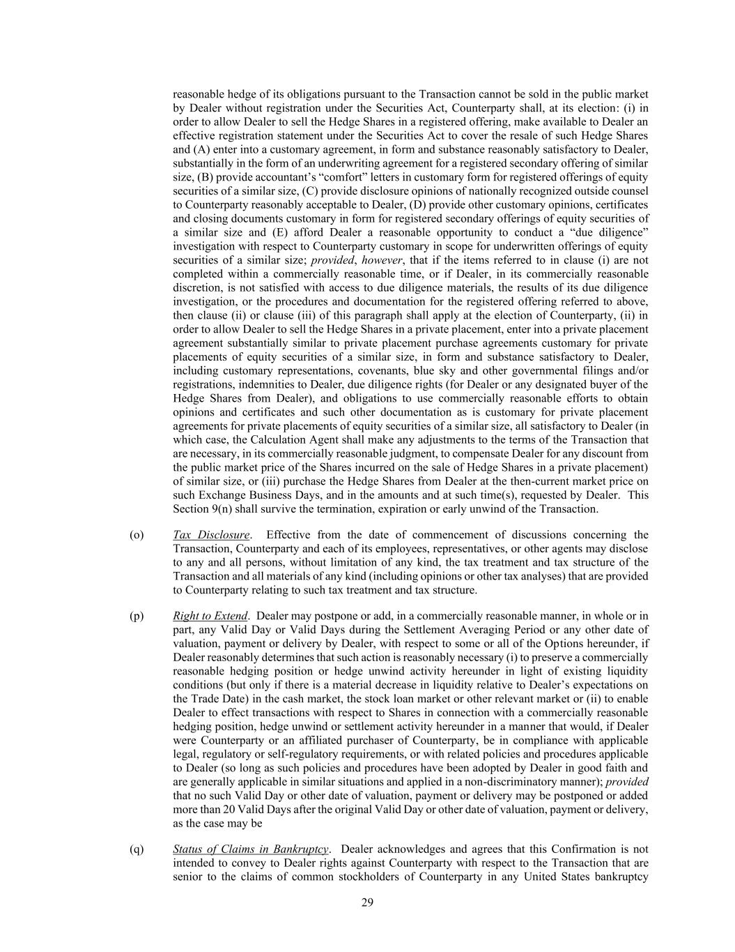 29 reasonable hedge of its obligations pursuant to the Transaction cannot be sold in the public market by Dealer without registration under the Securities Act, Counterparty shall, at its election: (i) in order to allow Dealer to sell the Hedge Shares in a registered offering, make available to Dealer an effective registration statement under the Securities Act to cover the resale of such Hedge Shares and (A) enter into a customary agreement, in form and substance reasonably satisfactory to Dealer, substantially in the form of an underwriting agreement for a registered secondary offering of similar size, (B) provide accountant’s “comfort” letters in customary form for registered offerings of equity securities of a similar size, (C) provide disclosure opinions of nationally recognized outside counsel to Counterparty reasonably acceptable to Dealer, (D) provide other customary opinions, certificates and closing documents customary in form for registered secondary offerings of equity securities of a similar size and (E) afford Dealer a reasonable opportunity to conduct a “due diligence” investigation with respect to Counterparty customary in scope for underwritten offerings of equity securities of a similar size; provided, however, that if the items referred to in clause (i) are not completed within a commercially reasonable time, or if Dealer, in its commercially reasonable discretion, is not satisfied with access to due diligence materials, the results of its due diligence investigation, or the procedures and documentation for the registered offering referred to above, then clause (ii) or clause (iii) of this paragraph shall apply at the election of Counterparty, (ii) in order to allow Dealer to sell the Hedge Shares in a private placement, enter into a private placement agreement substantially similar to private placement purchase agreements customary for private placements of equity securities of a similar size, in form and substance satisfactory to Dealer, including customary representations, covenants, blue sky and other governmental filings and/or registrations, indemnities to Dealer, due diligence rights (for Dealer or any designated buyer of the Hedge Shares from Dealer), and obligations to use commercially reasonable efforts to obtain opinions and certificates and such other documentation as is customary for private placement agreements for private placements of equity securities of a similar size, all satisfactory to Dealer (in which case, the Calculation Agent shall make any adjustments to the terms of the Transaction that are necessary, in its commercially reasonable judgment, to compensate Dealer for any discount from the public market price of the Shares incurred on the sale of Hedge Shares in a private placement) of similar size, or (iii) purchase the Hedge Shares from Dealer at the then-current market price on such Exchange Business Days, and in the amounts and at such time(s), requested by Dealer. This Section 9(n) shall survive the termination, expiration or early unwind of the Transaction. (o) Tax Disclosure. Effective from the date of commencement of discussions concerning the Transaction, Counterparty and each of its employees, representatives, or other agents may disclose to any and all persons, without limitation of any kind, the tax treatment and tax structure of the Transaction and all materials of any kind (including opinions or other tax analyses) that are provided to Counterparty relating to such tax treatment and tax structure. (p) Right to Extend. Dealer may postpone or add, in a commercially reasonable manner, in whole or in part, any Valid Day or Valid Days during the Settlement Averaging Period or any other date of valuation, payment or delivery by Dealer, with respect to some or all of the Options hereunder, if Dealer reasonably determines that such action is reasonably necessary (i) to preserve a commercially reasonable hedging position or hedge unwind activity hereunder in light of existing liquidity conditions (but only if there is a material decrease in liquidity relative to Dealer’s expectations on the Trade Date) in the cash market, the stock loan market or other relevant market or (ii) to enable Dealer to effect transactions with respect to Shares in connection with a commercially reasonable hedging position, hedge unwind or settlement activity hereunder in a manner that would, if Dealer were Counterparty or an affiliated purchaser of Counterparty, be in compliance with applicable legal, regulatory or self-regulatory requirements, or with related policies and procedures applicable to Dealer (so long as such policies and procedures have been adopted by Dealer in good faith and are generally applicable in similar situations and applied in a non-discriminatory manner); provided that no such Valid Day or other date of valuation, payment or delivery may be postponed or added more than 20 Valid Days after the original Valid Day or other date of valuation, payment or delivery, as the case may be (q) Status of Claims in Bankruptcy. Dealer acknowledges and agrees that this Confirmation is not intended to convey to Dealer rights against Counterparty with respect to the Transaction that are senior to the claims of common stockholders of Counterparty in any United States bankruptcy