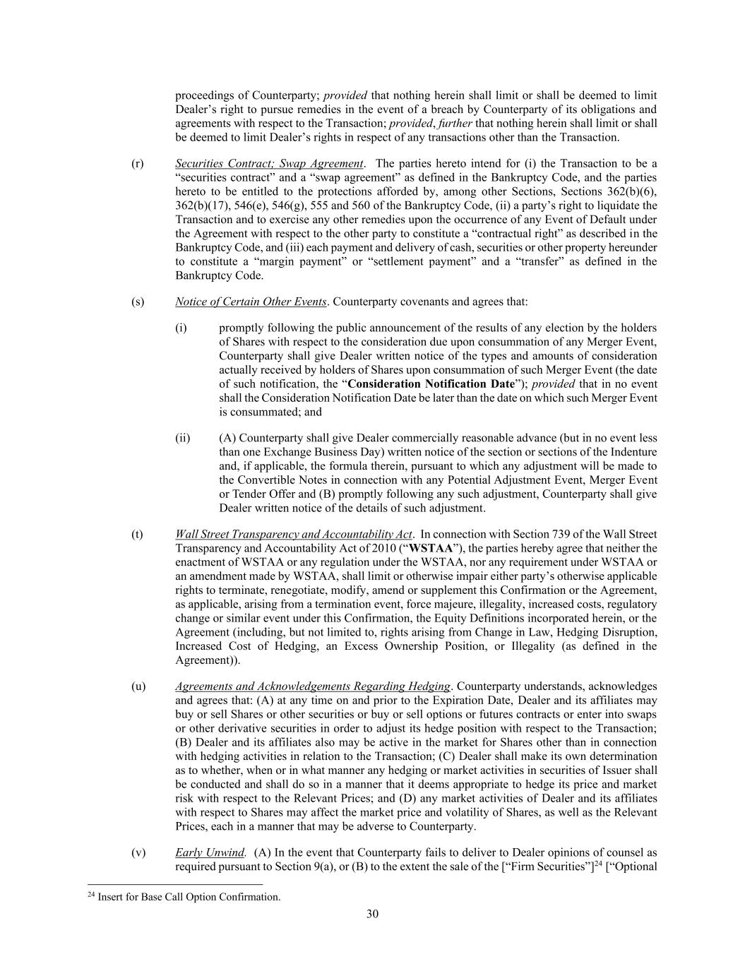 30 proceedings of Counterparty; provided that nothing herein shall limit or shall be deemed to limit Dealer’s right to pursue remedies in the event of a breach by Counterparty of its obligations and agreements with respect to the Transaction; provided, further that nothing herein shall limit or shall be deemed to limit Dealer’s rights in respect of any transactions other than the Transaction. (r) Securities Contract; Swap Agreement. The parties hereto intend for (i) the Transaction to be a “securities contract” and a “swap agreement” as defined in the Bankruptcy Code, and the parties hereto to be entitled to the protections afforded by, among other Sections, Sections 362(b)(6), 362(b)(17), 546(e), 546(g), 555 and 560 of the Bankruptcy Code, (ii) a party’s right to liquidate the Transaction and to exercise any other remedies upon the occurrence of any Event of Default under the Agreement with respect to the other party to constitute a “contractual right” as described in the Bankruptcy Code, and (iii) each payment and delivery of cash, securities or other property hereunder to constitute a “margin payment” or “settlement payment” and a “transfer” as defined in the Bankruptcy Code. (s) Notice of Certain Other Events. Counterparty covenants and agrees that: (i) promptly following the public announcement of the results of any election by the holders of Shares with respect to the consideration due upon consummation of any Merger Event, Counterparty shall give Dealer written notice of the types and amounts of consideration actually received by holders of Shares upon consummation of such Merger Event (the date of such notification, the “Consideration Notification Date”); provided that in no event shall the Consideration Notification Date be later than the date on which such Merger Event is consummated; and (ii) (A) Counterparty shall give Dealer commercially reasonable advance (but in no event less than one Exchange Business Day) written notice of the section or sections of the Indenture and, if applicable, the formula therein, pursuant to which any adjustment will be made to the Convertible Notes in connection with any Potential Adjustment Event, Merger Event or Tender Offer and (B) promptly following any such adjustment, Counterparty shall give Dealer written notice of the details of such adjustment. (t) Wall Street Transparency and Accountability Act. In connection with Section 739 of the Wall Street Transparency and Accountability Act of 2010 (“WSTAA”), the parties hereby agree that neither the enactment of WSTAA or any regulation under the WSTAA, nor any requirement under WSTAA or an amendment made by WSTAA, shall limit or otherwise impair either party’s otherwise applicable rights to terminate, renegotiate, modify, amend or supplement this Confirmation or the Agreement, as applicable, arising from a termination event, force majeure, illegality, increased costs, regulatory change or similar event under this Confirmation, the Equity Definitions incorporated herein, or the Agreement (including, but not limited to, rights arising from Change in Law, Hedging Disruption, Increased Cost of Hedging, an Excess Ownership Position, or Illegality (as defined in the Agreement)). (u) Agreements and Acknowledgements Regarding Hedging. Counterparty understands, acknowledges and agrees that: (A) at any time on and prior to the Expiration Date, Dealer and its affiliates may buy or sell Shares or other securities or buy or sell options or futures contracts or enter into swaps or other derivative securities in order to adjust its hedge position with respect to the Transaction; (B) Dealer and its affiliates also may be active in the market for Shares other than in connection with hedging activities in relation to the Transaction; (C) Dealer shall make its own determination as to whether, when or in what manner any hedging or market activities in securities of Issuer shall be conducted and shall do so in a manner that it deems appropriate to hedge its price and market risk with respect to the Relevant Prices; and (D) any market activities of Dealer and its affiliates with respect to Shares may affect the market price and volatility of Shares, as well as the Relevant Prices, each in a manner that may be adverse to Counterparty. (v) Early Unwind. (A) In the event that Counterparty fails to deliver to Dealer opinions of counsel as required pursuant to Section 9(a), or (B) to the extent the sale of the [“Firm Securities”]24 [“Optional 24 Insert for Base Call Option Confirmation.