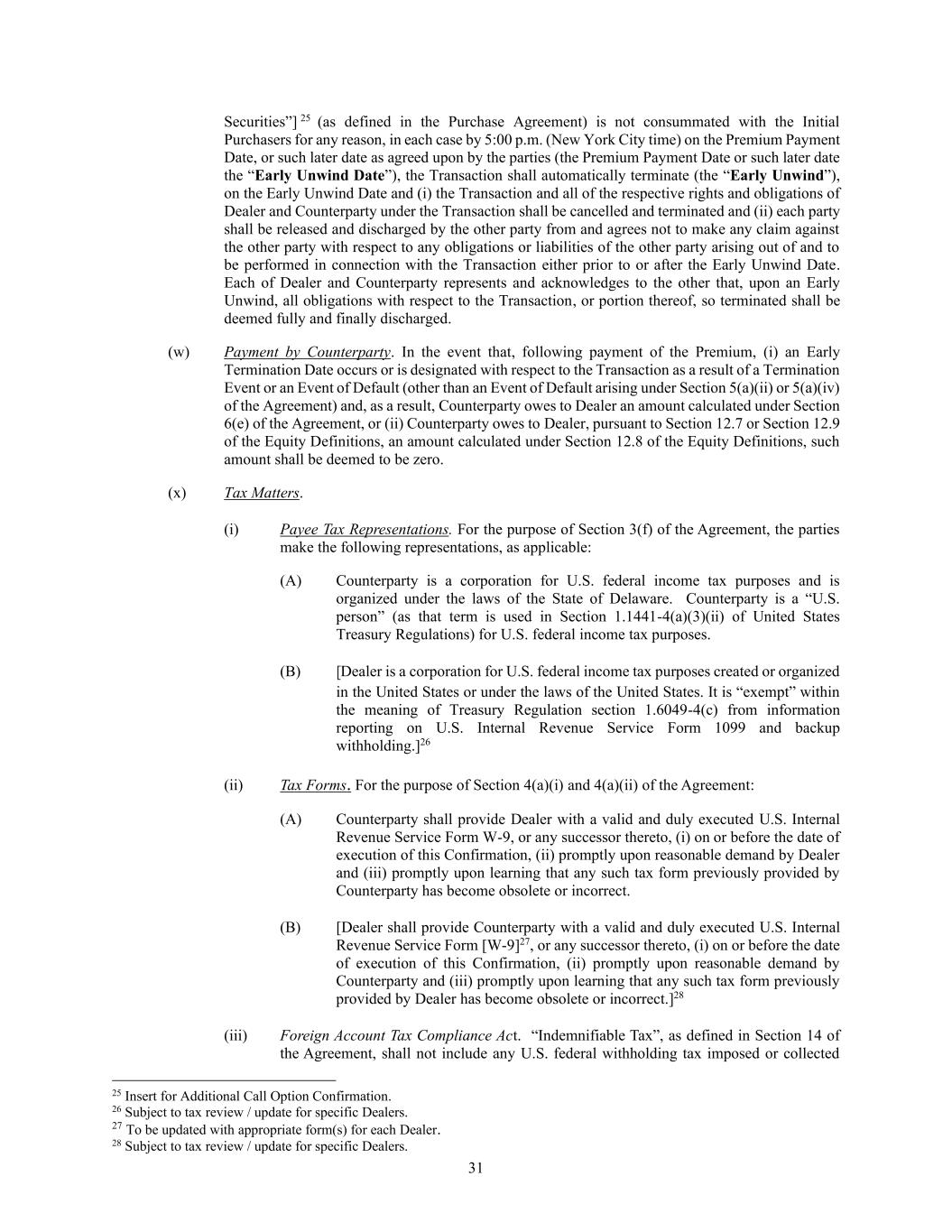 31 Securities”] 25 (as defined in the Purchase Agreement) is not consummated with the Initial Purchasers for any reason, in each case by 5:00 p.m. (New York City time) on the Premium Payment Date, or such later date as agreed upon by the parties (the Premium Payment Date or such later date the “Early Unwind Date”), the Transaction shall automatically terminate (the “Early Unwind”), on the Early Unwind Date and (i) the Transaction and all of the respective rights and obligations of Dealer and Counterparty under the Transaction shall be cancelled and terminated and (ii) each party shall be released and discharged by the other party from and agrees not to make any claim against the other party with respect to any obligations or liabilities of the other party arising out of and to be performed in connection with the Transaction either prior to or after the Early Unwind Date. Each of Dealer and Counterparty represents and acknowledges to the other that, upon an Early Unwind, all obligations with respect to the Transaction, or portion thereof, so terminated shall be deemed fully and finally discharged. (w) Payment by Counterparty. In the event that, following payment of the Premium, (i) an Early Termination Date occurs or is designated with respect to the Transaction as a result of a Termination Event or an Event of Default (other than an Event of Default arising under Section 5(a)(ii) or 5(a)(iv) of the Agreement) and, as a result, Counterparty owes to Dealer an amount calculated under Section 6(e) of the Agreement, or (ii) Counterparty owes to Dealer, pursuant to Section 12.7 or Section 12.9 of the Equity Definitions, an amount calculated under Section 12.8 of the Equity Definitions, such amount shall be deemed to be zero. (x) Tax Matters. (i) Payee Tax Representations. For the purpose of Section 3(f) of the Agreement, the parties make the following representations, as applicable: (A) Counterparty is a corporation for U.S. federal income tax purposes and is organized under the laws of the State of Delaware. Counterparty is a “U.S. person” (as that term is used in Section 1.1441-4(a)(3)(ii) of United States Treasury Regulations) for U.S. federal income tax purposes. (B) [Dealer is a corporation for U.S. federal income tax purposes created or organized in the United States or under the laws of the United States. It is “exempt” within the meaning of Treasury Regulation section 1.6049-4(c) from information reporting on U.S. Internal Revenue Service Form 1099 and backup withholding.]26 (ii) Tax Forms. For the purpose of Section 4(a)(i) and 4(a)(ii) of the Agreement: (A) Counterparty shall provide Dealer with a valid and duly executed U.S. Internal Revenue Service Form W-9, or any successor thereto, (i) on or before the date of execution of this Confirmation, (ii) promptly upon reasonable demand by Dealer and (iii) promptly upon learning that any such tax form previously provided by Counterparty has become obsolete or incorrect. (B) [Dealer shall provide Counterparty with a valid and duly executed U.S. Internal Revenue Service Form [W-9]27, or any successor thereto, (i) on or before the date of execution of this Confirmation, (ii) promptly upon reasonable demand by Counterparty and (iii) promptly upon learning that any such tax form previously provided by Dealer has become obsolete or incorrect.]28 (iii) Foreign Account Tax Compliance Act. “Indemnifiable Tax”, as defined in Section 14 of the Agreement, shall not include any U.S. federal withholding tax imposed or collected 25 Insert for Additional Call Option Confirmation. 26 Subject to tax review / update for specific Dealers. 27 To be updated with appropriate form(s) for each Dealer. 28 Subject to tax review / update for specific Dealers.