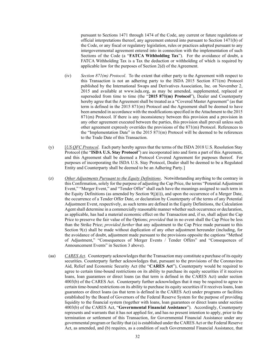 32 pursuant to Sections 1471 through 1474 of the Code, any current or future regulations or official interpretations thereof, any agreement entered into pursuant to Section 1471(b) of the Code, or any fiscal or regulatory legislation, rules or practices adopted pursuant to any intergovernmental agreement entered into in connection with the implementation of such Sections of the Code (a “FATCA Withholding Tax”). For the avoidance of doubt, a FATCA Withholding Tax is a Tax the deduction or withholding of which is required by applicable law for the purposes of Section 2(d) of the Agreement. (iv) Section 871(m) Protocol. To the extent that either party to the Agreement with respect to this Transaction is not an adhering party to the ISDA 2015 Section 871(m) Protocol published by the International Swaps and Derivatives Association, Inc. on November 2, 2015 and available at www.isda.org, as may be amended, supplemented, replaced or superseded from time to time (the “2015 871(m) Protocol”), Dealer and Counterparty hereby agree that the Agreement shall be treated as a “Covered Master Agreement” (as that term is defined in the 2015 871(m) Protocol and the Agreement shall be deemed to have been amended in accordance with the modifications specified in the Attachment to the 2015 871(m) Protocol. If there is any inconsistency between this provision and a provision in any other agreement executed between the parties, this provision shall prevail unless such other agreement expressly overrides the provisions of the 871(m) Protocol. References to the “Implementation Date” in the 2015 871(m) Protocol will be deemed to be references to the Trade Date of this Transaction. (y) [US QFC Protocol. Each party hereby agrees that the terms of the ISDA 2018 U.S. Resolution Stay Protocol (the “ISDA U.S. Stay Protocol”) are incorporated into and form a part of this Agreement, and this Agreement shall be deemed a Protocol Covered Agreement for purposes thereof. For purposes of incorporating the ISDA U.S. Stay Protocol, Dealer shall be deemed to be a Regulated Entity and Counterparty shall be deemed to be an Adhering Party.] (z) Other Adjustments Pursuant to the Equity Definitions. Notwithstanding anything to the contrary in this Confirmation, solely for the purpose of adjusting the Cap Price, the terms “Potential Adjustment Event,” “Merger Event,” and “Tender Offer” shall each have the meanings assigned to such term in the Equity Definitions (as amended by Section 9(j)(i)), and upon the occurrence of a Merger Date, the occurrence of a Tender Offer Date, or declaration by Counterparty of the terms of any Potential Adjustment Event, respectively, as such terms are defined in the Equity Definitions, the Calculation Agent shall determine in a commercially reasonable manner whether such occurrence or declaration, as applicable, has had a material economic effect on the Transaction and, if so, shall adjust the Cap Price to preserve the fair value of the Options; provided that in no event shall the Cap Price be less than the Strike Price; provided further that any adjustment to the Cap Price made pursuant to this Section 9(z) shall be made without duplication of any other adjustment hereunder (including, for the avoidance of doubt, adjustment made pursuant to the provisions opposite the captions “Method of Adjustment,” “Consequences of Merger Events / Tender Offers” and “Consequences of Announcement Events” in Section 3 above). (aa) CARES Act. Counterparty acknowledges that the Transaction may constitute a purchase of its equity securities. Counterparty further acknowledges that, pursuant to the provisions of the Coronavirus Aid, Relief and Economic Security Act (the “CARES Act”), Counterparty would be required to agree to certain time-bound restrictions on its ability to purchase its equity securities if it receives loans, loan guarantees or direct loans (as that term is defined in the CARES Act) under section 4003(b) of the CARES Act. Counterparty further acknowledges that it may be required to agree to certain time-bound restrictions on its ability to purchase its equity securities if it receives loans, loan guarantees or direct loans (as that term is defined in the CARES Act) under programs or facilities established by the Board of Governors of the Federal Reserve System for the purpose of providing liquidity to the financial system (together with loans, loan guarantees or direct loans under section 4003(b) of the CARES Act, “Governmental Financial Assistance”). Accordingly, Counterparty represents and warrants that it has not applied for, and has no present intention to apply, prior to the termination or settlement of this Transaction, for Governmental Financial Assistance under any governmental program or facility that (a) is established under the CARES Act or the Federal Reserve Act, as amended, and (b) requires, as a condition of such Governmental Financial Assistance, that