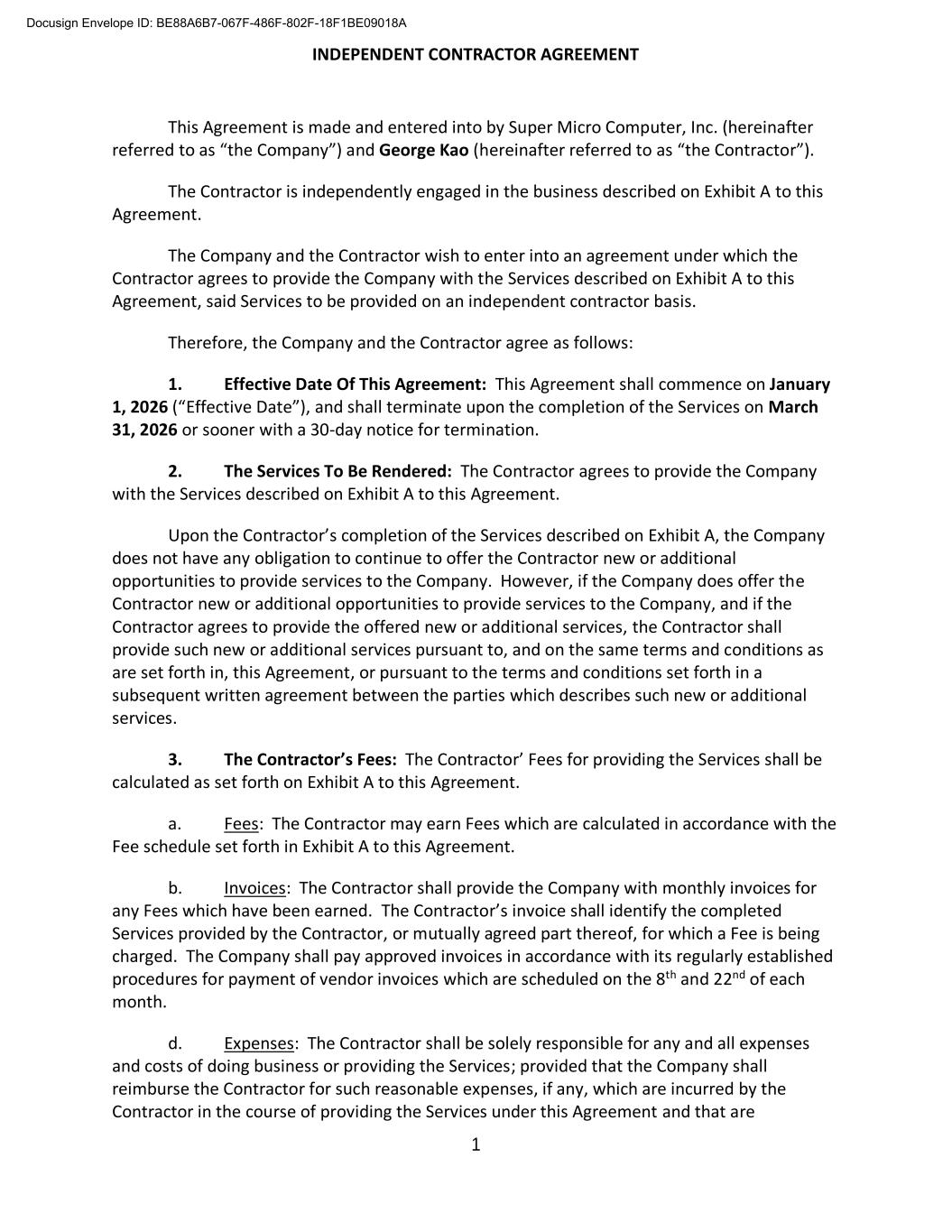 INDEPENDENT CONTRACTOR AGREEMENT 1 This Agreement is made and entered into by Super Micro Computer, Inc. (hereinafter referred to as “the Company”) and George Kao (hereinafter referred to as “the Contractor”). The Contractor is independently engaged in the business described on Exhibit A to this Agreement. The Company and the Contractor wish to enter into an agreement under which the Contractor agrees to provide the Company with the Services described on Exhibit A to this Agreement, said Services to be provided on an independent contractor basis. Therefore, the Company and the Contractor agree as follows: 1. Effective Date Of This Agreement: This Agreement shall commence on January 1, 2026 (“Effective Date”), and shall terminate upon the completion of the Services on March 31, 2026 or sooner with a 30-day notice for termination. 2. The Services To Be Rendered: The Contractor agrees to provide the Company with the Services described on Exhibit A to this Agreement. Upon the Contractor’s completion of the Services described on Exhibit A, the Company does not have any obligation to continue to offer the Contractor new or additional opportunities to provide services to the Company. However, if the Company does offer the Contractor new or additional opportunities to provide services to the Company, and if the Contractor agrees to provide the offered new or additional services, the Contractor shall provide such new or additional services pursuant to, and on the same terms and conditions as are set forth in, this Agreement, or pursuant to the terms and conditions set forth in a subsequent written agreement between the parties which describes such new or additional services. 3. The Contractor’s Fees: The Contractor’ Fees for providing the Services shall be calculated as set forth on Exhibit A to this Agreement. a. Fees: The Contractor may earn Fees which are calculated in accordance with the Fee schedule set forth in Exhibit A to this Agreement. b. Invoices: The Contractor shall provide the Company with monthly invoices for any Fees which have been earned. The Contractor’s invoice shall identify the completed Services provided by the Contractor, or mutually agreed part thereof, for which a Fee is being charged. The Company shall pay approved invoices in accordance with its regularly established procedures for payment of vendor invoices which are scheduled on the 8th and 22nd of each month. d. Expenses: The Contractor shall be solely responsible for any and all expenses and costs of doing business or providing the Services; provided that the Company shall reimburse the Contractor for such reasonable expenses, if any, which are incurred by the Contractor in the course of providing the Services under this Agreement and that are Docusign Envelope ID: BE88A6B7-067F-486F-802F-18F1BE09018A