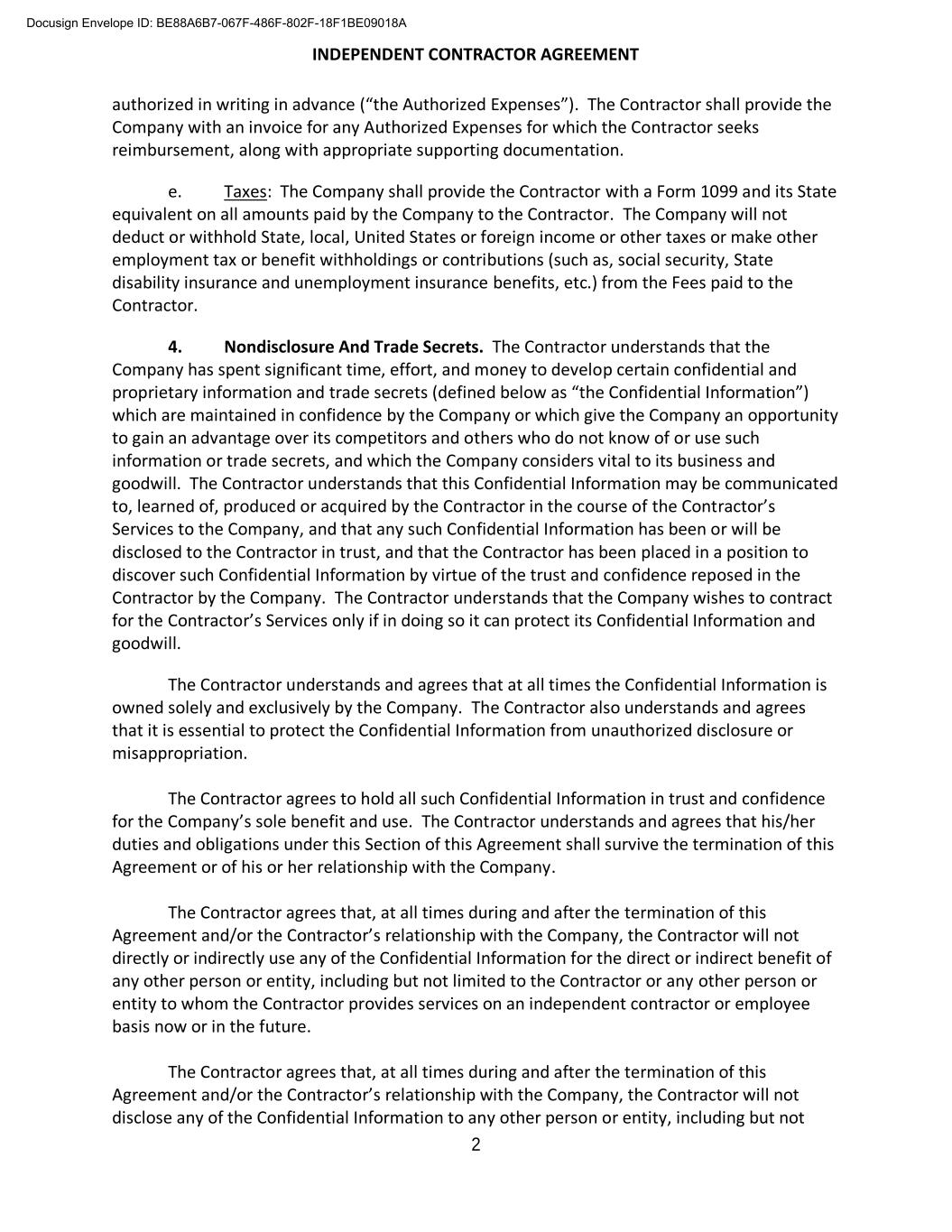 INDEPENDENT CONTRACTOR AGREEMENT 2 authorized in writing in advance (“the Authorized Expenses”). The Contractor shall provide the Company with an invoice for any Authorized Expenses for which the Contractor seeks reimbursement, along with appropriate supporting documentation. e. Taxes: The Company shall provide the Contractor with a Form 1099 and its State equivalent on all amounts paid by the Company to the Contractor. The Company will not deduct or withhold State, local, United States or foreign income or other taxes or make other employment tax or benefit withholdings or contributions (such as, social security, State disability insurance and unemployment insurance benefits, etc.) from the Fees paid to the Contractor. 4. Nondisclosure And Trade Secrets. The Contractor understands that the Company has spent significant time, effort, and money to develop certain confidential and proprietary information and trade secrets (defined below as “the Confidential Information”) which are maintained in confidence by the Company or which give the Company an opportunity to gain an advantage over its competitors and others who do not know of or use such information or trade secrets, and which the Company considers vital to its business and goodwill. The Contractor understands that this Confidential Information may be communicated to, learned of, produced or acquired by the Contractor in the course of the Contractor’s Services to the Company, and that any such Confidential Information has been or will be disclosed to the Contractor in trust, and that the Contractor has been placed in a position to discover such Confidential Information by virtue of the trust and confidence reposed in the Contractor by the Company. The Contractor understands that the Company wishes to contract for the Contractor’s Services only if in doing so it can protect its Confidential Information and goodwill. The Contractor understands and agrees that at all times the Confidential Information is owned solely and exclusively by the Company. The Contractor also understands and agrees that it is essential to protect the Confidential Information from unauthorized disclosure or misappropriation. The Contractor agrees to hold all such Confidential Information in trust and confidence for the Company’s sole benefit and use. The Contractor understands and agrees that his/her duties and obligations under this Section of this Agreement shall survive the termination of this Agreement or of his or her relationship with the Company. The Contractor agrees that, at all times during and after the termination of this Agreement and/or the Contractor’s relationship with the Company, the Contractor will not directly or indirectly use any of the Confidential Information for the direct or indirect benefit of any other person or entity, including but not limited to the Contractor or any other person or entity to whom the Contractor provides services on an independent contractor or employee basis now or in the future. The Contractor agrees that, at all times during and after the termination of this Agreement and/or the Contractor’s relationship with the Company, the Contractor will not disclose any of the Confidential Information to any other person or entity, including but not Docusign Envelope ID: BE88A6B7-067F-486F-802F-18F1BE09018A