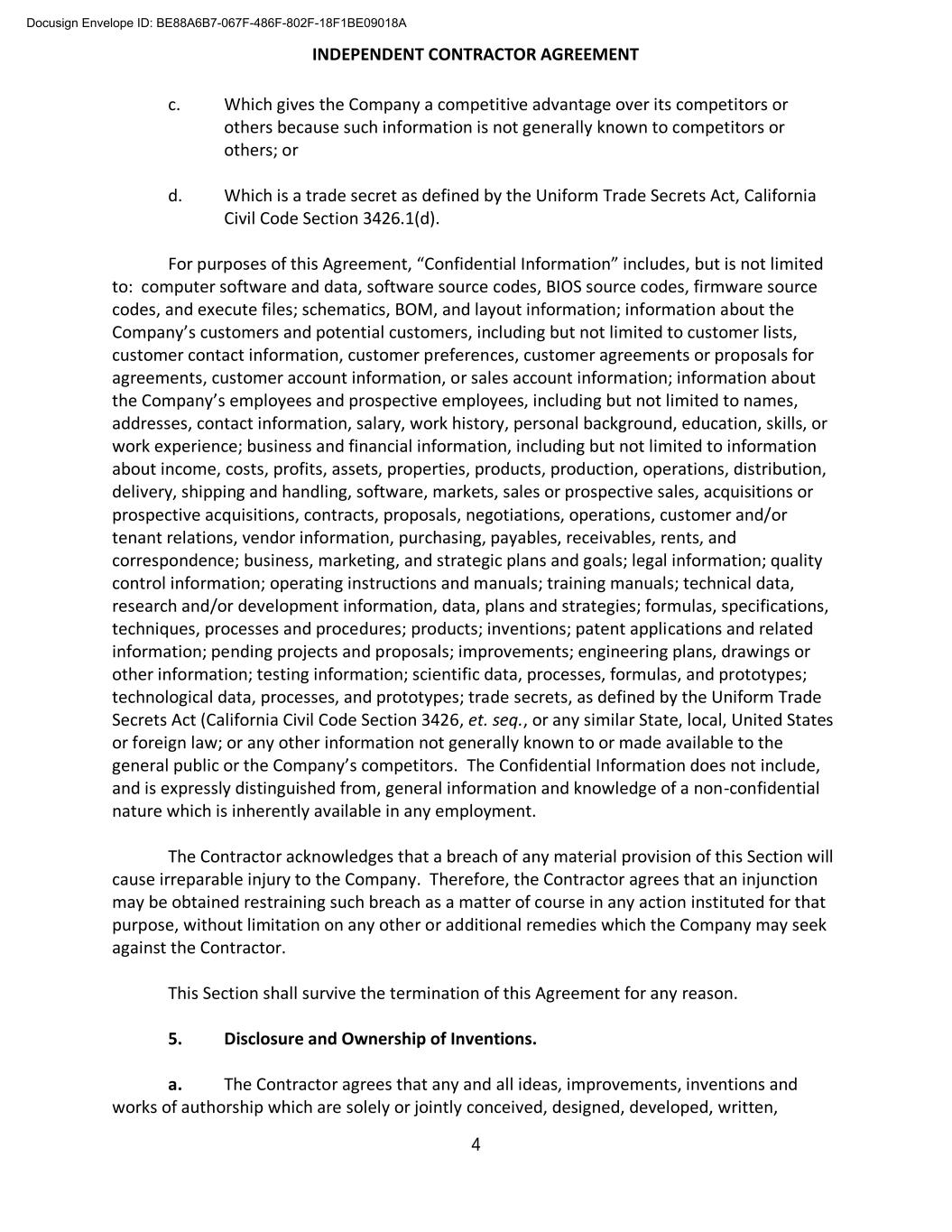 INDEPENDENT CONTRACTOR AGREEMENT 4 c. Which gives the Company a competitive advantage over its competitors or others because such information is not generally known to competitors or others; or d. Which is a trade secret as defined by the Uniform Trade Secrets Act, California Civil Code Section 3426.1(d). For purposes of this Agreement, “Confidential Information” includes, but is not limited to: computer software and data, software source codes, BIOS source codes, firmware source codes, and execute files; schematics, BOM, and layout information; information about the Company’s customers and potential customers, including but not limited to customer lists, customer contact information, customer preferences, customer agreements or proposals for agreements, customer account information, or sales account information; information about the Company’s employees and prospective employees, including but not limited to names, addresses, contact information, salary, work history, personal background, education, skills, or work experience; business and financial information, including but not limited to information about income, costs, profits, assets, properties, products, production, operations, distribution, delivery, shipping and handling, software, markets, sales or prospective sales, acquisitions or prospective acquisitions, contracts, proposals, negotiations, operations, customer and/or tenant relations, vendor information, purchasing, payables, receivables, rents, and correspondence; business, marketing, and strategic plans and goals; legal information; quality control information; operating instructions and manuals; training manuals; technical data, research and/or development information, data, plans and strategies; formulas, specifications, techniques, processes and procedures; products; inventions; patent applications and related information; pending projects and proposals; improvements; engineering plans, drawings or other information; testing information; scientific data, processes, formulas, and prototypes; technological data, processes, and prototypes; trade secrets, as defined by the Uniform Trade Secrets Act (California Civil Code Section 3426, et. seq., or any similar State, local, United States or foreign law; or any other information not generally known to or made available to the general public or the Company’s competitors. The Confidential Information does not include, and is expressly distinguished from, general information and knowledge of a non-confidential nature which is inherently available in any employment. The Contractor acknowledges that a breach of any material provision of this Section will cause irreparable injury to the Company. Therefore, the Contractor agrees that an injunction may be obtained restraining such breach as a matter of course in any action instituted for that purpose, without limitation on any other or additional remedies which the Company may seek against the Contractor. This Section shall survive the termination of this Agreement for any reason. 5. Disclosure and Ownership of Inventions. a. The Contractor agrees that any and all ideas, improvements, inventions and works of authorship which are solely or jointly conceived, designed, developed, written, Docusign Envelope ID: BE88A6B7-067F-486F-802F-18F1BE09018A