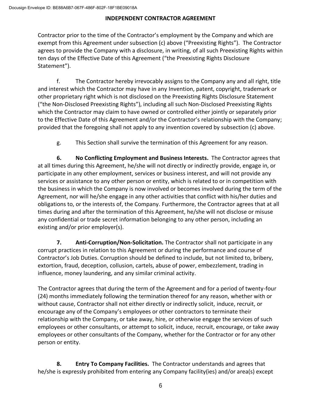 INDEPENDENT CONTRACTOR AGREEMENT 6 Contractor prior to the time of the Contractor’s employment by the Company and which are exempt from this Agreement under subsection (c) above (“Preexisting Rights”). The Contractor agrees to provide the Company with a disclosure, in writing, of all such Preexisting Rights within ten days of the Effective Date of this Agreement (“the Preexisting Rights Disclosure Statement”). f. The Contractor hereby irrevocably assigns to the Company any and all right, title and interest which the Contractor may have in any Invention, patent, copyright, trademark or other proprietary right which is not disclosed on the Preexisting Rights Disclosure Statement (“the Non-Disclosed Preexisting Rights”), including all such Non-Disclosed Preexisting Rights which the Contractor may claim to have owned or controlled either jointly or separately prior to the Effective Date of this Agreement and/or the Contractor’s relationship with the Company; provided that the foregoing shall not apply to any invention covered by subsection (c) above. g. This Section shall survive the termination of this Agreement for any reason. 6. No Conflicting Employment and Business Interests. The Contractor agrees that at all times during this Agreement, he/she will not directly or indirectly provide, engage in, or participate in any other employment, services or business interest, and will not provide any services or assistance to any other person or entity, which is related to or in competition with the business in which the Company is now involved or becomes involved during the term of the Agreement, nor will he/she engage in any other activities that conflict with his/her duties and obligations to, or the interests of, the Company. Furthermore, the Contractor agrees that at all times during and after the termination of this Agreement, he/she will not disclose or misuse any confidential or trade secret information belonging to any other person, including an existing and/or prior employer(s). 7. Anti-Corruption/Non-Solicitation. The Contractor shall not participate in any corrupt practices in relation to this Agreement or during the performance and course of Contractor’s Job Duties. Corruption should be defined to include, but not limited to, bribery, extortion, fraud, deception, collusion, cartels, abuse of power, embezzlement, trading in influence, money laundering, and any similar criminal activity. The Contractor agrees that during the term of the Agreement and for a period of twenty-four (24) months immediately following the termination thereof for any reason, whether with or without cause, Contractor shall not either directly or indirectly solicit, induce, recruit, or encourage any of the Company’s employees or other contractors to terminate their relationship with the Company, or take away, hire, or otherwise engage the services of such employees or other consultants, or attempt to solicit, induce, recruit, encourage, or take away employees or other consultants of the Company, whether for the Contractor or for any other person or entity. 8. Entry To Company Facilities. The Contractor understands and agrees that he/she is expressly prohibited from entering any Company facility(ies) and/or area(s) except Docusign Envelope ID: BE88A6B7-067F-486F-802F-18F1BE09018A