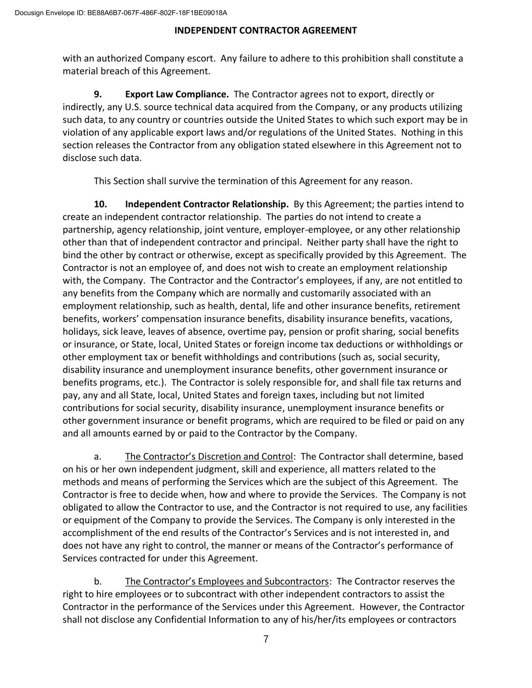INDEPENDENT CONTRACTOR AGREEMENT 7 with an authorized Company escort. Any failure to adhere to this prohibition shall constitute a material breach of this Agreement. 9. Export Law Compliance. The Contractor agrees not to export, directly or indirectly, any U.S. source technical data acquired from the Company, or any products utilizing such data, to any country or countries outside the United States to which such export may be in violation of any applicable export laws and/or regulations of the United States. Nothing in this section releases the Contractor from any obligation stated elsewhere in this Agreement not to disclose such data. This Section shall survive the termination of this Agreement for any reason. 10. Independent Contractor Relationship. By this Agreement; the parties intend to create an independent contractor relationship. The parties do not intend to create a partnership, agency relationship, joint venture, employer-employee, or any other relationship other than that of independent contractor and principal. Neither party shall have the right to bind the other by contract or otherwise, except as specifically provided by this Agreement. The Contractor is not an employee of, and does not wish to create an employment relationship with, the Company. The Contractor and the Contractor’s employees, if any, are not entitled to any benefits from the Company which are normally and customarily associated with an employment relationship, such as health, dental, life and other insurance benefits, retirement benefits, workers’ compensation insurance benefits, disability insurance benefits, vacations, holidays, sick leave, leaves of absence, overtime pay, pension or profit sharing, social benefits or insurance, or State, local, United States or foreign income tax deductions or withholdings or other employment tax or benefit withholdings and contributions (such as, social security, disability insurance and unemployment insurance benefits, other government insurance or benefits programs, etc.). The Contractor is solely responsible for, and shall file tax returns and pay, any and all State, local, United States and foreign taxes, including but not limited contributions for social security, disability insurance, unemployment insurance benefits or other government insurance or benefit programs, which are required to be filed or paid on any and all amounts earned by or paid to the Contractor by the Company. a. The Contractor’s Discretion and Control: The Contractor shall determine, based on his or her own independent judgment, skill and experience, all matters related to the methods and means of performing the Services which are the subject of this Agreement. The Contractor is free to decide when, how and where to provide the Services. The Company is not obligated to allow the Contractor to use, and the Contractor is not required to use, any facilities or equipment of the Company to provide the Services. The Company is only interested in the accomplishment of the end results of the Contractor’s Services and is not interested in, and does not have any right to control, the manner or means of the Contractor’s performance of Services contracted for under this Agreement. b. The Contractor’s Employees and Subcontractors: The Contractor reserves the right to hire employees or to subcontract with other independent contractors to assist the Contractor in the performance of the Services under this Agreement. However, the Contractor shall not disclose any Confidential Information to any of his/her/its employees or contractors Docusign Envelope ID: BE88A6B7-067F-486F-802F-18F1BE09018A
