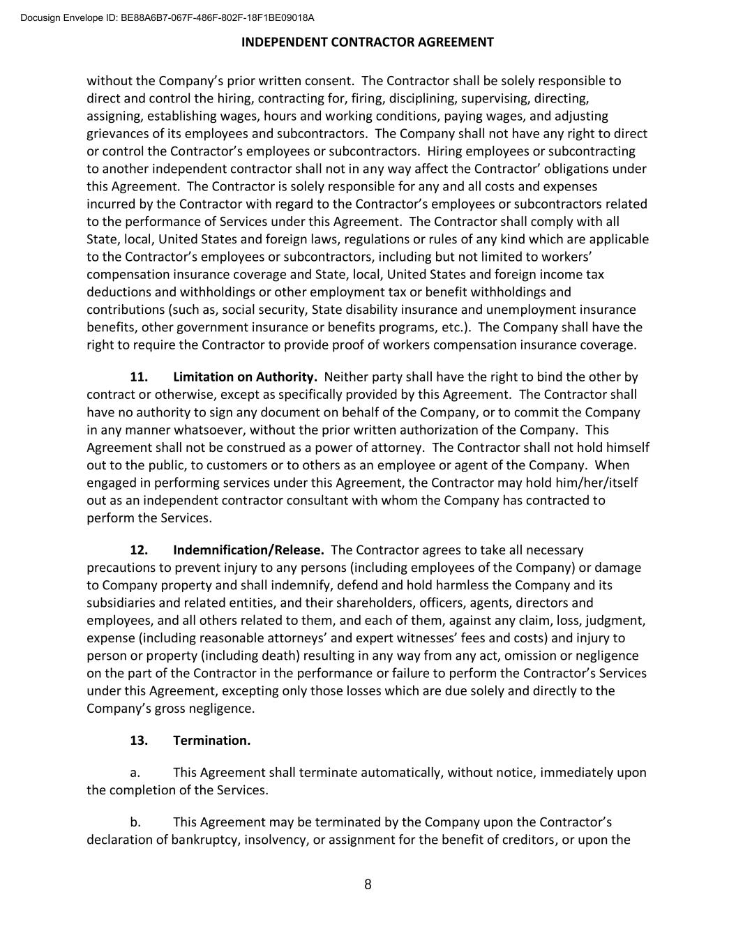 INDEPENDENT CONTRACTOR AGREEMENT 8 without the Company’s prior written consent. The Contractor shall be solely responsible to direct and control the hiring, contracting for, firing, disciplining, supervising, directing, assigning, establishing wages, hours and working conditions, paying wages, and adjusting grievances of its employees and subcontractors. The Company shall not have any right to direct or control the Contractor’s employees or subcontractors. Hiring employees or subcontracting to another independent contractor shall not in any way affect the Contractor’ obligations under this Agreement. The Contractor is solely responsible for any and all costs and expenses incurred by the Contractor with regard to the Contractor’s employees or subcontractors related to the performance of Services under this Agreement. The Contractor shall comply with all State, local, United States and foreign laws, regulations or rules of any kind which are applicable to the Contractor’s employees or subcontractors, including but not limited to workers’ compensation insurance coverage and State, local, United States and foreign income tax deductions and withholdings or other employment tax or benefit withholdings and contributions (such as, social security, State disability insurance and unemployment insurance benefits, other government insurance or benefits programs, etc.). The Company shall have the right to require the Contractor to provide proof of workers compensation insurance coverage. 11. Limitation on Authority. Neither party shall have the right to bind the other by contract or otherwise, except as specifically provided by this Agreement. The Contractor shall have no authority to sign any document on behalf of the Company, or to commit the Company in any manner whatsoever, without the prior written authorization of the Company. This Agreement shall not be construed as a power of attorney. The Contractor shall not hold himself out to the public, to customers or to others as an employee or agent of the Company. When engaged in performing services under this Agreement, the Contractor may hold him/her/itself out as an independent contractor consultant with whom the Company has contracted to perform the Services. 12. Indemnification/Release. The Contractor agrees to take all necessary precautions to prevent injury to any persons (including employees of the Company) or damage to Company property and shall indemnify, defend and hold harmless the Company and its subsidiaries and related entities, and their shareholders, officers, agents, directors and employees, and all others related to them, and each of them, against any claim, loss, judgment, expense (including reasonable attorneys’ and expert witnesses’ fees and costs) and injury to person or property (including death) resulting in any way from any act, omission or negligence on the part of the Contractor in the performance or failure to perform the Contractor’s Services under this Agreement, excepting only those losses which are due solely and directly to the Company’s gross negligence. 13. Termination. a. This Agreement shall terminate automatically, without notice, immediately upon the completion of the Services. b. This Agreement may be terminated by the Company upon the Contractor’s declaration of bankruptcy, insolvency, or assignment for the benefit of creditors, or upon the Docusign Envelope ID: BE88A6B7-067F-486F-802F-18F1BE09018A