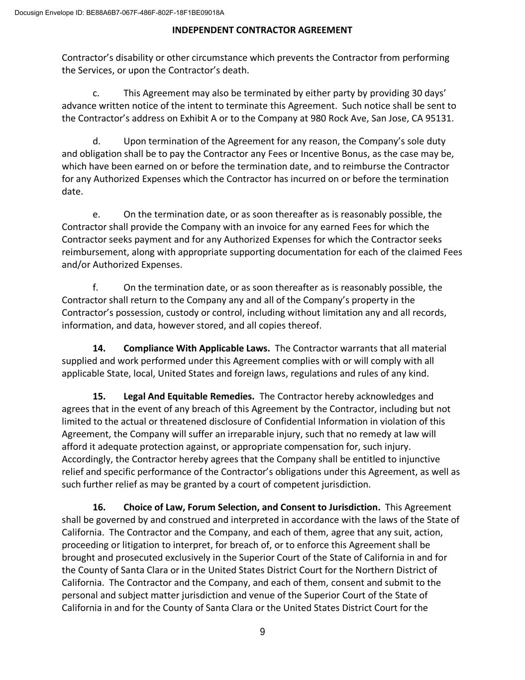 INDEPENDENT CONTRACTOR AGREEMENT 9 Contractor’s disability or other circumstance which prevents the Contractor from performing the Services, or upon the Contractor’s death. c. This Agreement may also be terminated by either party by providing 30 days’ advance written notice of the intent to terminate this Agreement. Such notice shall be sent to the Contractor’s address on Exhibit A or to the Company at 980 Rock Ave, San Jose, CA 95131. d. Upon termination of the Agreement for any reason, the Company’s sole duty and obligation shall be to pay the Contractor any Fees or Incentive Bonus, as the case may be, which have been earned on or before the termination date, and to reimburse the Contractor for any Authorized Expenses which the Contractor has incurred on or before the termination date. e. On the termination date, or as soon thereafter as is reasonably possible, the Contractor shall provide the Company with an invoice for any earned Fees for which the Contractor seeks payment and for any Authorized Expenses for which the Contractor seeks reimbursement, along with appropriate supporting documentation for each of the claimed Fees and/or Authorized Expenses. f. On the termination date, or as soon thereafter as is reasonably possible, the Contractor shall return to the Company any and all of the Company’s property in the Contractor’s possession, custody or control, including without limitation any and all records, information, and data, however stored, and all copies thereof. 14. Compliance With Applicable Laws. The Contractor warrants that all material supplied and work performed under this Agreement complies with or will comply with all applicable State, local, United States and foreign laws, regulations and rules of any kind. 15. Legal And Equitable Remedies. The Contractor hereby acknowledges and agrees that in the event of any breach of this Agreement by the Contractor, including but not limited to the actual or threatened disclosure of Confidential Information in violation of this Agreement, the Company will suffer an irreparable injury, such that no remedy at law will afford it adequate protection against, or appropriate compensation for, such injury. Accordingly, the Contractor hereby agrees that the Company shall be entitled to injunctive relief and specific performance of the Contractor’s obligations under this Agreement, as well as such further relief as may be granted by a court of competent jurisdiction. 16. Choice of Law, Forum Selection, and Consent to Jurisdiction. This Agreement shall be governed by and construed and interpreted in accordance with the laws of the State of California. The Contractor and the Company, and each of them, agree that any suit, action, proceeding or litigation to interpret, for breach of, or to enforce this Agreement shall be brought and prosecuted exclusively in the Superior Court of the State of California in and for the County of Santa Clara or in the United States District Court for the Northern District of California. The Contractor and the Company, and each of them, consent and submit to the personal and subject matter jurisdiction and venue of the Superior Court of the State of California in and for the County of Santa Clara or the United States District Court for the Docusign Envelope ID: BE88A6B7-067F-486F-802F-18F1BE09018A
