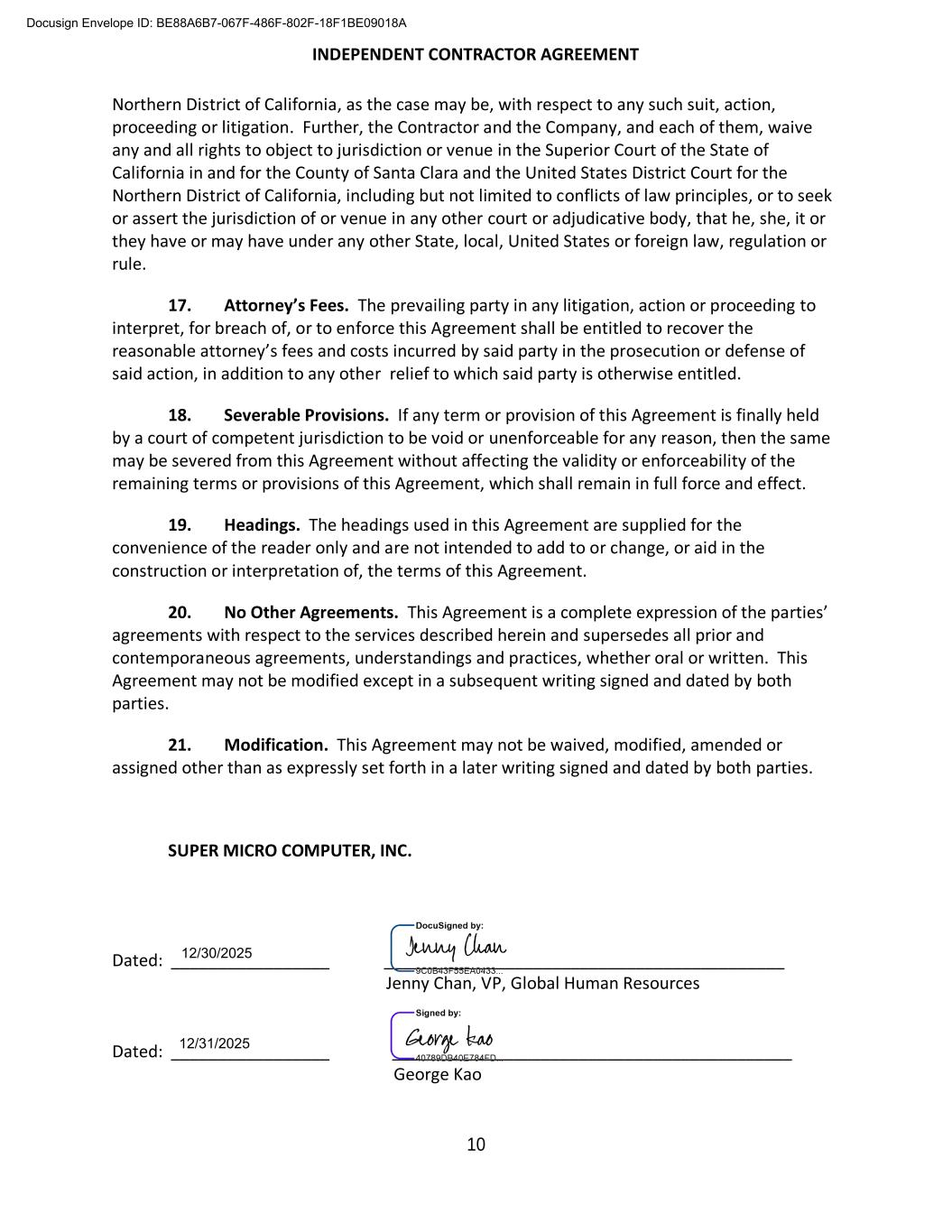 INDEPENDENT CONTRACTOR AGREEMENT 10 Northern District of California, as the case may be, with respect to any such suit, action, proceeding or litigation. Further, the Contractor and the Company, and each of them, waive any and all rights to object to jurisdiction or venue in the Superior Court of the State of California in and for the County of Santa Clara and the United States District Court for the Northern District of California, including but not limited to conflicts of law principles, or to seek or assert the jurisdiction of or venue in any other court or adjudicative body, that he, she, it or they have or may have under any other State, local, United States or foreign law, regulation or rule. 17. Attorney’s Fees. The prevailing party in any litigation, action or proceeding to interpret, for breach of, or to enforce this Agreement shall be entitled to recover the reasonable attorney’s fees and costs incurred by said party in the prosecution or defense of said action, in addition to any other relief to which said party is otherwise entitled. 18. Severable Provisions. If any term or provision of this Agreement is finally held by a court of competent jurisdiction to be void or unenforceable for any reason, then the same may be severed from this Agreement without affecting the validity or enforceability of the remaining terms or provisions of this Agreement, which shall remain in full force and effect. 19. Headings. The headings used in this Agreement are supplied for the convenience of the reader only and are not intended to add to or change, or aid in the construction or interpretation of, the terms of this Agreement. 20. No Other Agreements. This Agreement is a complete expression of the parties’ agreements with respect to the services described herein and supersedes all prior and contemporaneous agreements, understandings and practices, whether oral or written. This Agreement may not be modified except in a subsequent writing signed and dated by both parties. 21. Modification. This Agreement may not be waived, modified, amended or assigned other than as expressly set forth in a later writing signed and dated by both parties. SUPER MICRO COMPUTER, INC. Dated: _________________ ___________________________________________ Jenny Chan, VP, Global Human Resources Dated: _________________ ___________________________________________ George Kao Docusign Envelope ID: BE88A6B7-067F-486F-802F-18F1BE09018A 12/30/2025 12/31/2025