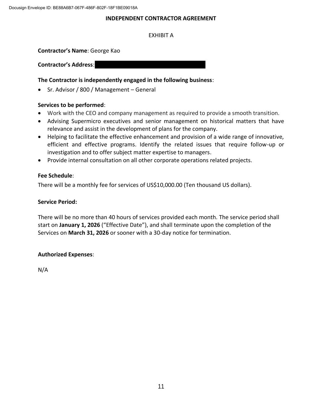 INDEPENDENT CONTRACTOR AGREEMENT 11 EXHIBIT A Contractor’s Name: George Kao Contractor’s Address: 437 Camille Circle #16, San Jose, CA 95134 The Contractor is independently engaged in the following business: • Sr. Advisor / 800 / Management – General Services to be performed: • Work with the CEO and company management as required to provide a smooth transition. • Advising Supermicro executives and senior management on historical matters that have relevance and assist in the development of plans for the company. • Helping to facilitate the effective enhancement and provision of a wide range of innovative, efficient and effective programs. Identify the related issues that require follow-up or investigation and to offer subject matter expertise to managers. • Provide internal consultation on all other corporate operations related projects. Fee Schedule: There will be a monthly fee for services of US$10,000.00 (Ten thousand US dollars). Service Period: There will be no more than 40 hours of services provided each month. The service period shall start on January 1, 2026 (“Effective Date”), and shall terminate upon the completion of the Services on March 31, 2026 or sooner with a 30-day notice for termination. Authorized Expenses: N/A Docusign Envelope ID: BE88A6B7-067F-486F-802F-18F1BE09018A