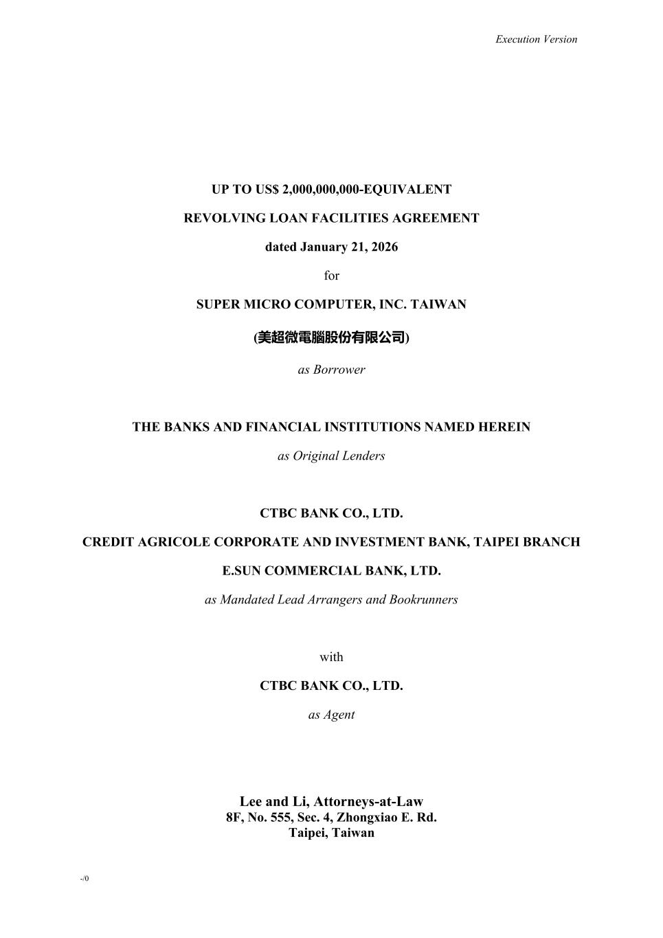 -/0 Execution Version UP TO US$ 2,000,000,000-EQUIVALENT REVOLVING LOAN FACILITIES AGREEMENT dated January 21, 2026 for SUPER MICRO COMPUTER, INC. TAIWAN (美超微電腦股份有限公司) as Borrower THE BANKS AND FINANCIAL INSTITUTIONS NAMED HEREIN as Original Lenders CTBC BANK CO., LTD. CREDIT AGRICOLE CORPORATE AND INVESTMENT BANK, TAIPEI BRANCH E.SUN COMMERCIAL BANK, LTD. as Mandated Lead Arrangers and Bookrunners with CTBC BANK CO., LTD. as Agent Lee and Li, Attorneys-at-Law 8F, No. 555, Sec. 4, Zhongxiao E. Rd. Taipei, Taiwan