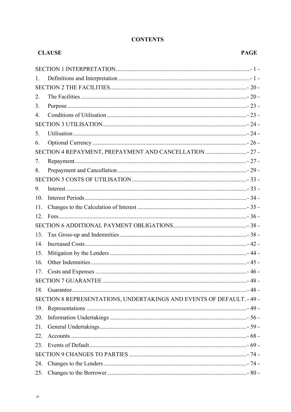 -/0 CONTENTS CLAUSE PAGE SECTION 1 INTERPRETATION ........................................................................................... - 1 - 1. Definitions and Interpretation ......................................................................................... - 1 - SECTION 2 THE FACILITIES............................................................................................. - 20 - 2. The Facilities ................................................................................................................. - 20 - 3. Purpose .......................................................................................................................... - 23 - 4. Conditions of Utilisation ............................................................................................... - 23 - SECTION 3 UTILISATION .................................................................................................. - 24 - 5. Utilisation ...................................................................................................................... - 24 - 6. Optional Currency ......................................................................................................... - 26 - SECTION 4 REPAYMENT, PREPAYMENT AND CANCELLATION ............................ - 27 - 7. Repayment ..................................................................................................................... - 27 - 8. Prepayment and Cancellation ........................................................................................ - 29 - SECTION 5 COSTS OF UTILISATION .............................................................................. - 33 - 9. Interest ........................................................................................................................... - 33 - 10. Interest Periods .............................................................................................................. - 34 - 11. Changes to the Calculation of Interest .......................................................................... - 35 - 12. Fees ................................................................................................................................ - 36 - SECTION 6 ADDITIONAL PAYMENT OBLIGATIONS.................................................. - 38 - 13. Tax Gross-up and Indemnities ...................................................................................... - 38 - 14. Increased Costs .............................................................................................................. - 42 - 15. Mitigation by the Lenders ............................................................................................. - 44 - 16. Other Indemnities .......................................................................................................... - 45 - 17. Costs and Expenses ....................................................................................................... - 46 - SECTION 7 GUARANTEE .................................................................................................. - 48 - 18. Guarantee ....................................................................................................................... - 48 - SECTION 8 REPRESENTATIONS, UNDERTAKINGS AND EVENTS OF DEFAULT . - 49 - 19. Representations ............................................................................................................. - 49 - 20. Information Undertakings ............................................................................................. - 56 - 21. General Undertakings .................................................................................................... - 59 - 22. Accounts ........................................................................................................................ - 68 - 23. Events of Default ........................................................................................................... - 69 - SECTION 9 CHANGES TO PARTIES ................................................................................ - 74 - 24. Changes to the Lenders ................................................................................................. - 74 - 25. Changes to the Borrower ............................................................................................... - 80 -