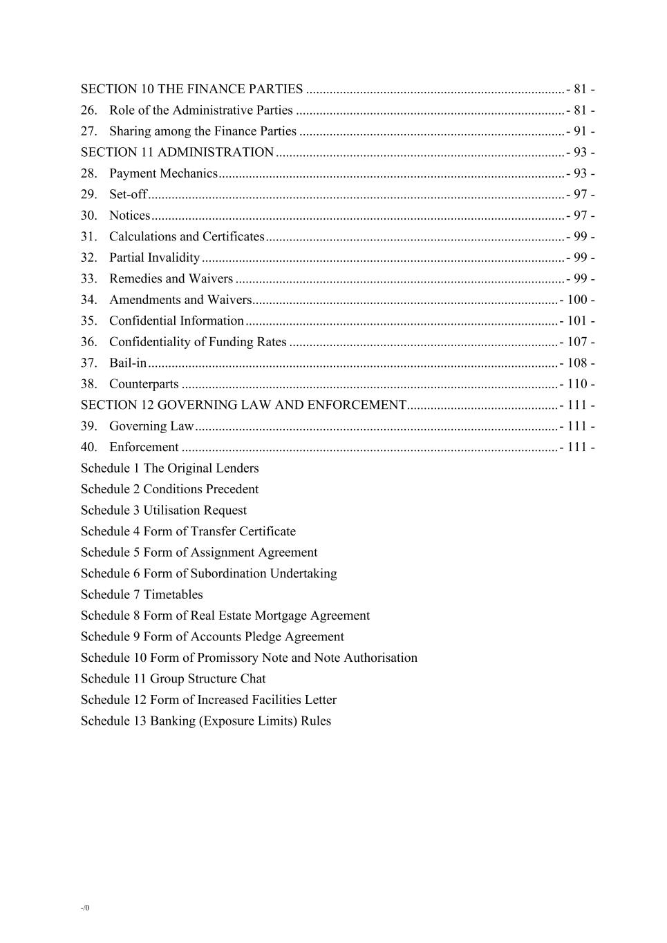 -/0 SECTION 10 THE FINANCE PARTIES ............................................................................. - 81 - 26. Role of the Administrative Parties ................................................................................ - 81 - 27. Sharing among the Finance Parties ............................................................................... - 91 - SECTION 11 ADMINISTRATION ...................................................................................... - 93 - 28. Payment Mechanics ....................................................................................................... - 93 - 29. Set-off ............................................................................................................................ - 97 - 30. Notices ........................................................................................................................... - 97 - 31. Calculations and Certificates ......................................................................................... - 99 - 32. Partial Invalidity ............................................................................................................ - 99 - 33. Remedies and Waivers .................................................................................................. - 99 - 34. Amendments and Waivers ........................................................................................... - 100 - 35. Confidential Information ............................................................................................. - 101 - 36. Confidentiality of Funding Rates ................................................................................ - 107 - 37. Bail-in .......................................................................................................................... - 108 - 38. Counterparts ................................................................................................................ - 110 - SECTION 12 GOVERNING LAW AND ENFORCEMENT............................................. - 111 - 39. Governing Law ............................................................................................................ - 111 - 40. Enforcement ................................................................................................................ - 111 - Schedule 1 The Original Lenders Schedule 2 Conditions Precedent Schedule 3 Utilisation Request Schedule 4 Form of Transfer Certificate Schedule 5 Form of Assignment Agreement Schedule 6 Form of Subordination Undertaking Schedule 7 Timetables Schedule 8 Form of Real Estate Mortgage Agreement Schedule 9 Form of Accounts Pledge Agreement Schedule 10 Form of Promissory Note and Note Authorisation Schedule 11 Group Structure Chat Schedule 12 Form of Increased Facilities Letter Schedule 13 Banking (Exposure Limits) Rules
