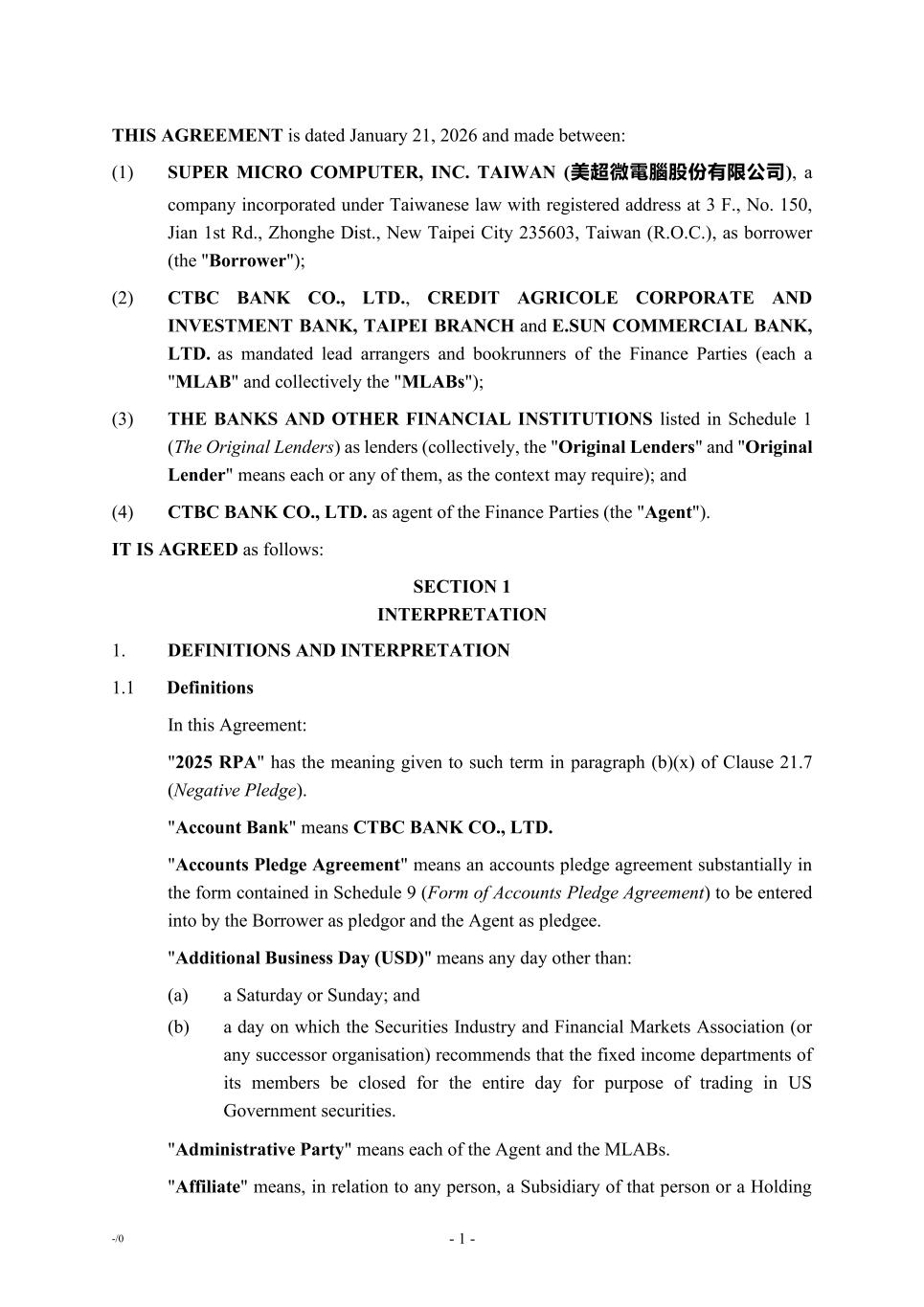 -/0 - 1 - THIS AGREEMENT is dated January 21, 2026 and made between: (1) SUPER MICRO COMPUTER, INC. TAIWAN (美超微電腦股份有限公司), a company incorporated under Taiwanese law with registered address at 3 F., No. 150, Jian 1st Rd., Zhonghe Dist., New Taipei City 235603, Taiwan (R.O.C.), as borrower (the "Borrower"); (2) CTBC BANK CO., LTD., CREDIT AGRICOLE CORPORATE AND INVESTMENT BANK, TAIPEI BRANCH and E.SUN COMMERCIAL BANK, LTD. as mandated lead arrangers and bookrunners of the Finance Parties (each a "MLAB" and collectively the "MLABs"); (3) THE BANKS AND OTHER FINANCIAL INSTITUTIONS listed in Schedule 1 (The Original Lenders) as lenders (collectively, the "Original Lenders" and "Original Lender" means each or any of them, as the context may require); and (4) CTBC BANK CO., LTD. as agent of the Finance Parties (the "Agent"). IT IS AGREED as follows: SECTION 1 INTERPRETATION 1. DEFINITIONS AND INTERPRETATION 1.1 Definitions In this Agreement: "2025 RPA" has the meaning given to such term in paragraph (b)(x) of Clause 21.7 (Negative Pledge). "Account Bank" means CTBC BANK CO., LTD. "Accounts Pledge Agreement" means an accounts pledge agreement substantially in the form contained in Schedule 9 (Form of Accounts Pledge Agreement) to be entered into by the Borrower as pledgor and the Agent as pledgee. "Additional Business Day (USD)" means any day other than: (a) a Saturday or Sunday; and (b) a day on which the Securities Industry and Financial Markets Association (or any successor organisation) recommends that the fixed income departments of its members be closed for the entire day for purpose of trading in US Government securities. "Administrative Party" means each of the Agent and the MLABs. "Affiliate" means, in relation to any person, a Subsidiary of that person or a Holding