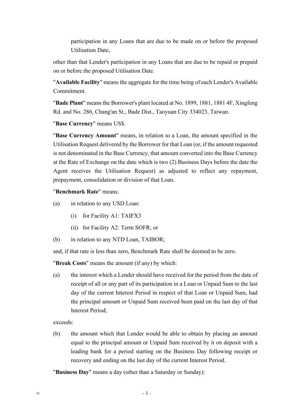 -/0 - 3 - participation in any Loans that are due to be made on or before the proposed Utilisation Date, other than that Lender's participation in any Loans that are due to be repaid or prepaid on or before the proposed Utilisation Date. "Available Facility" means the aggregate for the time being of each Lender's Available Commitment. "Bade Plant" means the Borrower's plant located at No. 1899, 1881, 1881 4F, Xingfeng Rd. and No. 286, Chang'an St., Bade Dist., Taoyuan City 334023, Taiwan. "Base Currency" means US$. "Base Currency Amount" means, in relation to a Loan, the amount specified in the Utilisation Request delivered by the Borrower for that Loan (or, if the amount requested is not denominated in the Base Currency, that amount converted into the Base Currency at the Rate of Exchange on the date which is two (2) Business Days before the date the Agent receives the Utilisation Request) as adjusted to reflect any repayment, prepayment, consolidation or division of that Loan. "Benchmark Rate" means: (a) in relation to any USD Loan: (i) for Facility A1: TAIFX3 (ii) for Facility A2: Term SOFR; or (b) in relation to any NTD Loan, TAIBOR; and, if that rate is less than zero, Benchmark Rate shall be deemed to be zero. "Break Costs" means the amount (if any) by which: (a) the interest which a Lender should have received for the period from the date of receipt of all or any part of its participation in a Loan or Unpaid Sum to the last day of the current Interest Period in respect of that Loan or Unpaid Sum, had the principal amount or Unpaid Sum received been paid on the last day of that Interest Period; exceeds: (b) the amount which that Lender would be able to obtain by placing an amount equal to the principal amount or Unpaid Sum received by it on deposit with a leading bank for a period starting on the Business Day following receipt or recovery and ending on the last day of the current Interest Period. "Business Day" means a day (other than a Saturday or Sunday):