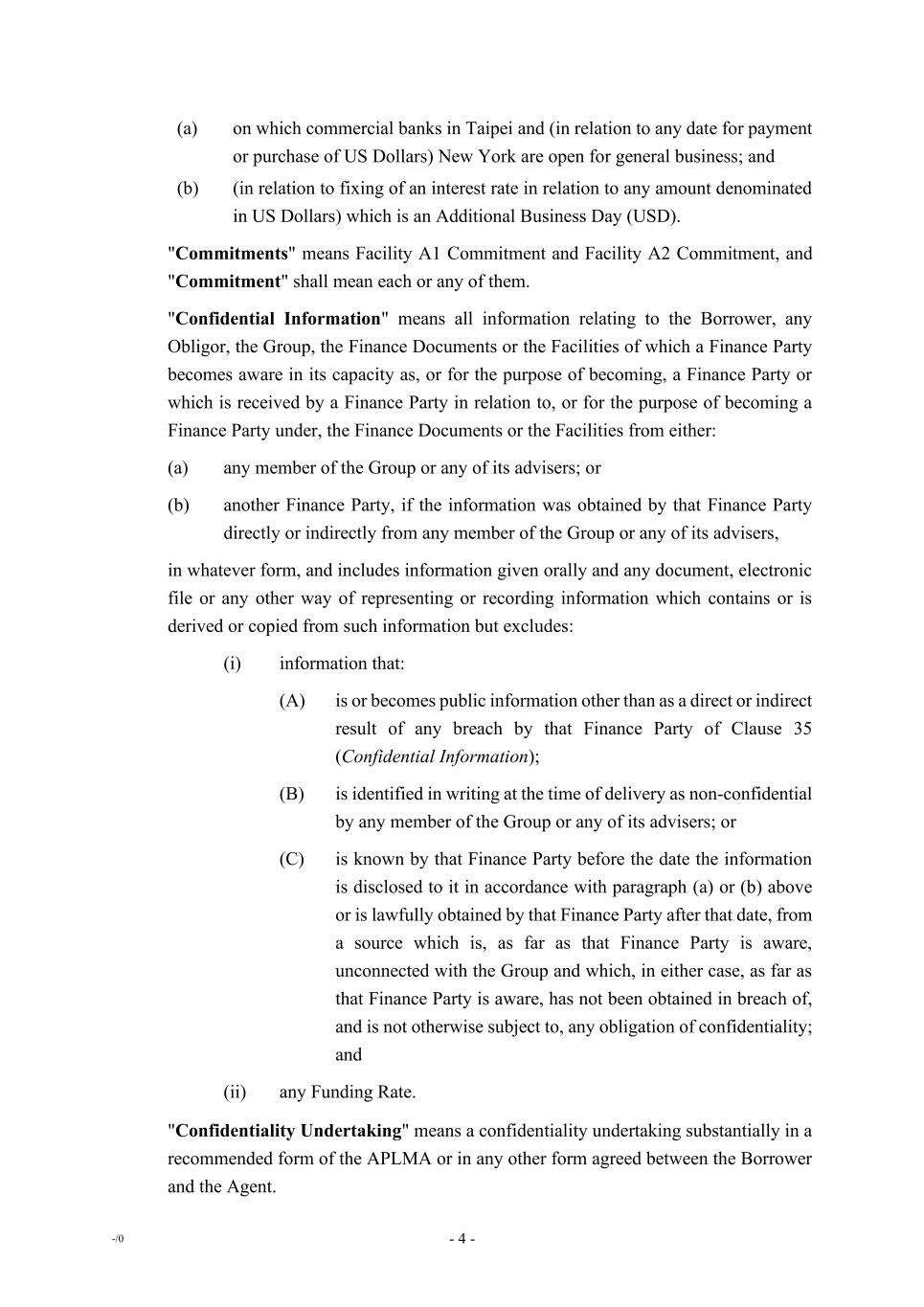 -/0 - 4 - (a) on which commercial banks in Taipei and (in relation to any date for payment or purchase of US Dollars) New York are open for general business; and (b) (in relation to fixing of an interest rate in relation to any amount denominated in US Dollars) which is an Additional Business Day (USD). "Commitments" means Facility A1 Commitment and Facility A2 Commitment, and "Commitment" shall mean each or any of them. "Confidential Information" means all information relating to the Borrower, any Obligor, the Group, the Finance Documents or the Facilities of which a Finance Party becomes aware in its capacity as, or for the purpose of becoming, a Finance Party or which is received by a Finance Party in relation to, or for the purpose of becoming a Finance Party under, the Finance Documents or the Facilities from either: (a) any member of the Group or any of its advisers; or (b) another Finance Party, if the information was obtained by that Finance Party directly or indirectly from any member of the Group or any of its advisers, in whatever form, and includes information given orally and any document, electronic file or any other way of representing or recording information which contains or is derived or copied from such information but excludes: (i) information that: (A) is or becomes public information other than as a direct or indirect result of any breach by that Finance Party of Clause 35 (Confidential Information); (B) is identified in writing at the time of delivery as non-confidential by any member of the Group or any of its advisers; or (C) is known by that Finance Party before the date the information is disclosed to it in accordance with paragraph (a) or (b) above or is lawfully obtained by that Finance Party after that date, from a source which is, as far as that Finance Party is aware, unconnected with the Group and which, in either case, as far as that Finance Party is aware, has not been obtained in breach of, and is not otherwise subject to, any obligation of confidentiality; and (ii) any Funding Rate. "Confidentiality Undertaking" means a confidentiality undertaking substantially in a recommended form of the APLMA or in any other form agreed between the Borrower and the Agent.