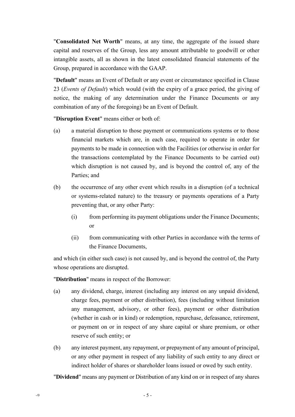 -/0 - 5 - "Consolidated Net Worth" means, at any time, the aggregate of the issued share capital and reserves of the Group, less any amount attributable to goodwill or other intangible assets, all as shown in the latest consolidated financial statements of the Group, prepared in accordance with the GAAP. "Default" means an Event of Default or any event or circumstance specified in Clause 23 (Events of Default) which would (with the expiry of a grace period, the giving of notice, the making of any determination under the Finance Documents or any combination of any of the foregoing) be an Event of Default. "Disruption Event" means either or both of: (a) a material disruption to those payment or communications systems or to those financial markets which are, in each case, required to operate in order for payments to be made in connection with the Facilities (or otherwise in order for the transactions contemplated by the Finance Documents to be carried out) which disruption is not caused by, and is beyond the control of, any of the Parties; and (b) the occurrence of any other event which results in a disruption (of a technical or systems-related nature) to the treasury or payments operations of a Party preventing that, or any other Party: (i) from performing its payment obligations under the Finance Documents; or (ii) from communicating with other Parties in accordance with the terms of the Finance Documents, and which (in either such case) is not caused by, and is beyond the control of, the Party whose operations are disrupted. "Distribution" means in respect of the Borrower: (a) any dividend, charge, interest (including any interest on any unpaid dividend, charge fees, payment or other distribution), fees (including without limitation any management, advisory, or other fees), payment or other distribution (whether in cash or in kind) or redemption, repurchase, defeasance, retirement, or payment on or in respect of any share capital or share premium, or other reserve of such entity; or (b) any interest payment, any repayment, or prepayment of any amount of principal, or any other payment in respect of any liability of such entity to any direct or indirect holder of shares or shareholder loans issued or owed by such entity. "Dividend" means any payment or Distribution of any kind on or in respect of any shares